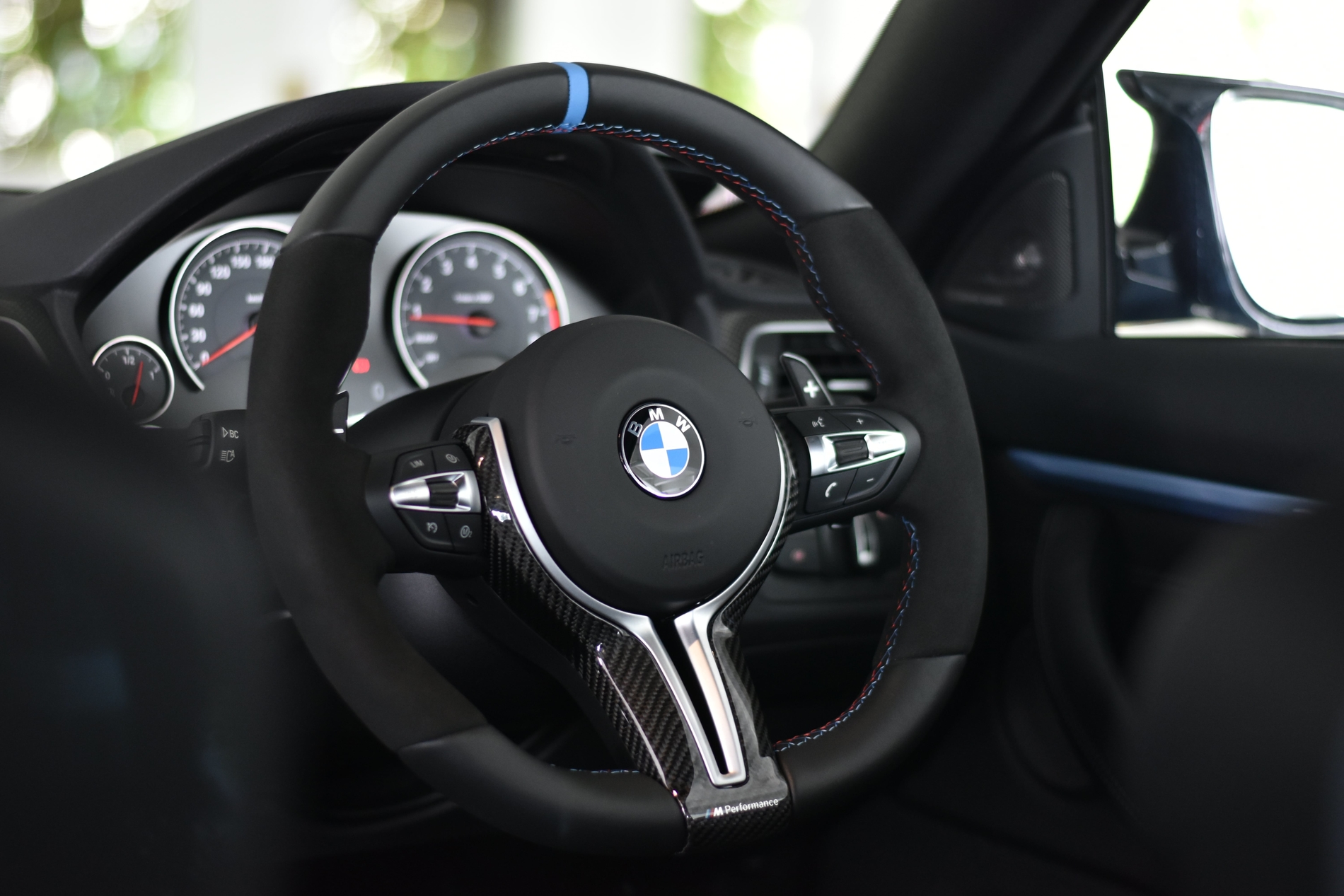 Inside, it gets an M Performance steering wheel, with carbon fiber trim, and some carbon dash trim with a strip of trim painted in body color. Other than that, the cabin is pretty standard M4.