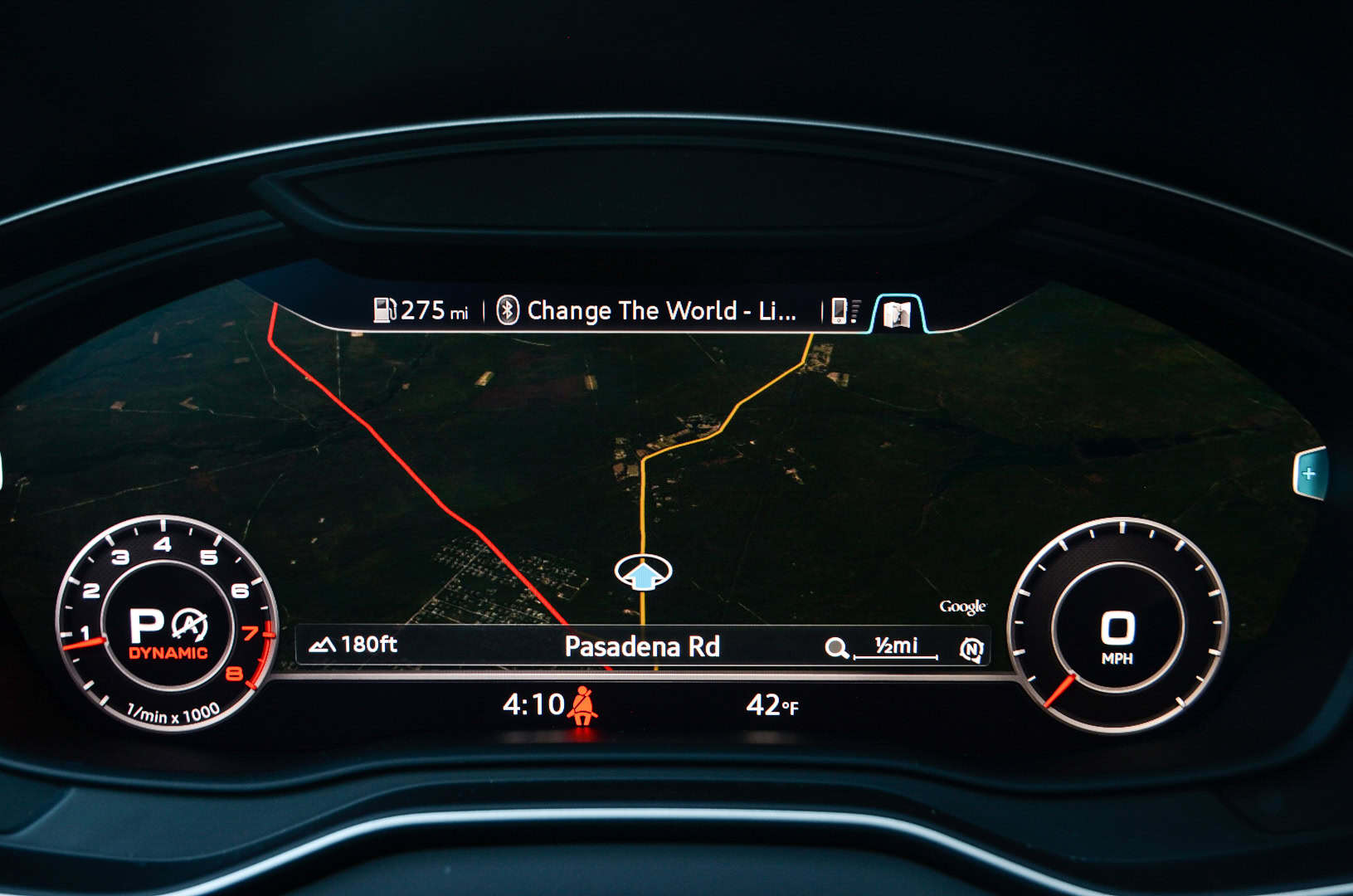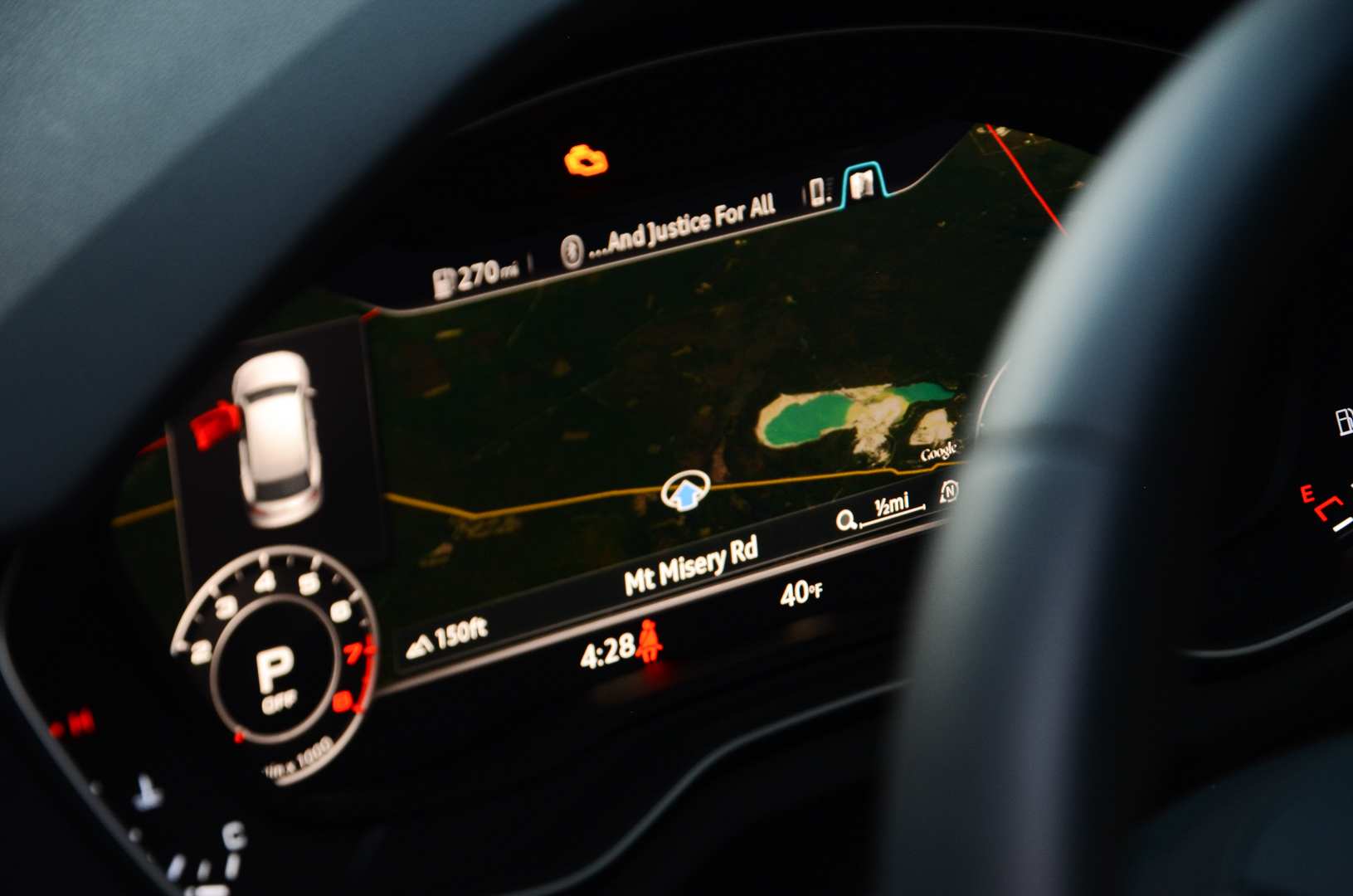 Which leads me to the Virtual Cockpit, Audi’s now-famous digital gauge cluster. It’s superb to use and is easily the best digital instrument panel in the business. You can switch from two different views, one with more traditional looking dials and a small screen in between or two really small dials and a massive screen in between. It can also display full-screen Google Earth imagery of where you are and your navigation information. It’s incredibly intuitive and easy to use, as you never have to avert your eyes from the road anymore than you would to normally check your speed. With the optional head-up display, it’s even easier.