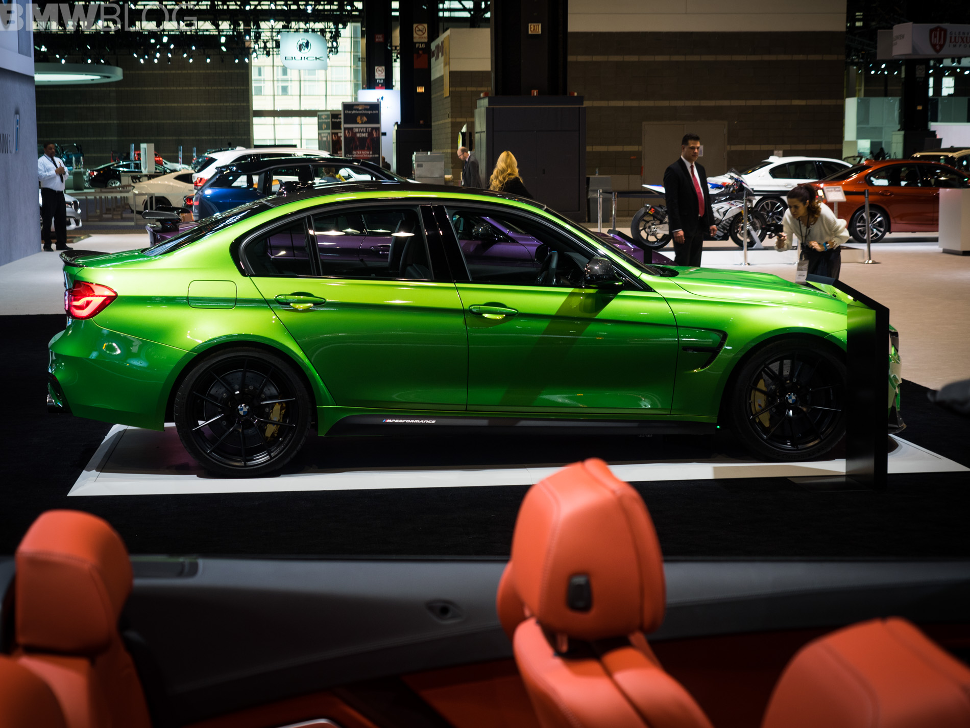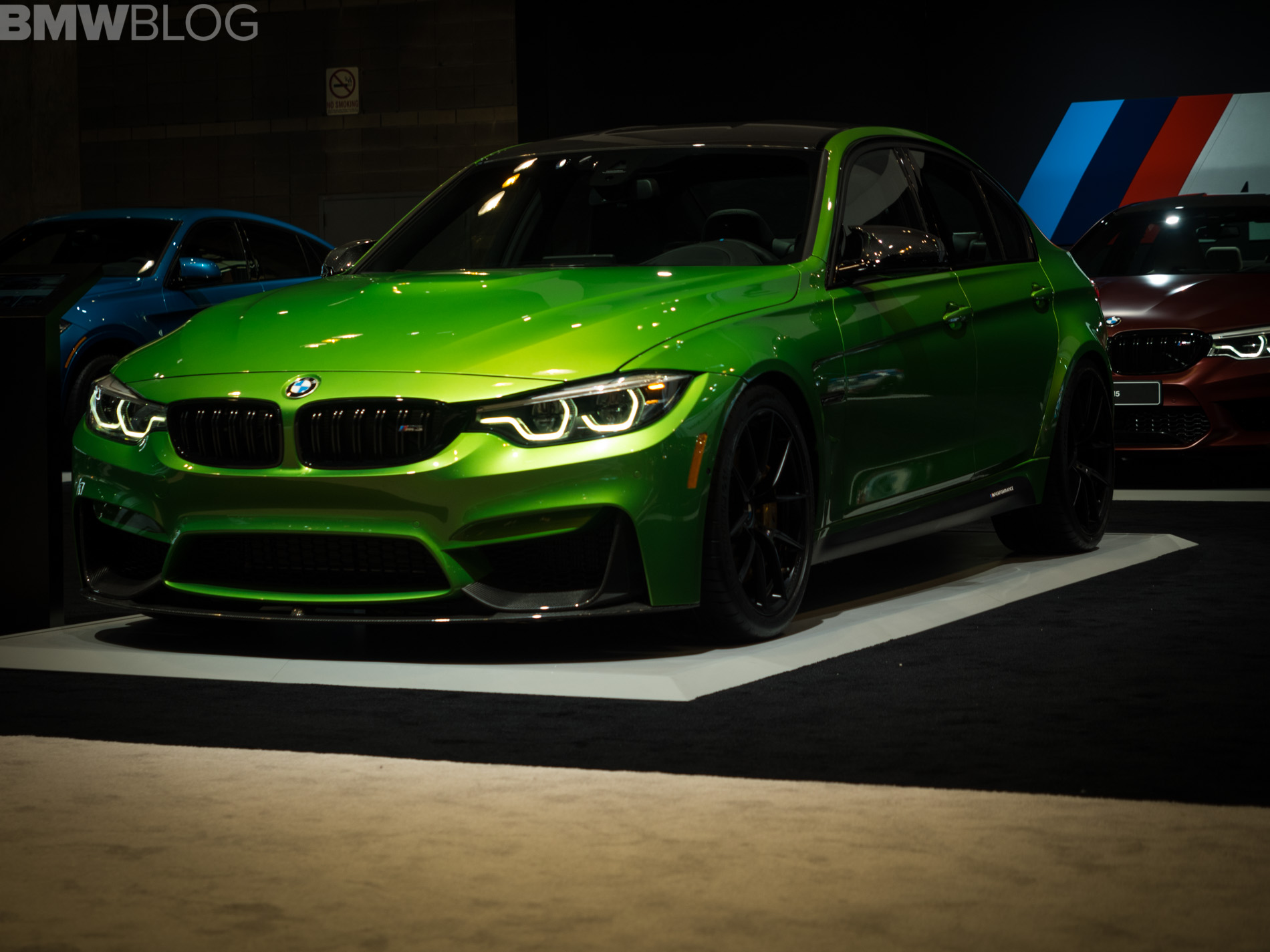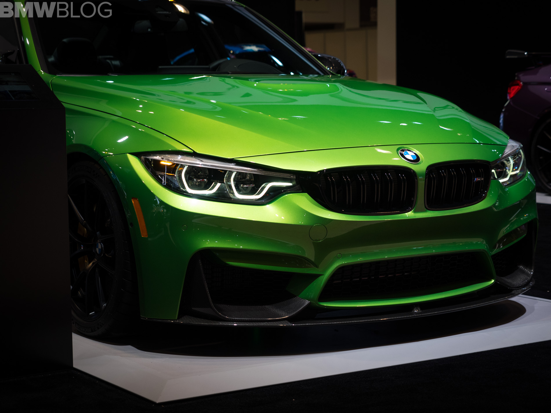 One other skittle in the colorful BMW stand at the 2018 Chicago Auto Show is a BMW M3 Sedan painted in Java Green. The sporty sedan not only stands out with its muscular looks and broad shoulders, but also with its assortment of aero parts provided by the M Performance division.