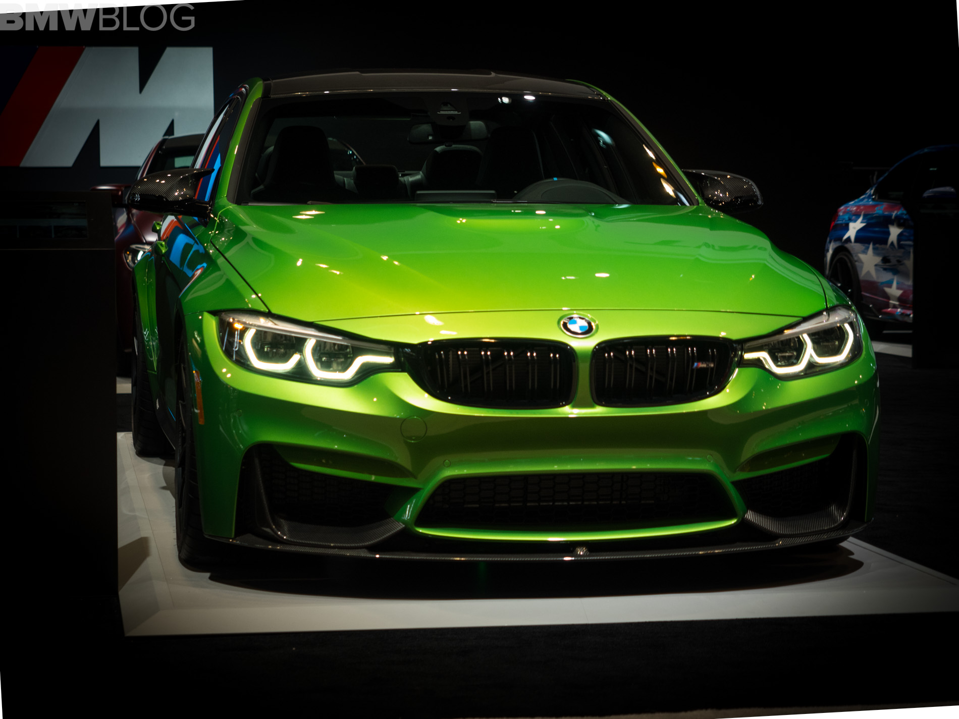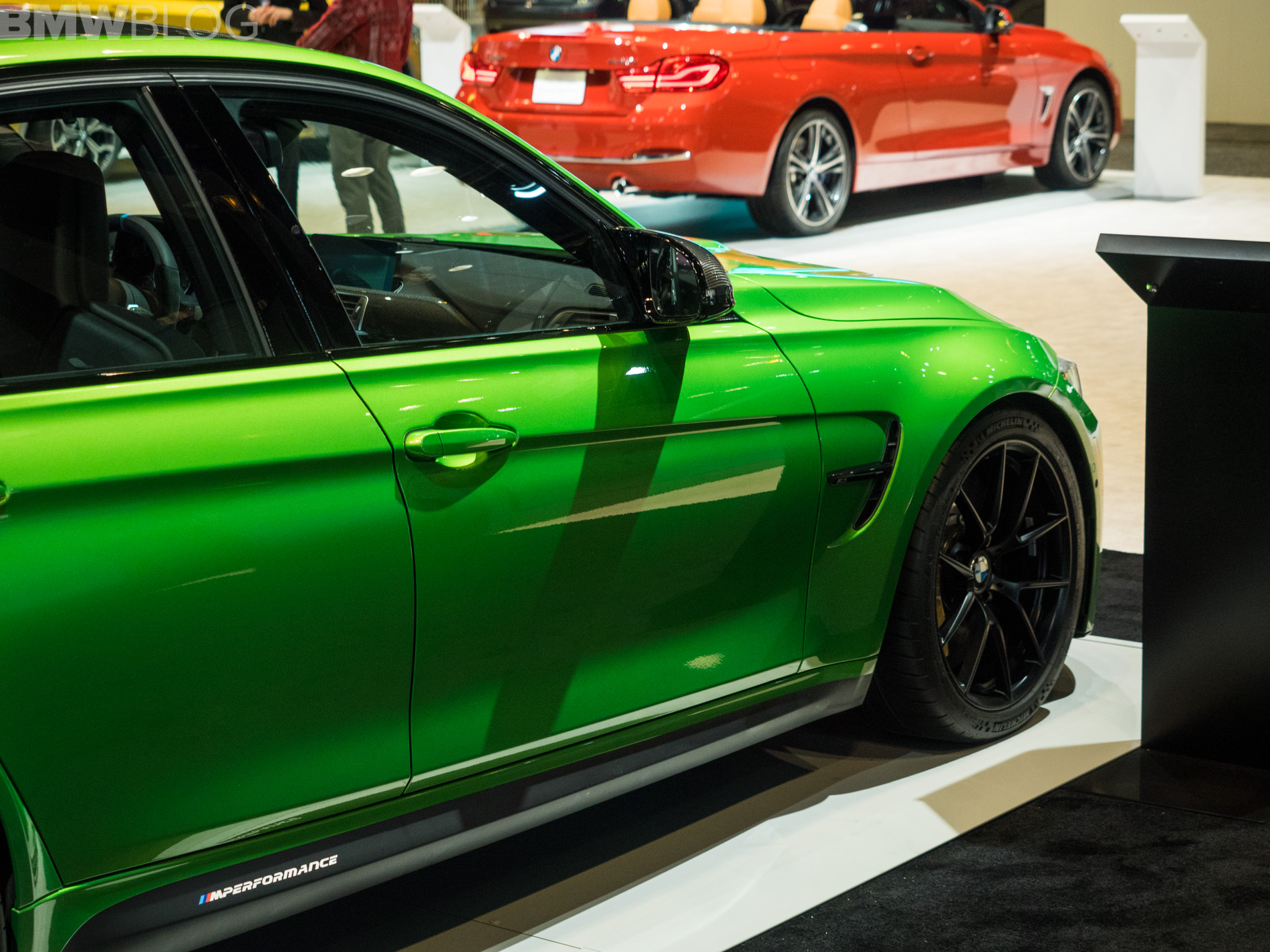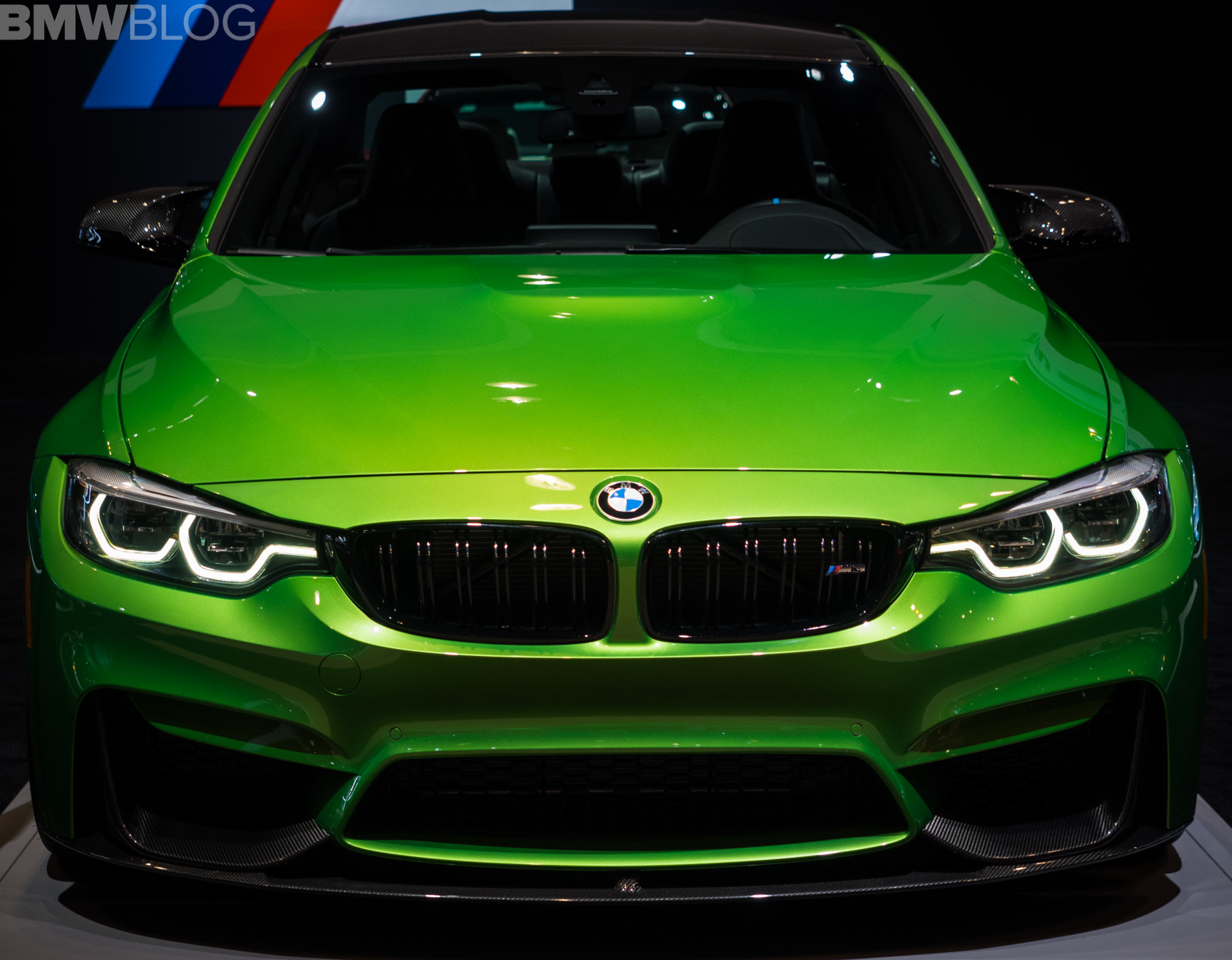 One other skittle in the colorful BMW stand at the 2018 Chicago Auto Show is a BMW M3 Sedan painted in Java Green. The sporty sedan not only stands out with its muscular looks and broad shoulders, but also with its assortment of aero parts provided by the M Performance division.