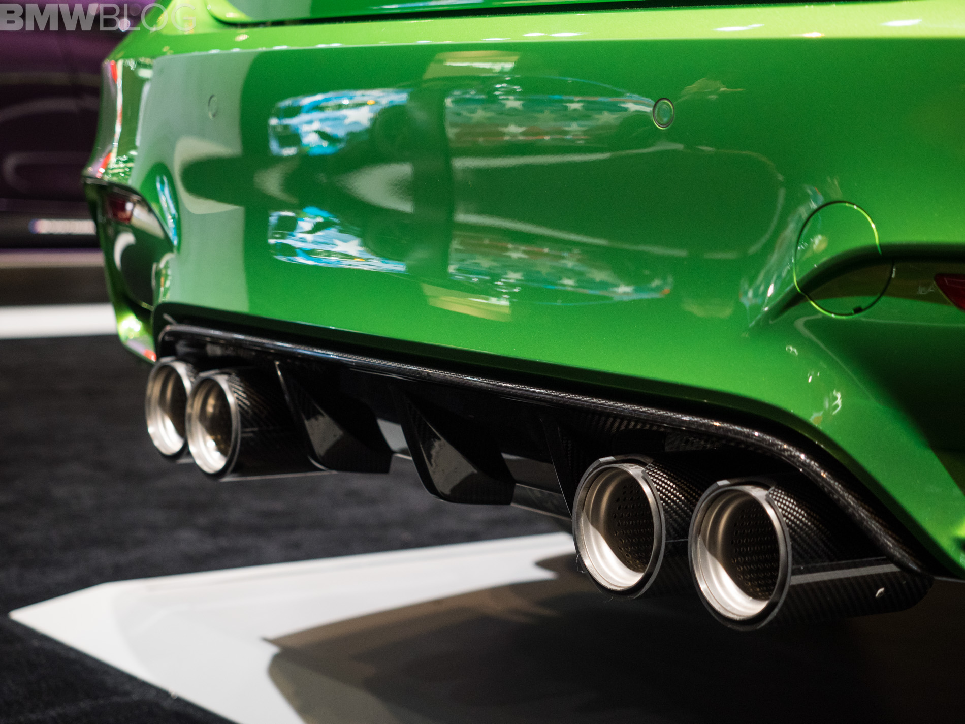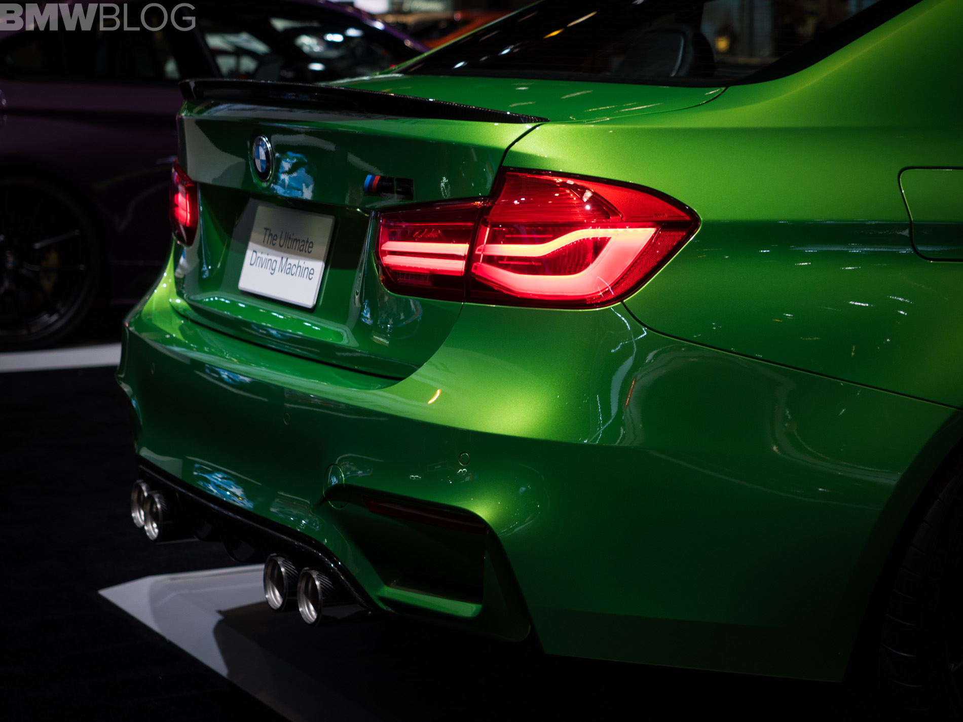 Just like its M4 Purple Silk brother, the Java Green M3 makes us of carbon fiber to enhance its looks. At the front, a splitter gives the bumper an edge, while the blacked out kidney grilles provide great contrast to the flashy shade of green. The air curtains also feature carbon fiber inserts which help bring out “the fangs” of the M3.