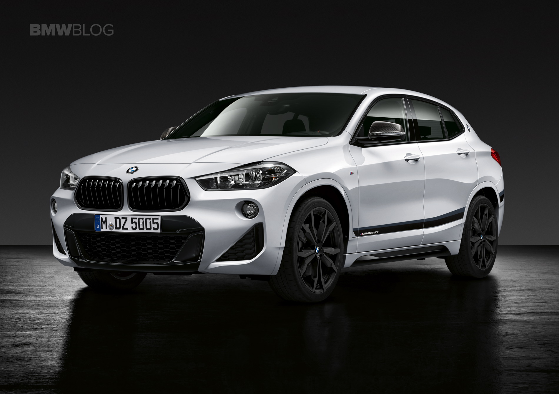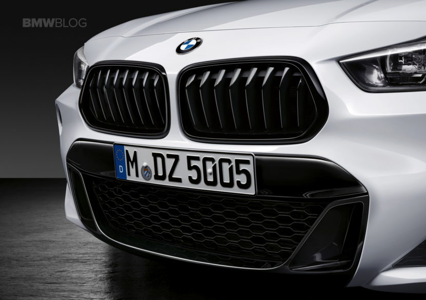 M Performance front radiator grilles in high-gloss black are available for the BMW X2, along with exterior mirror caps in carbon fiber and the lower section of the front bumper painted now in black.
