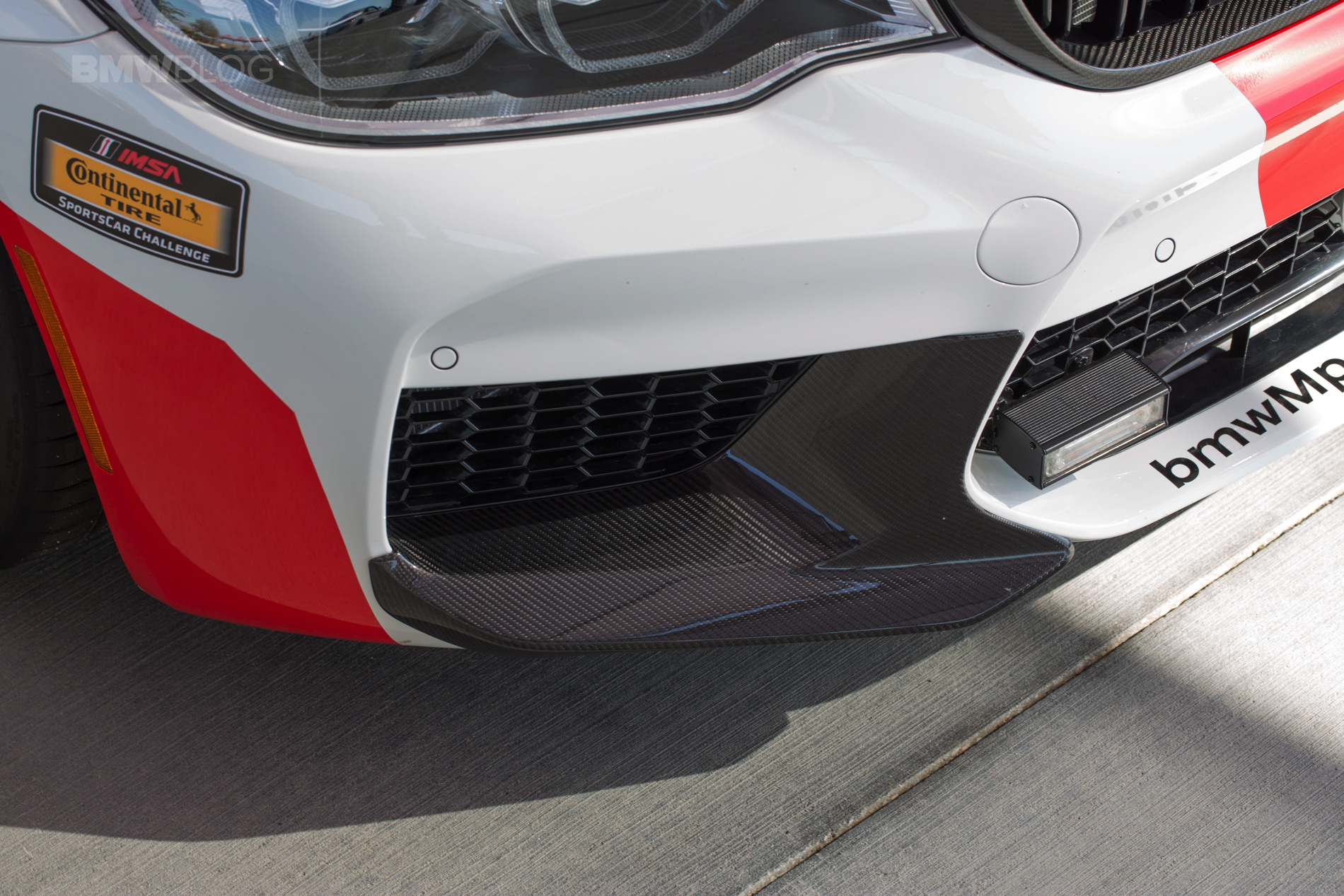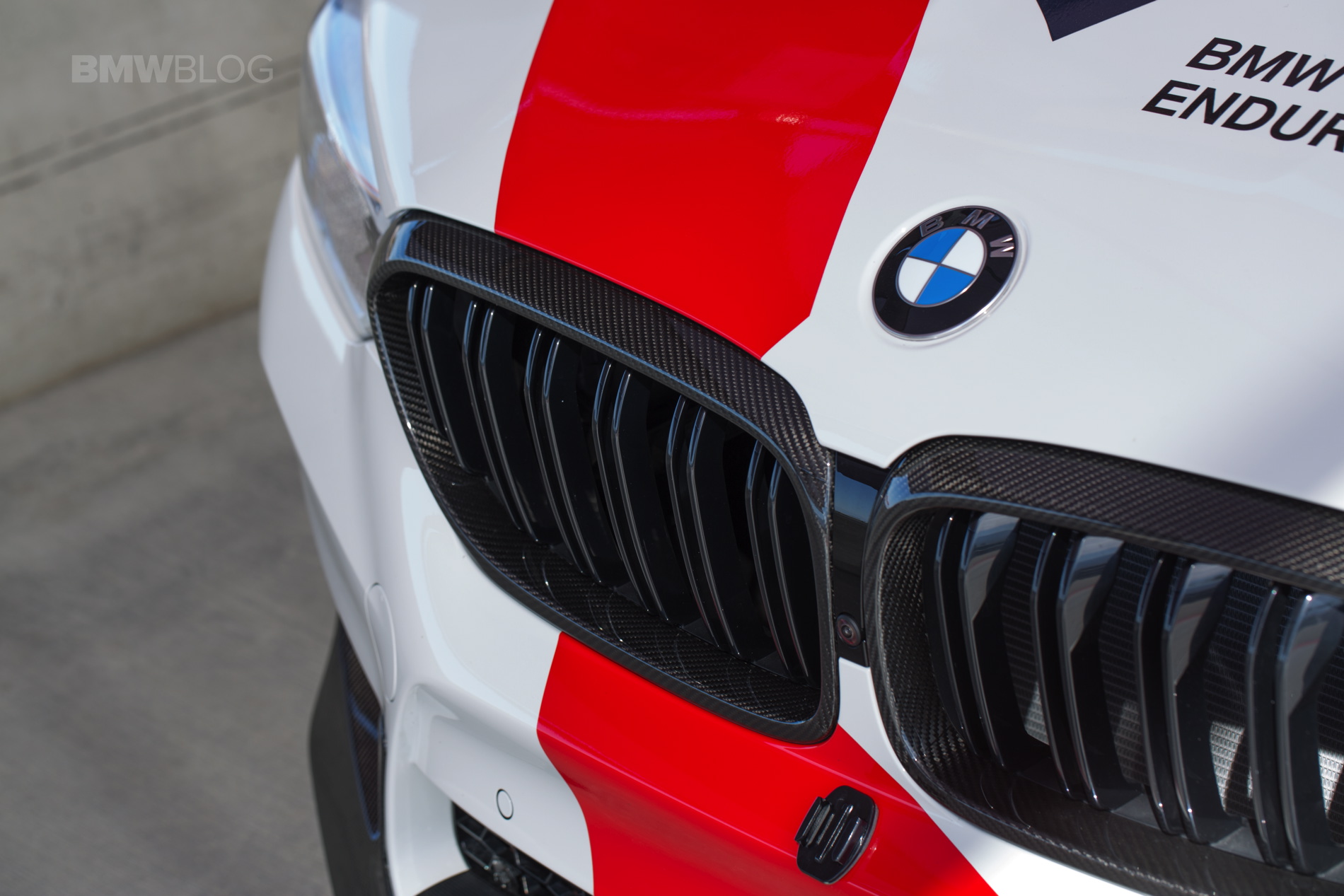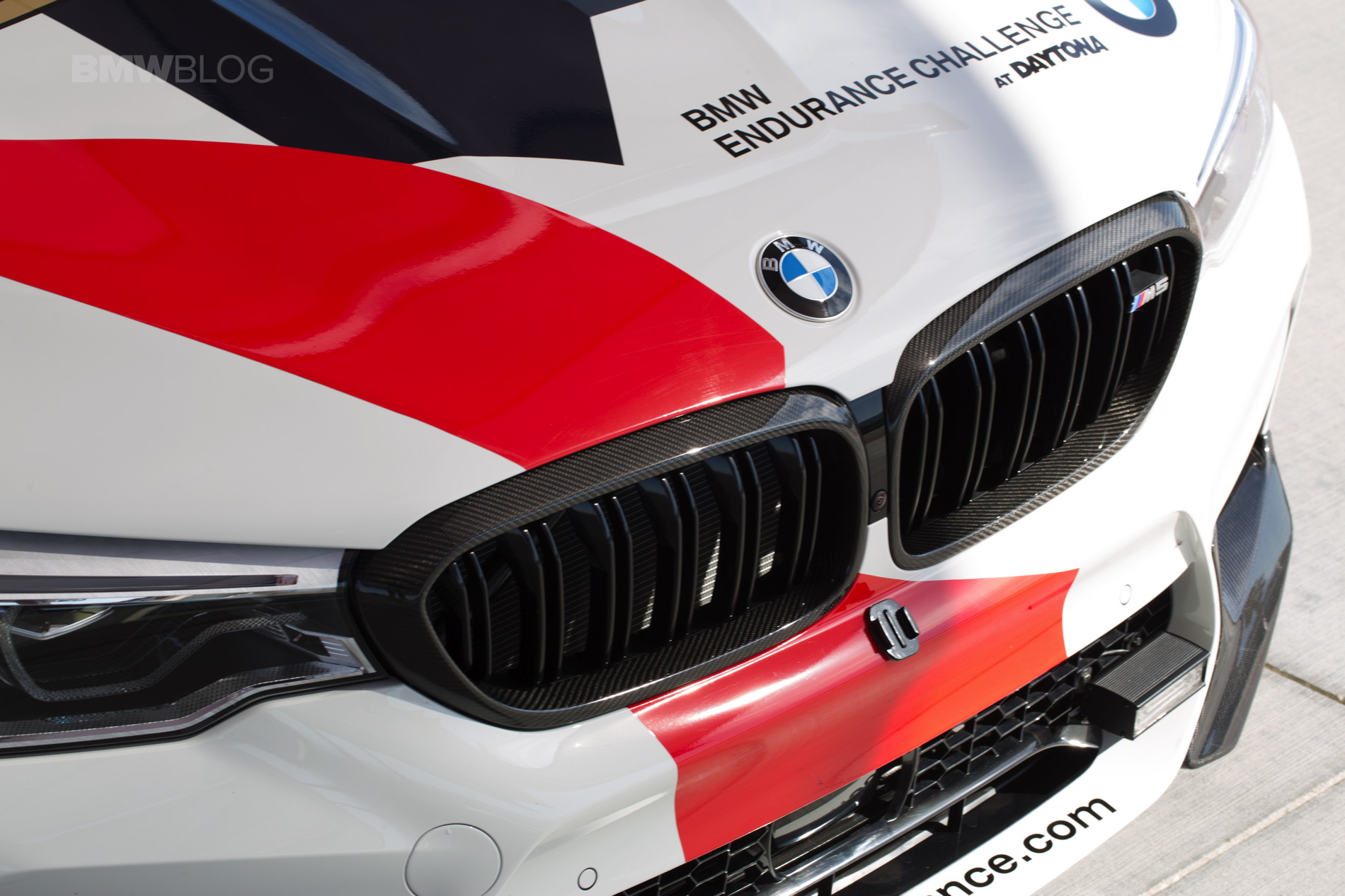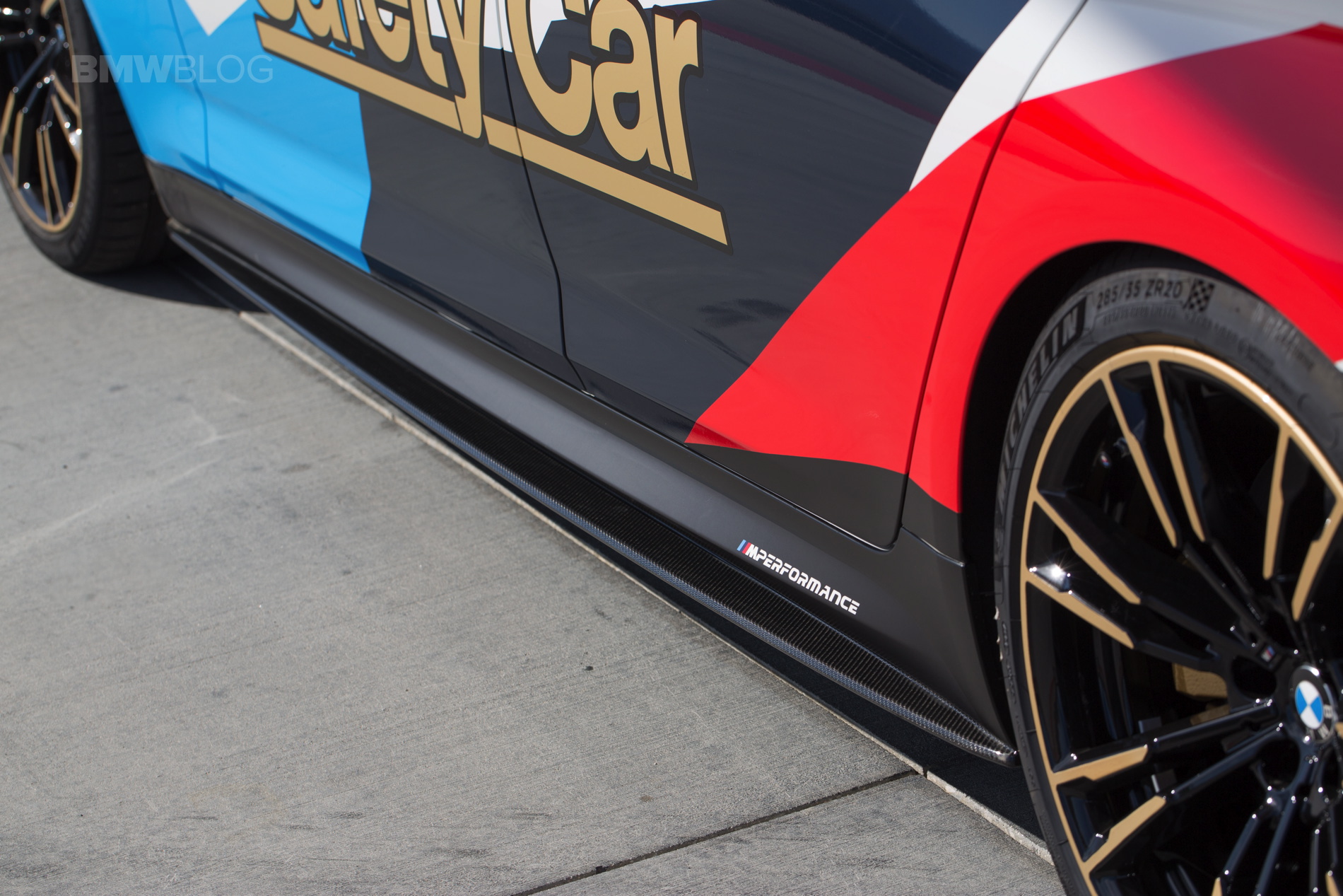 Much of the installed carbon-fiber parts come from the tuning program of BMW M Performance and is also available for the production vehicle, but elements such as the front splitter or the hood closures are reserved for the safety car. Bucket seats from the M4 GTS, the light bar on the roof and the blue LED front flashers are also not available for the street legal BMW M5 F90.