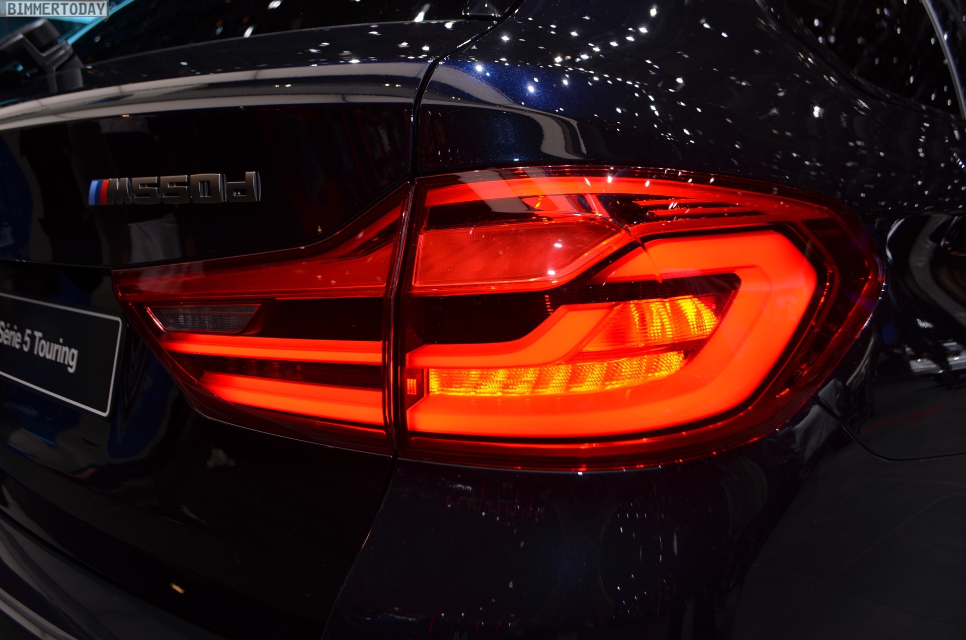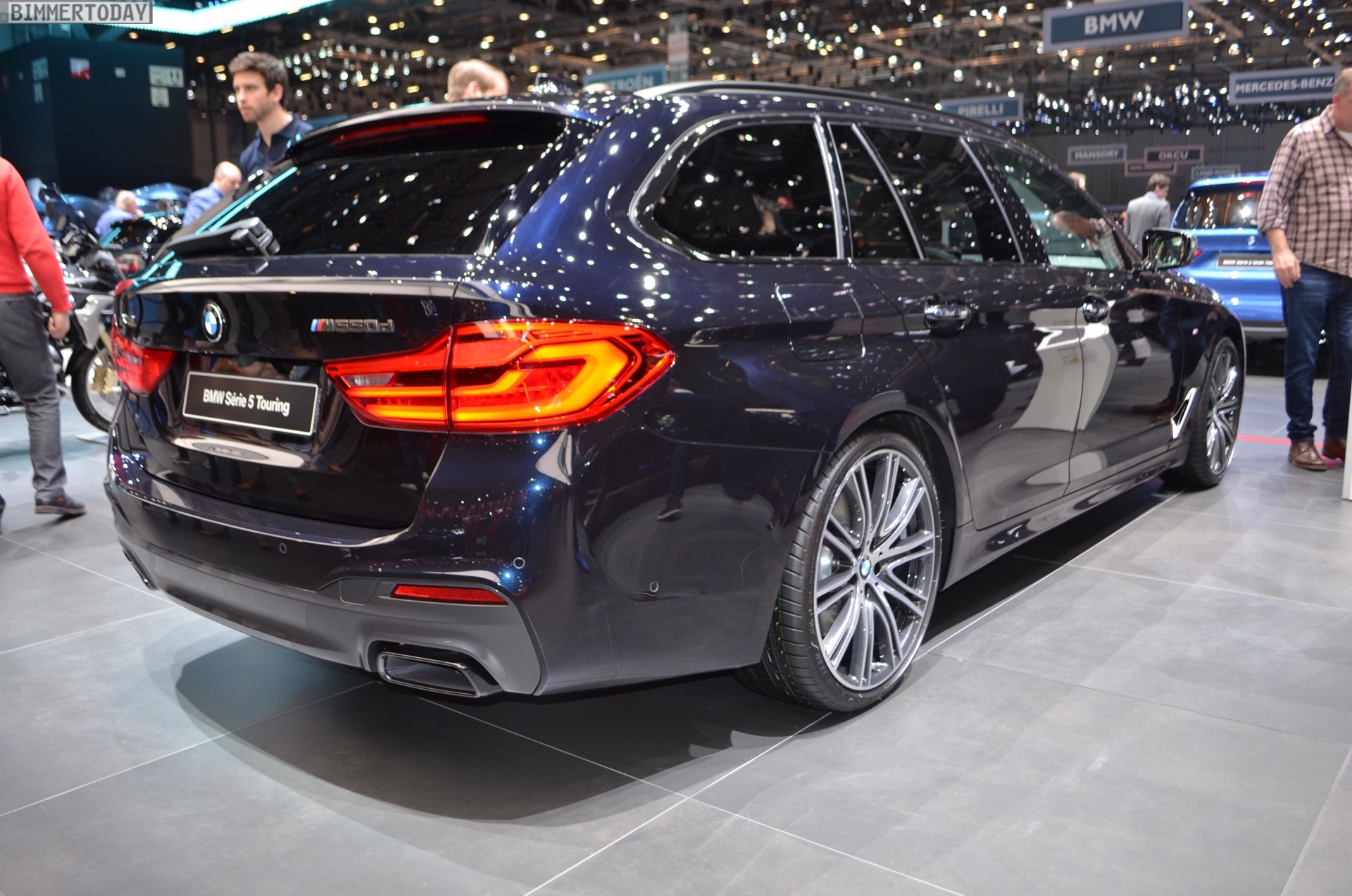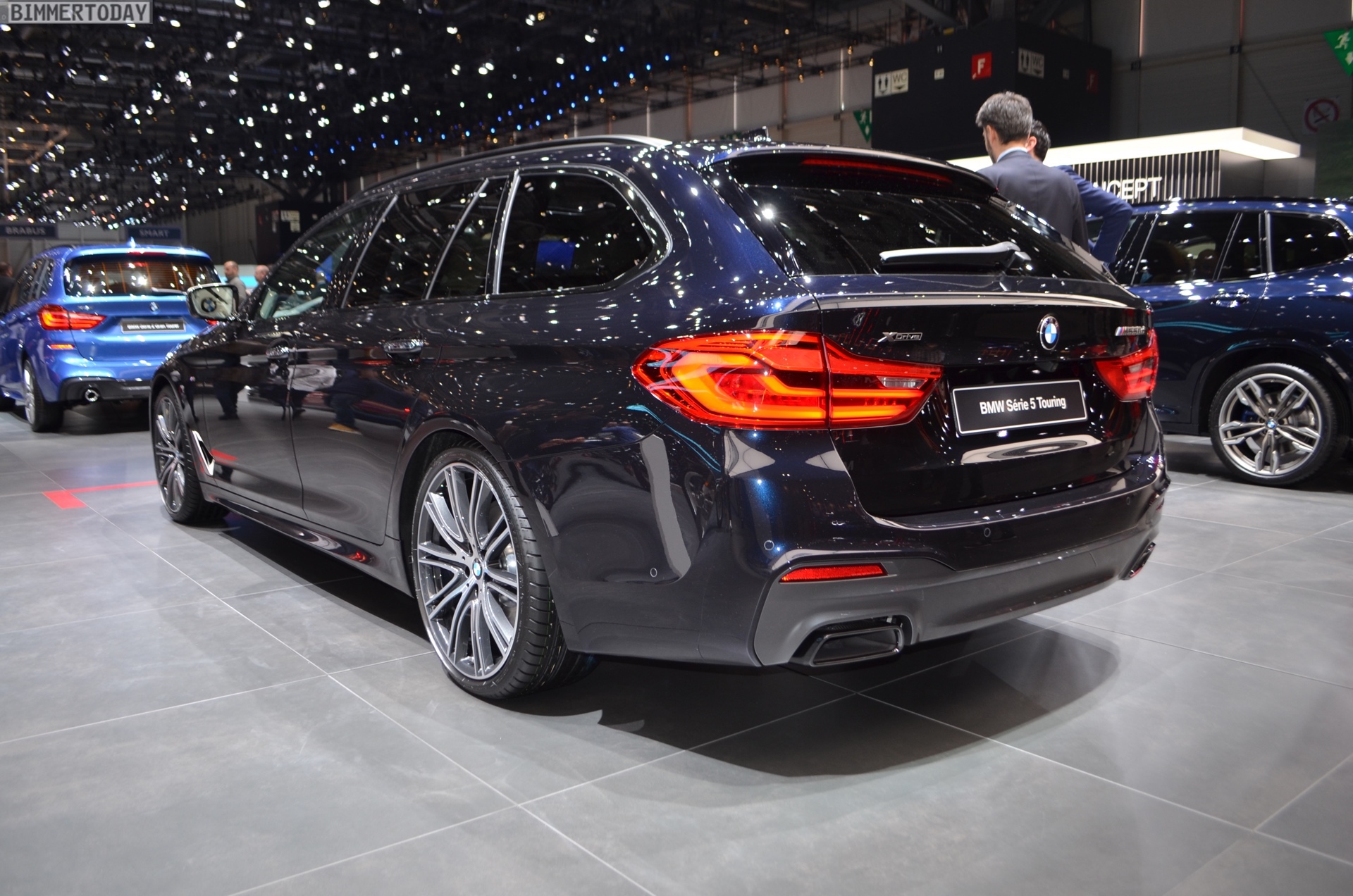 The BMW M550d Touring G31 presented in Geneva shines in the Individual finish Azurite Black Metallic and therefore shows that black does not always have to be black. 20-inch light-alloy wheels in the Individual Design V-spoke 759 and of course the sporty elements of the BMW M Performance Automobiles in the typical Cerium Gray make the exterior even more special.
