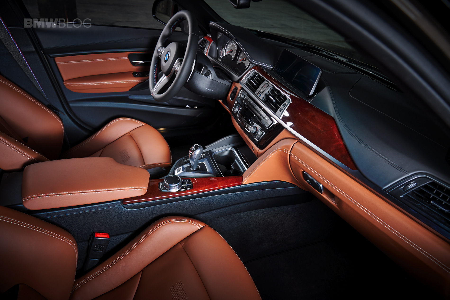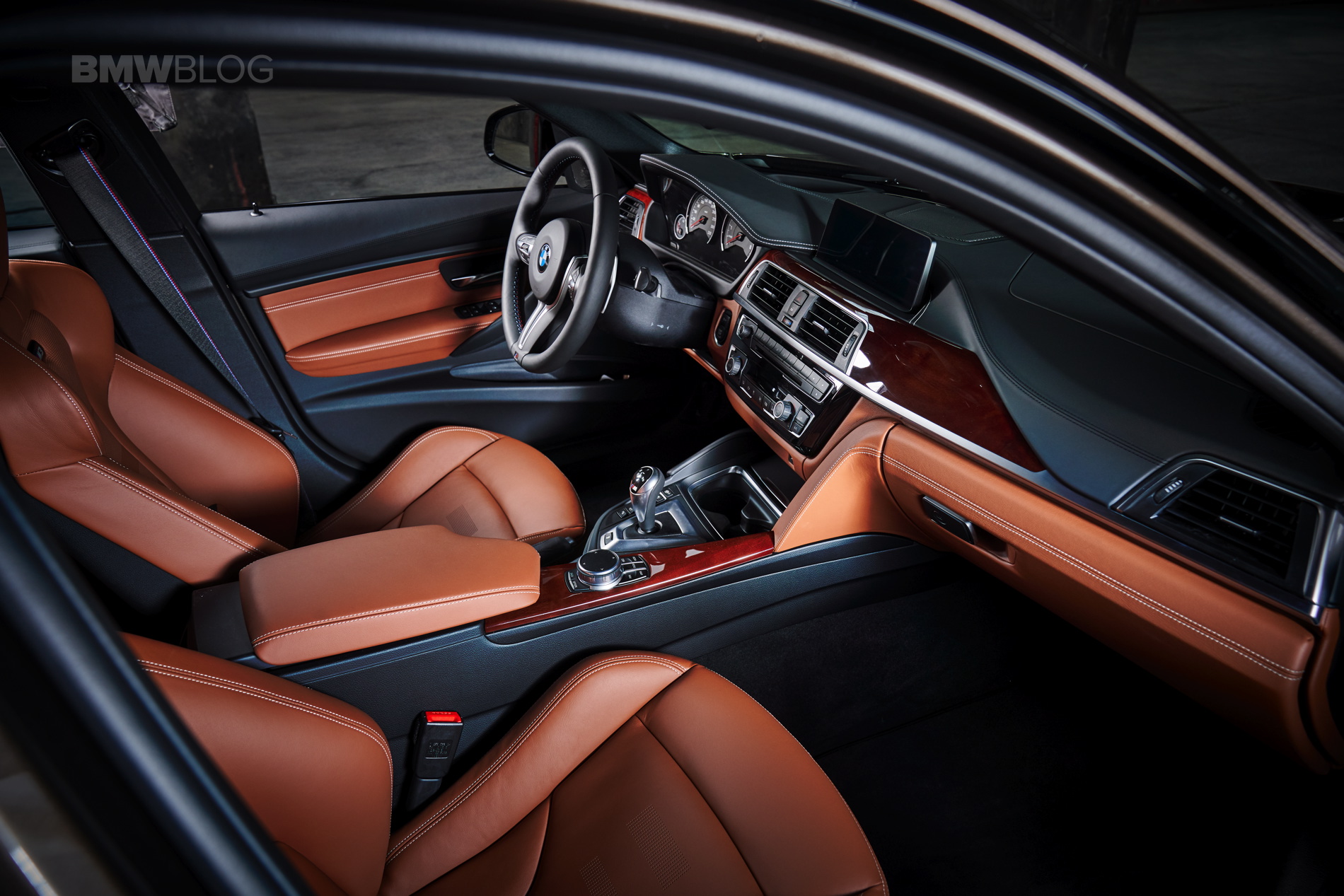 Where this specific M3 really stands out is inside. Most BMW M3 owners choose a very sporty interior color combination. It’s usually black, red or grey with either carbon fiber or aluminum trim. However, this M3 is a bit more luxurious, with Amaro Brown leather that looks really quite nice. White contrast stitching helps it pop a bit and breaks up the quite vibrant brown. What I also like is that, rather that going for carbon fiber trim, this M3 has the Dark Red Sycamore trim option. I don’t know about you, but I’m sick of carbon fiber in cars. It’s essentially fancy plastic and the only materials that should be in a car interior of this caliber are leather, metal or wood. So give me aluminum trim or wood. You can keep your fancy plastic.