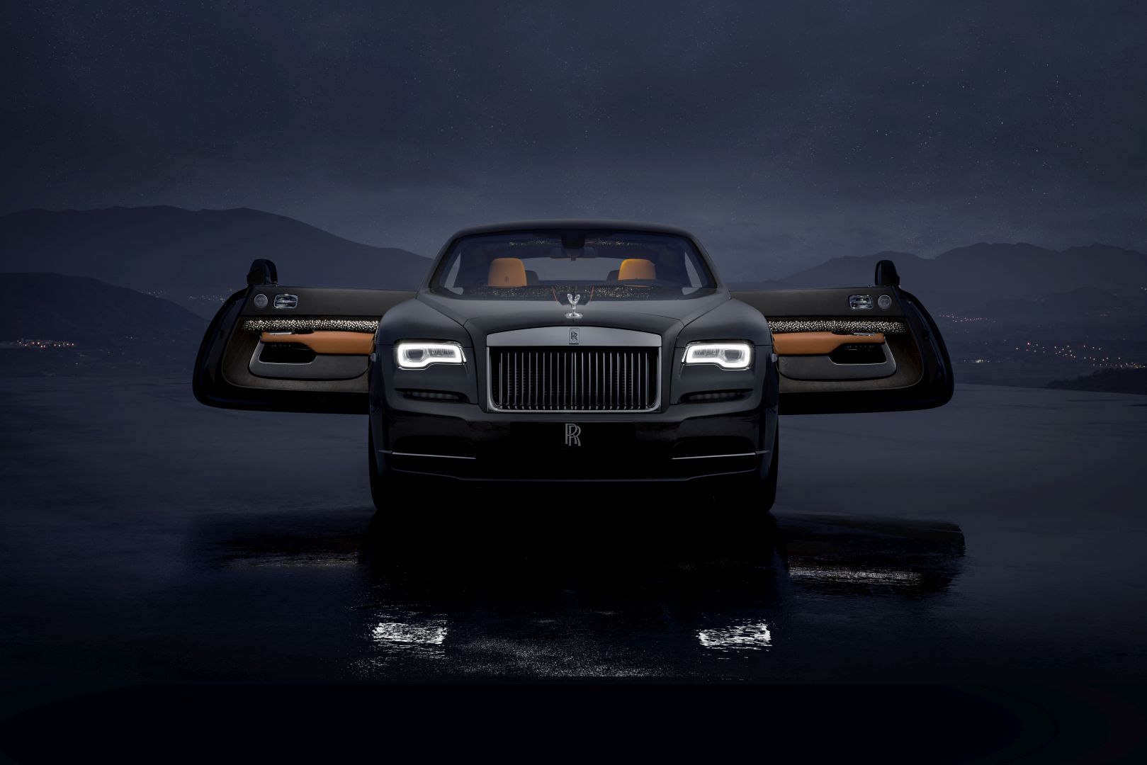 On opening the coach doors, one is met by a statement of modern luxury, as light flows from the front into the rear passenger compartment. The Collection’s defining feature, Tudor Oak wood, sourced from the forests of the Czech Republic, selected for its depth of color and the density of the grain structure, is for the first time, illuminated. The light of 176 LEDs permeates through an intricately perforated design in the unique Tudor Oak veneer meant to mimic the trailing light of a shooting star. Linked to the controls of the starlight headliner, the cabin’s veneer surrounds Wraith’s occupants in an ambient glow of light.
