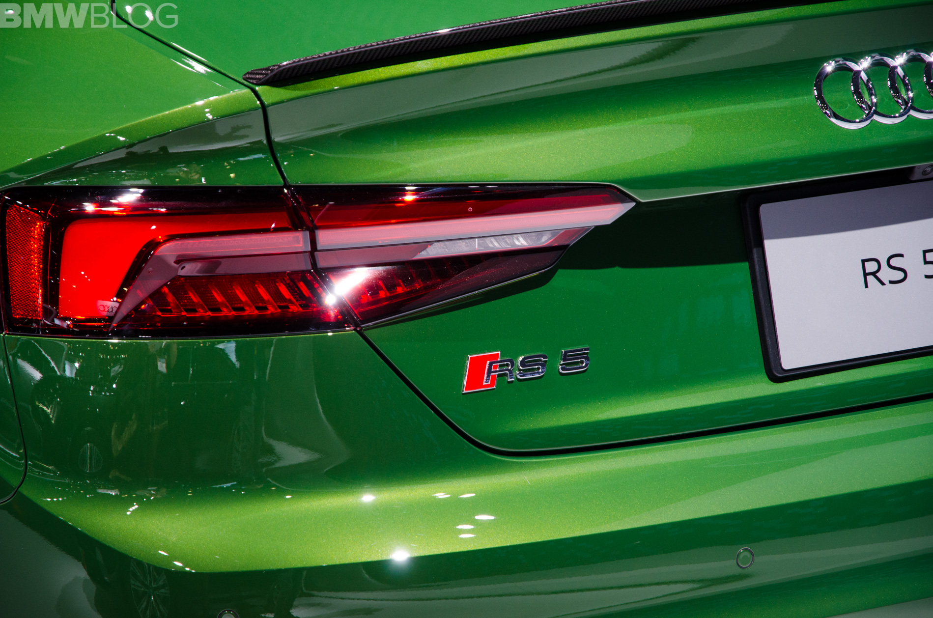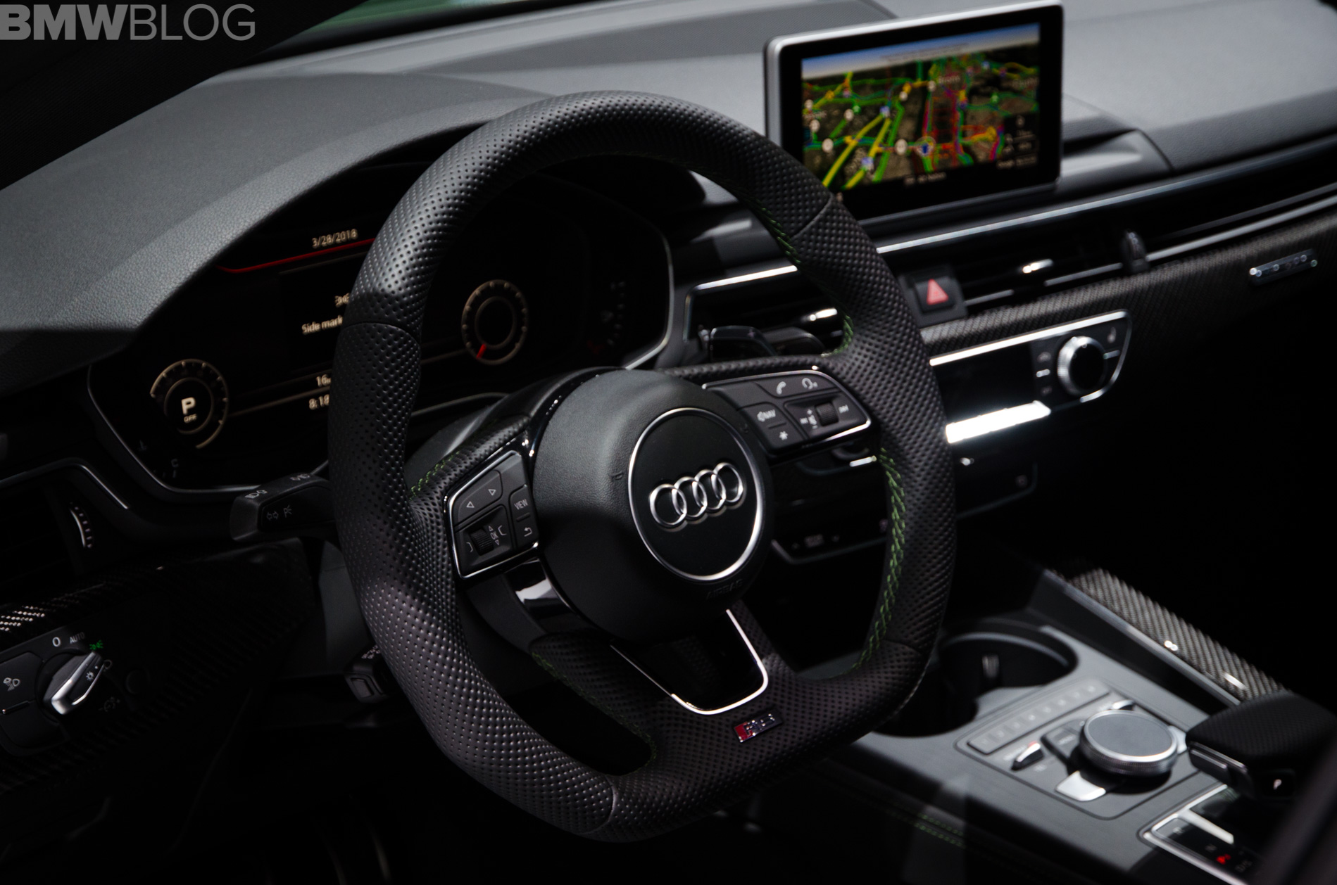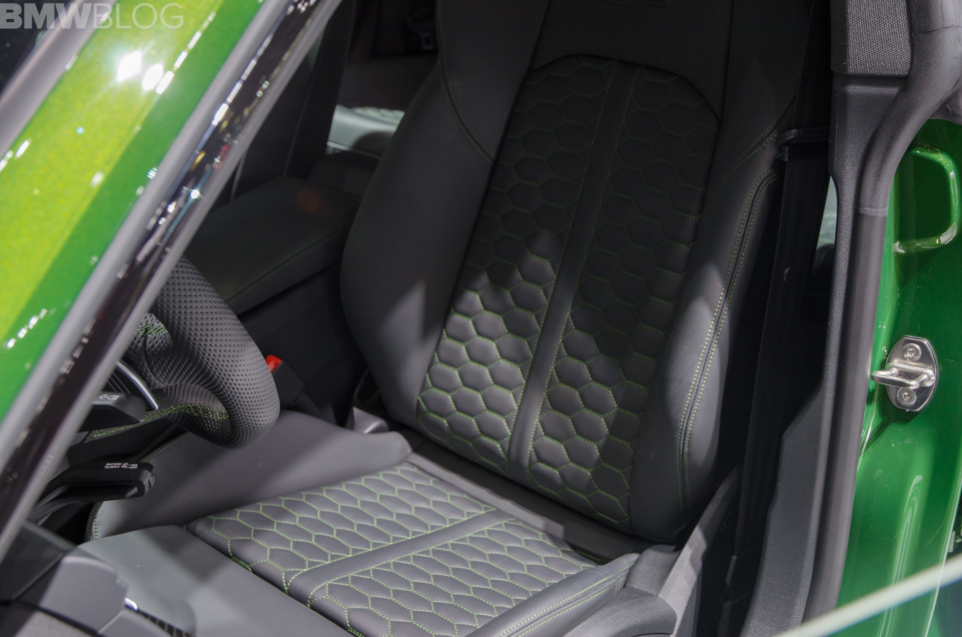 On the inside, it’s exactly the same as the RS5 Coupe, except for the additional rear seats and added cargo space. However, this specific car has green contrast stitching to match its exterior color and it’s really quite cool.
