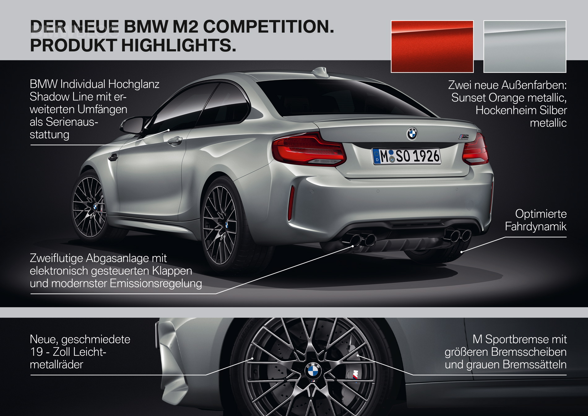 From the outside, the new BMW M2 Competition is certainly more aggressive than the standard car. It gets new Kidney Grilles, which are slightly larger and sharper-edged. These new grilles are not only more aggressive looking but they’re more functional, as they provide more airflow to help keep things nice and chilly. Those Kidney Grilles are also finished in Shadowline Gloss Black, as well are all the badges, much like the M4 Competition Package, making it seem more menacing. A new color is also available, Hockenheim Silver Metallic, along with Sunset Orange, which was previously available on other BMWs but new to the M2.