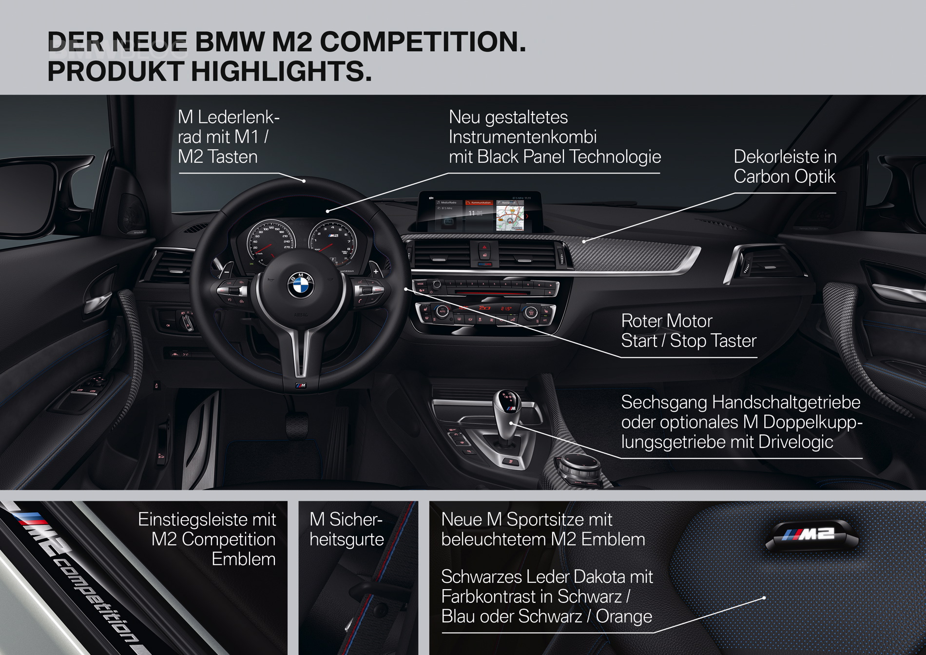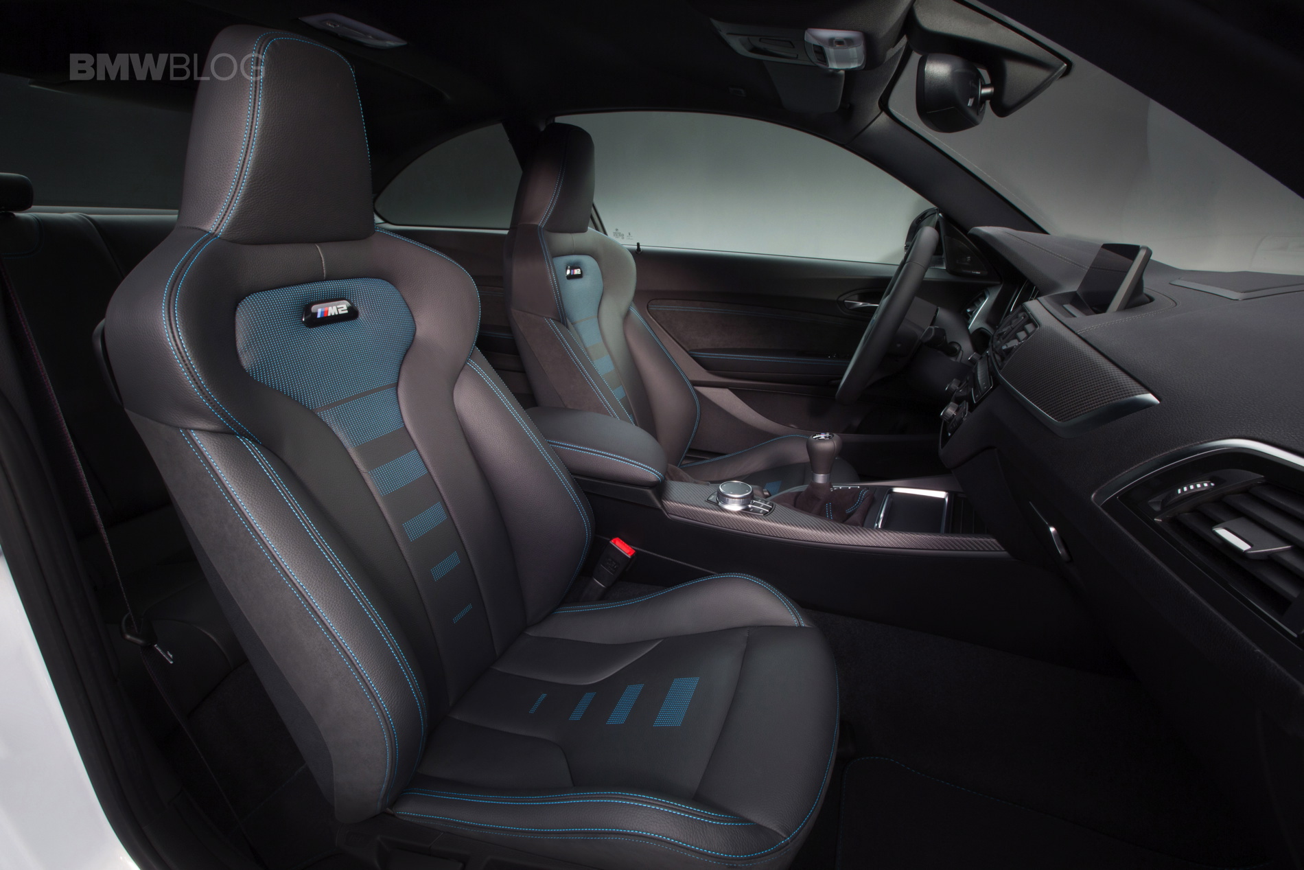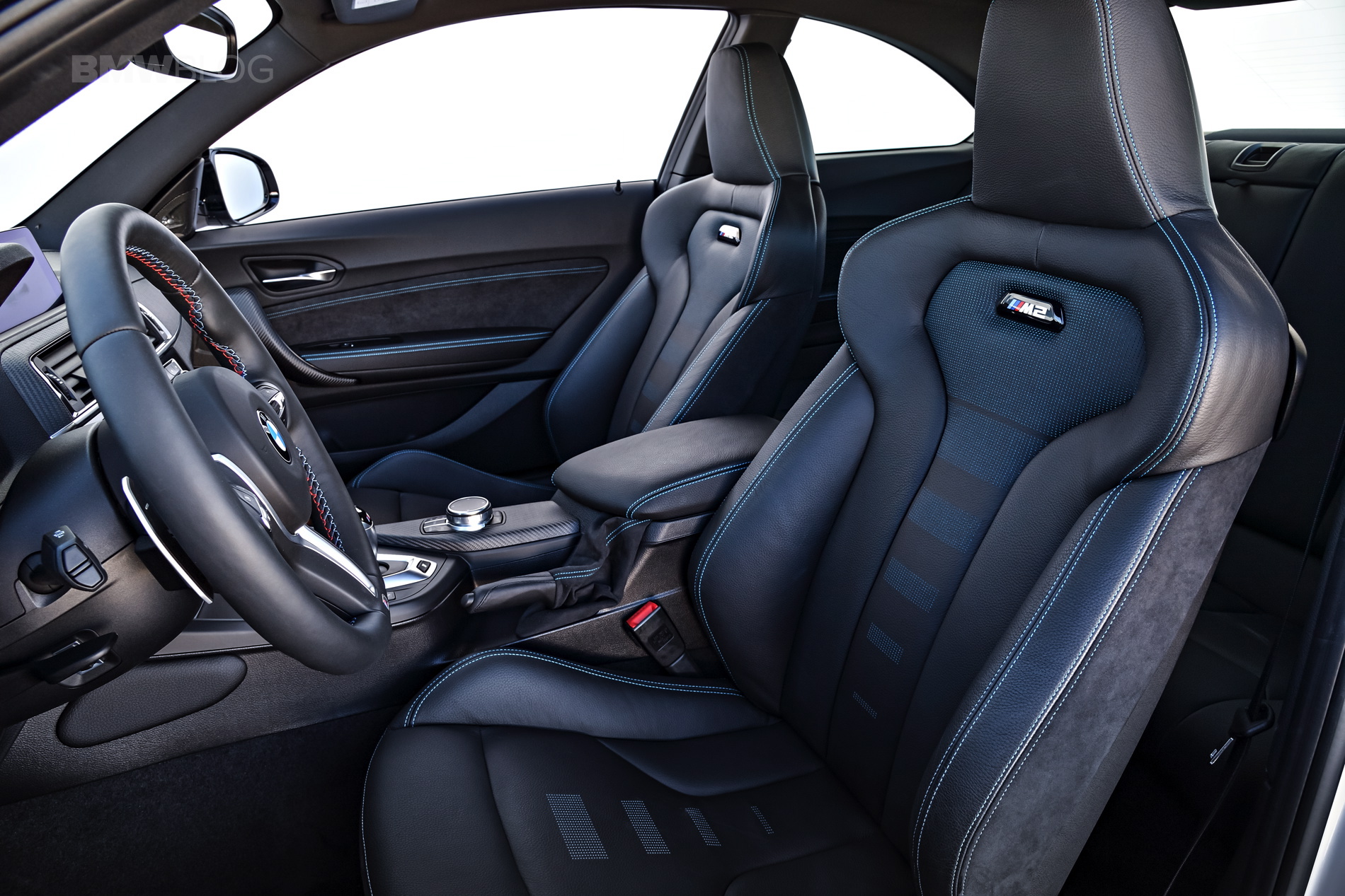 Inside, the BMW M2 gets new seats, which are slightly modified M4 seats, if we’re honest. They’re the same basic seats as you’ll find in an M4 but with some blue or orange accents, depending on your choice, and illuminated “M2” logos in the seatbacks. It also gets a red “Start/Stop” button. You can tell BMW spared no expense there…
