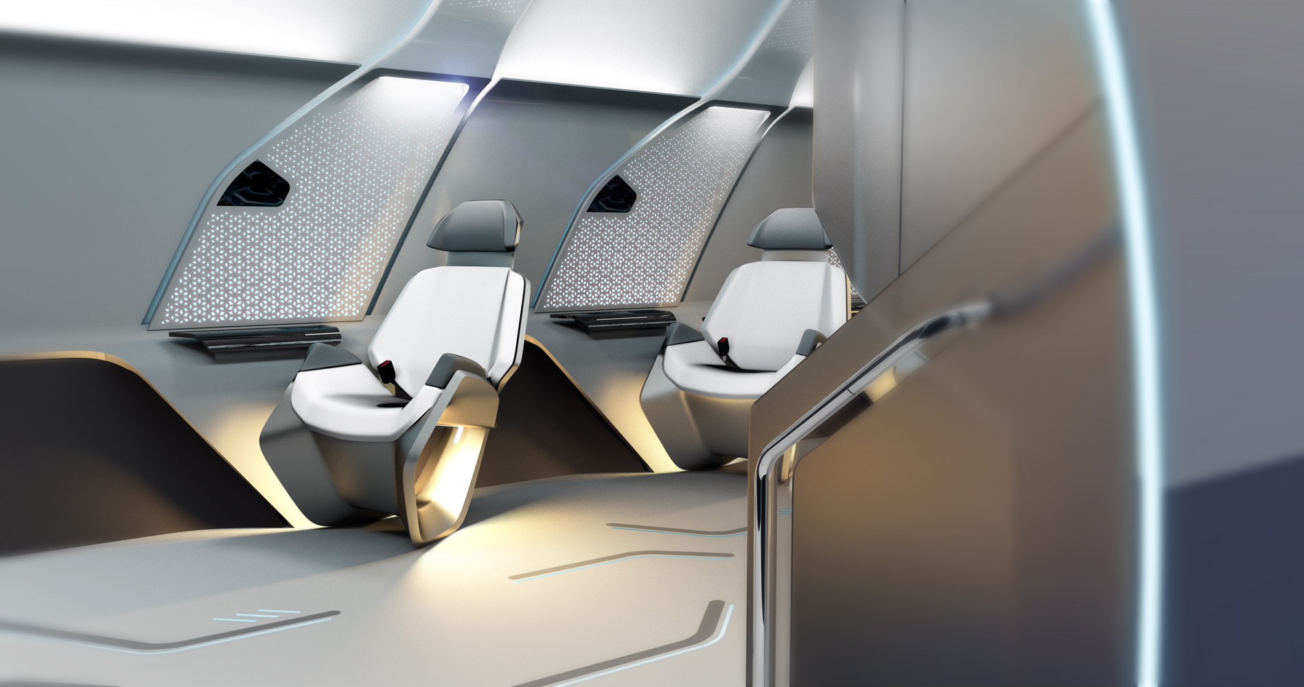The design concept suggested several ways of achieving this, through multidirectional and personally-controlled light, digital displays, and premium comfort – creating a sense of individualized space for each passenger. In first class, for example, adjustable leather seats feature touchscreens for personal settings for light brightness and color, allowing passengers to shift the light from blue to pink to set the mood. The seats include integrated heating and cooling. Passengers could enjoy personalized entertainment through built-in displays. In this way, the concept could create a more sophisticated and user-centered spatial experience that transcends the typical utilitarian notion of public transportation. Floor lighting is also aesthetically used to double as wayfinding.