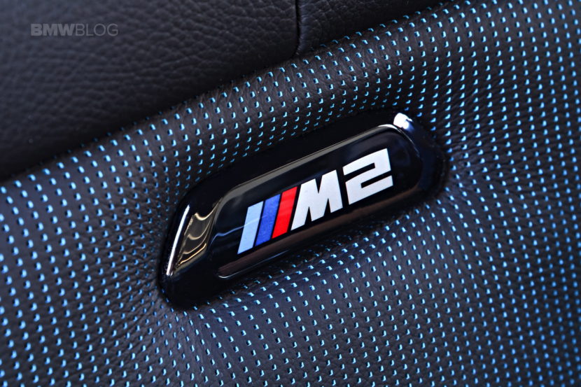 Inside, the BMW M2 gets new M Sport seats (standard in the US and optional in other markets), with some blue or orange accents, depending on your choice, and illuminated “M2” logos in the seatbacks. It also gets a red “Start/Stop” button. The M leather steering wheel, an M footrest and knee pad on the center console complete the M-tuned interior.