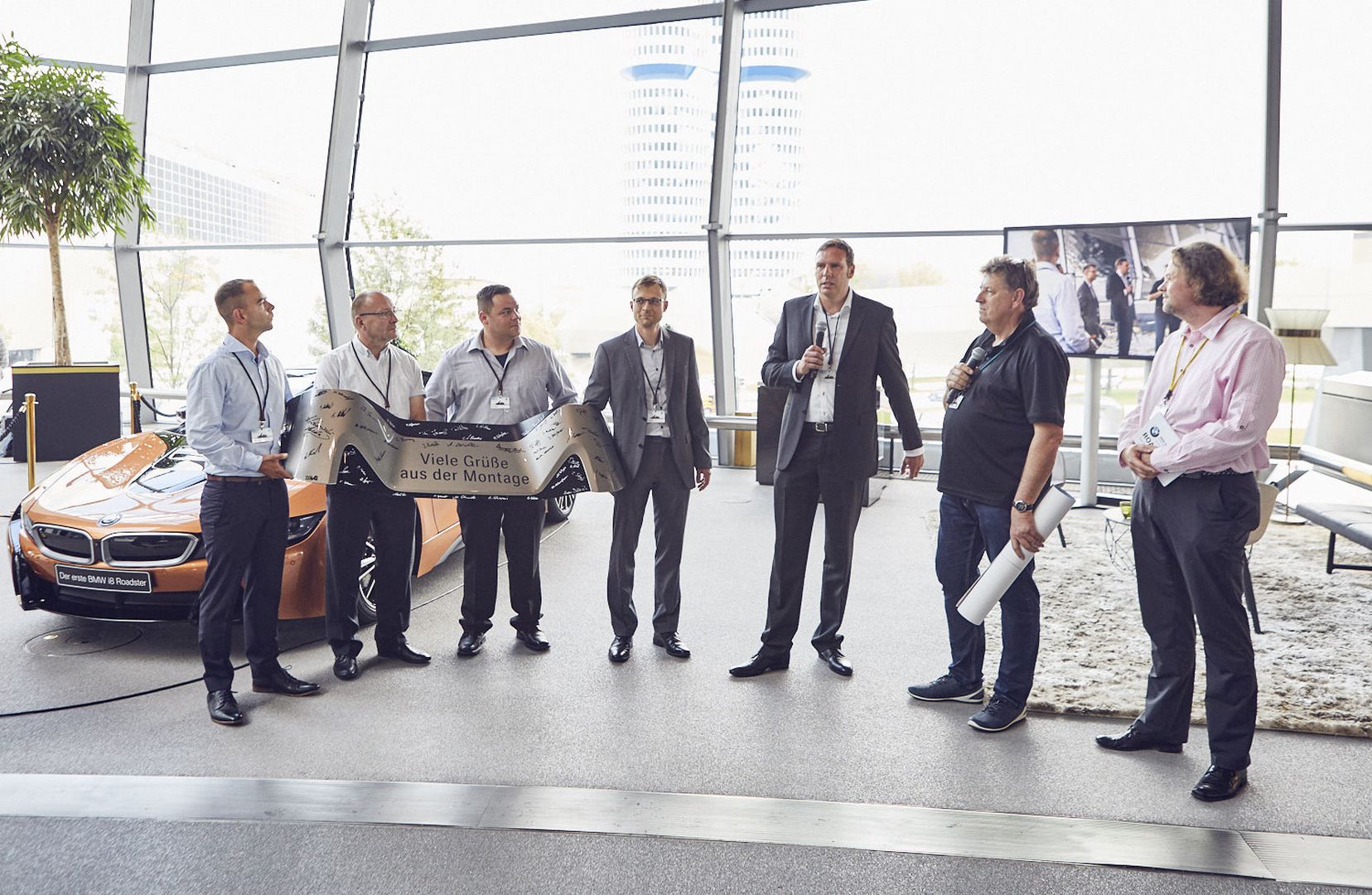 The first 18 BMW i8 Roadster models ever built were delivered yesterday to the BMW i8 Club in a special ceremony held inside the famous Welt Museum. All the cars feature a special plaque inside, mentioning their special character, and members of the BMW i8 Club were greeted at the event by none other than Peter van Binsbergen, head of Sales and Marketing BMW Germany who also handed them the keys.