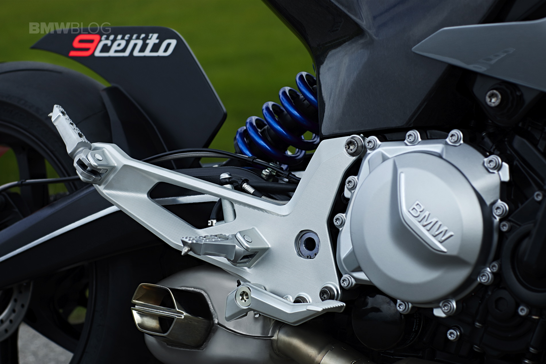 The BMW Motorrad Concept 9cento features basic sporty configuration with lots of volume near the front wheel and a short high rear promises riding fun and agile handling. The striking styling of the fairing, fuel tank and frame further highlights the focus on the direction of travel. Here, the three-dimensional modelling of the fuel tank area especially comes into its own as a result of the paint finish with reflective chrome effect. The hovering side panel is painted in Pure Metal Silver. On all aluminum parts such as the central tank cover, the rear carrier and the footrest holder, the milling is directed towards the front wheel. This finely grooved surface structure is only apparent on close inspection and has the effect of a topographical elevation relief.