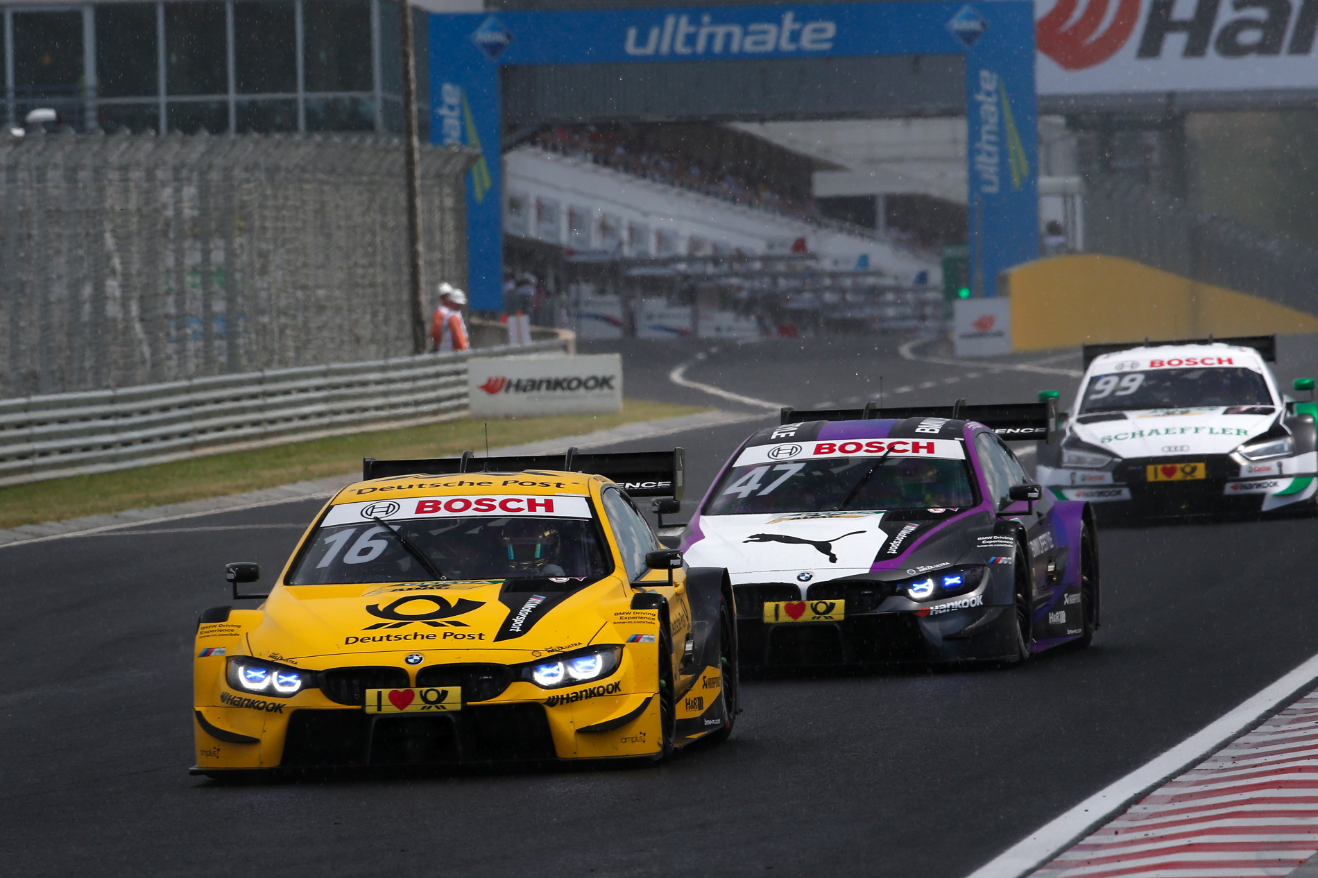 Seven laps in, the race stewards suspended the race after several incidents occurred in the pit lane during a shower. A number of cars coming in for their tyre change were unable to stop in time on the wet and extremely slippery concrete in front of the garages. Several people working in the pit lane were injured as the cars struggled to stop. Spengler’s BMW Bank M4 DTM was one of the cars that skidded too far, hitting a BMW Team RBM mechanic who, according to the team doctor, suffered slight bruising on his foot. He was already back working on Spengler’s car by the time the cars took their place on the grid for the re-start.