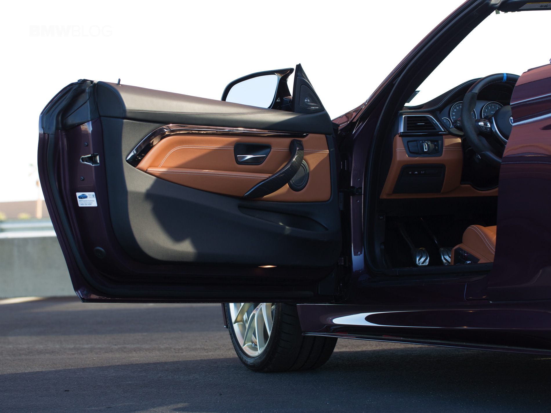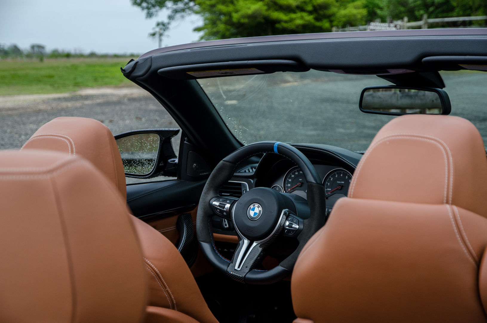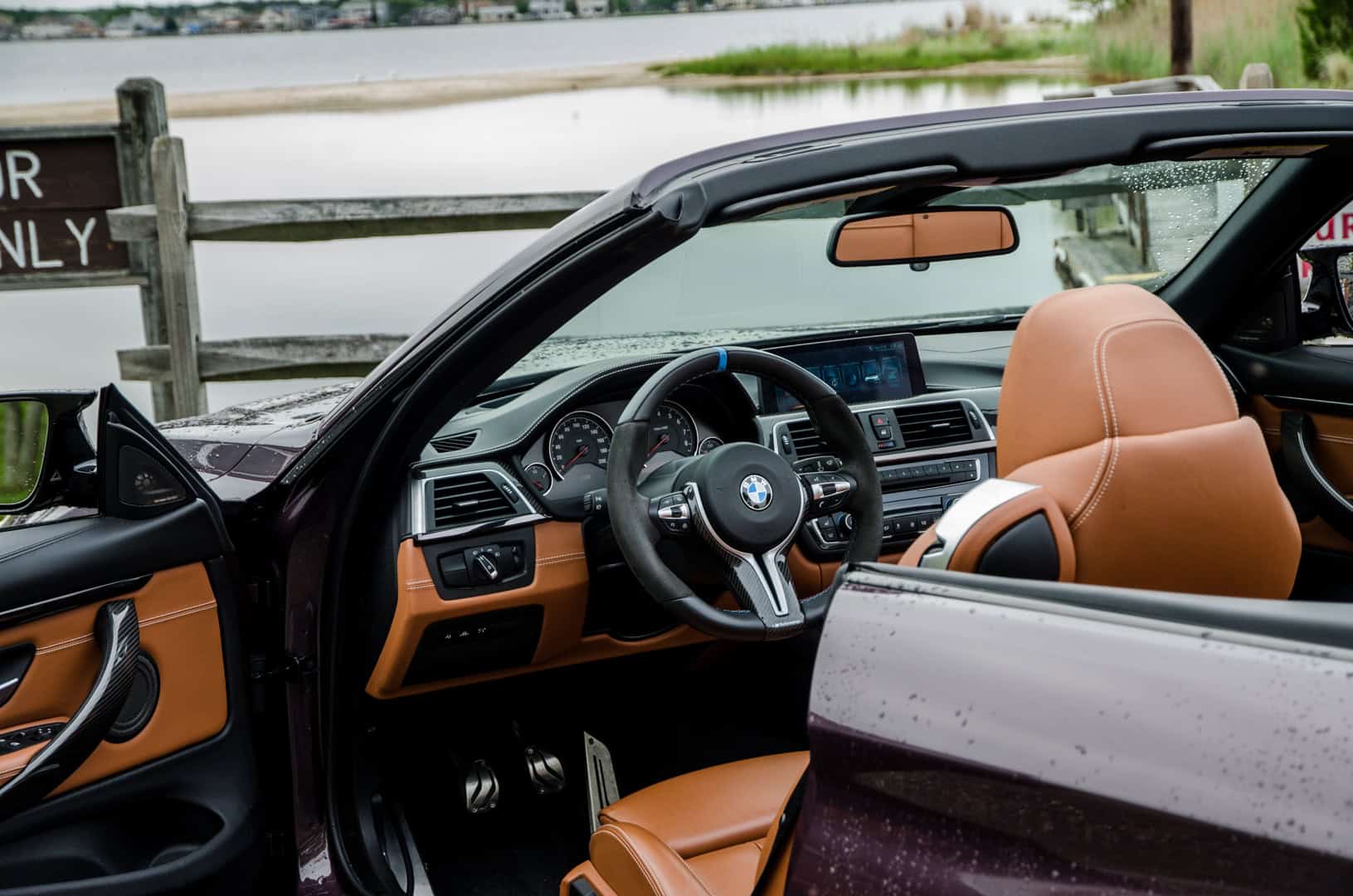 When I approached the M4, it was sitting outside of BMW M Performance’s HQ with its top down, ready to go. That was actually a bit of a problem because, holy hell, those seats get hot in the sun and shorts were a bad idea. Scorched thighs aside, though, I was ready to roll in a car that I’ve been waiting to drive for a long time. It looked fantastic, with the sunlight turning its subtle purple into a much more vibrant color. The carbon fiber mirrors, lower front lip and, more importantly, its gold wheels made it stand out even further.
