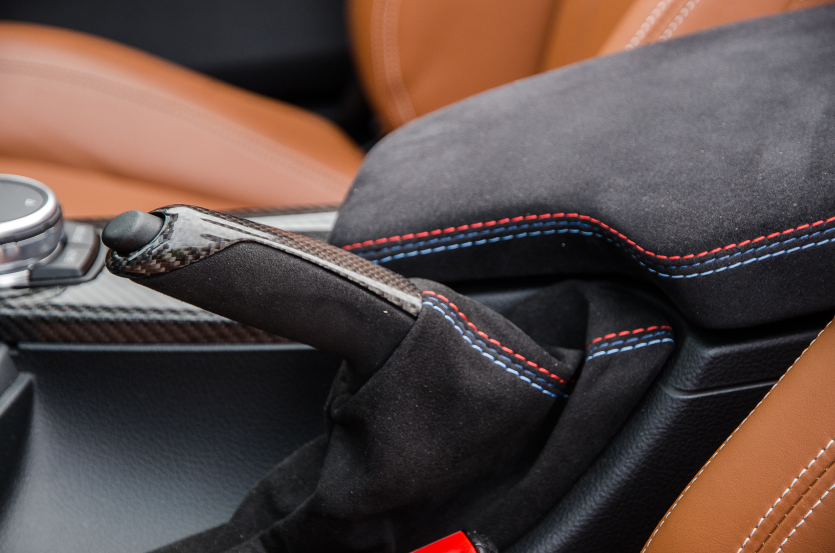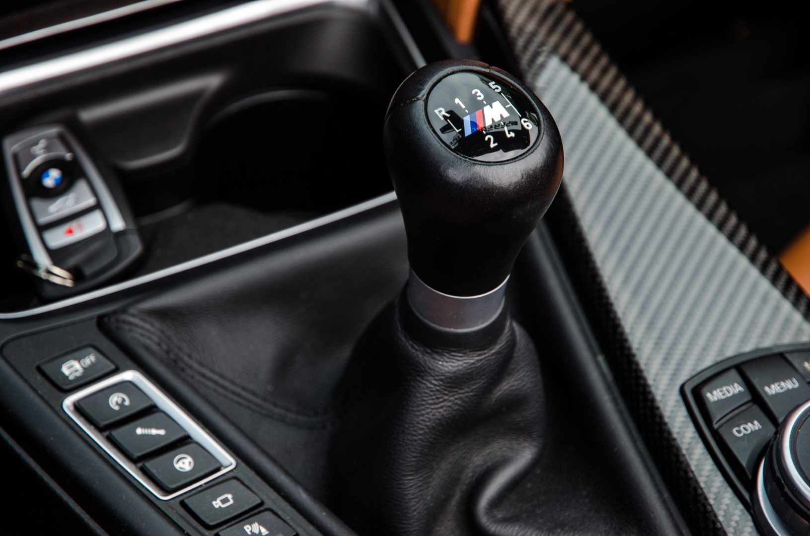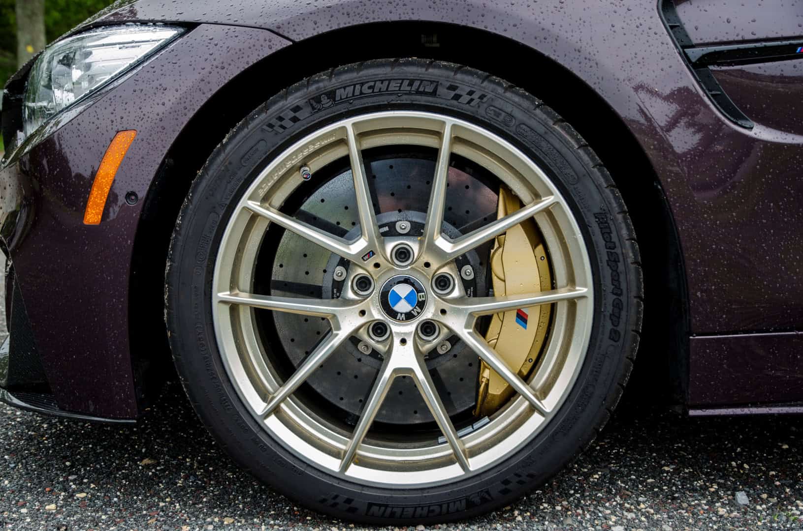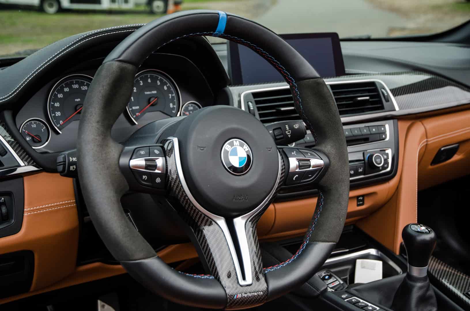 When I approached the M4, it was sitting outside of BMW M Performance’s HQ with its top down, ready to go. That was actually a bit of a problem because, holy hell, those seats get hot in the sun and shorts were a bad idea. Scorched thighs aside, though, I was ready to roll in a car that I’ve been waiting to drive for a long time. It looked fantastic, with the sunlight turning its subtle purple into a much more vibrant color. The carbon fiber mirrors, lower front lip and, more importantly, its gold wheels made it stand out even further.