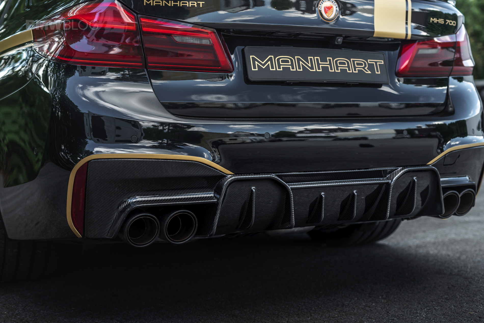 Compared to the standard diffuser of the F90, the new MANHART full carbon diffuser is an absolute statement. Clearly aiming towards the American and Middle Eastern market the MANHART diffuser is quite flamboyant for a german product. By its exaggerated fins and the fact that it is one big carbon panel, going over the cars full width, it turns the F90’s calm rear end into a real eye catcher.