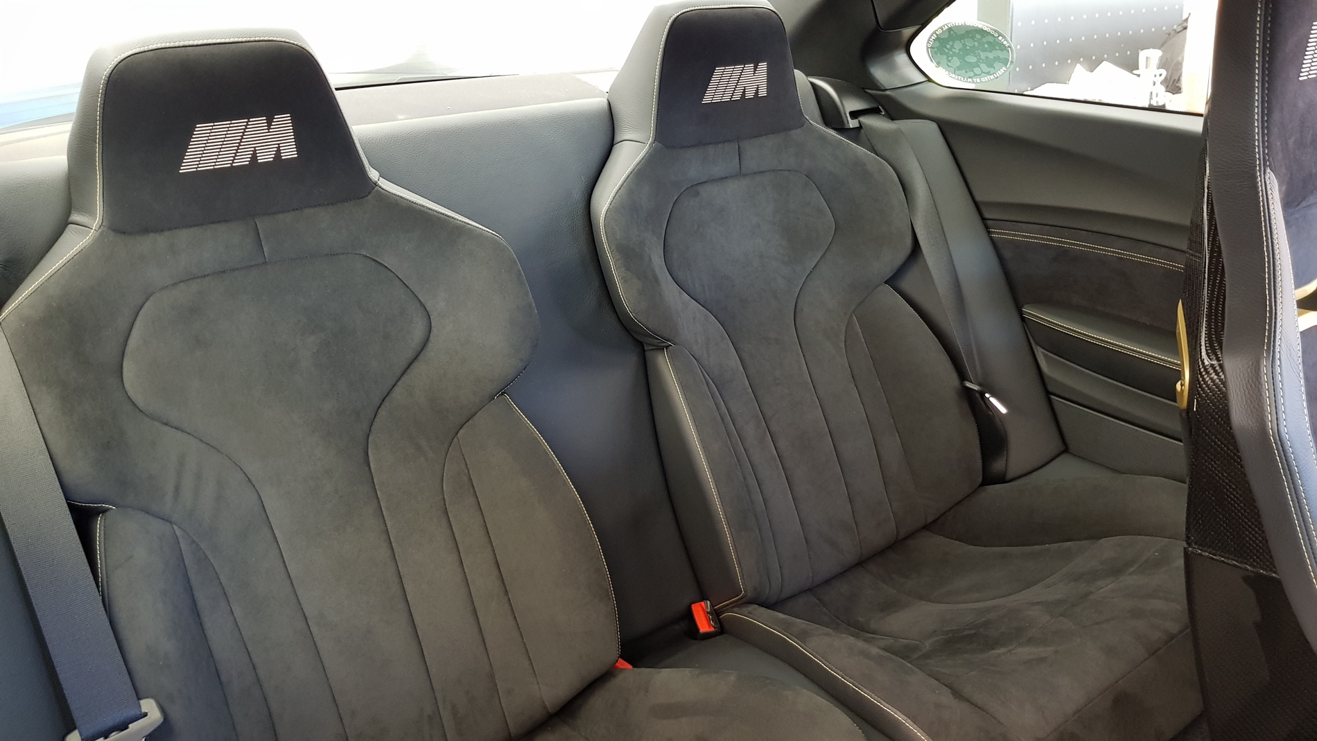 Inside, it gets Alcantara sport seats with gold contrast accents, an M Performance steering wheel with gold stitching and more gold stitching on the door panels. The seats are new but the steering wheel is not, as we’ve tested that wheel on a few different BMWs in the past. The gold stitching is a new touch, though. Alcantara is also a defining feature of the M Performance lightweight rear seats, which reduce the weight of the vehicle by another 13 kilograms.