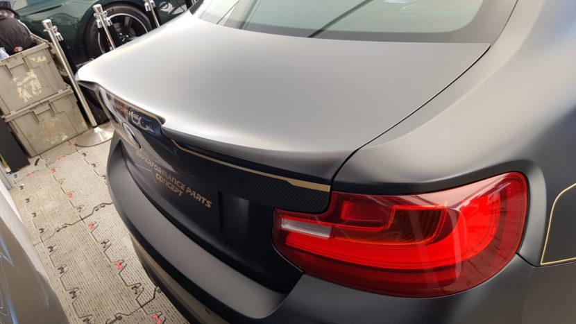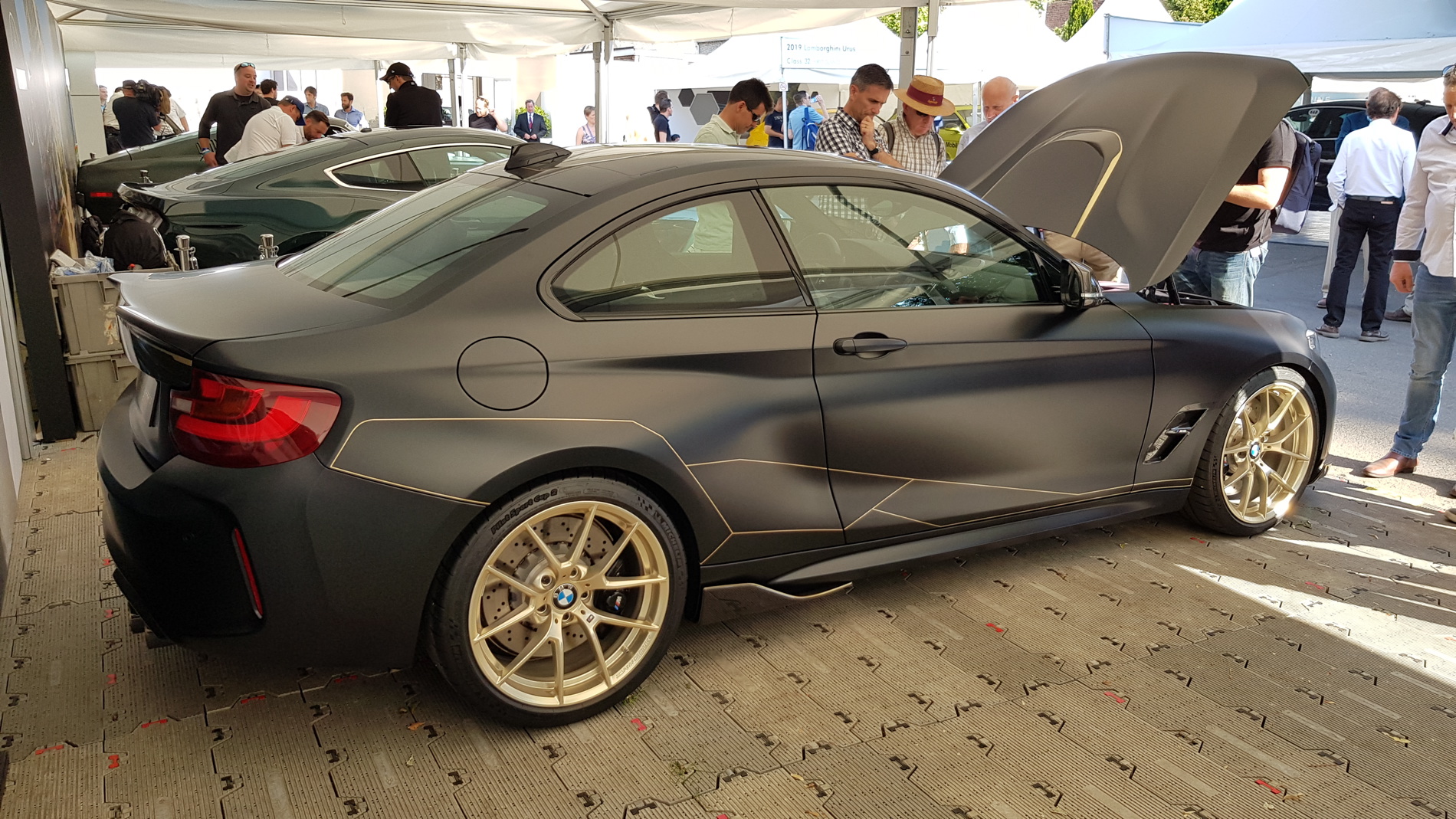 BMW M introduced the M2 Performance Parts Concept today at the 2018 Festival of Speed in Goodwood, UK. The concept M2 with M Performance Parts starts with a Frozen Black finish with gold M Performance wrapping that looks really aggressive and motorsport-inspired. Next, it gets a carbon fiber hood with a power dome, a carbon fiber roof finished in a glossy clear finish, a completely new trunk lid with an integrated carbon fiber spoiler and new gold wheels.