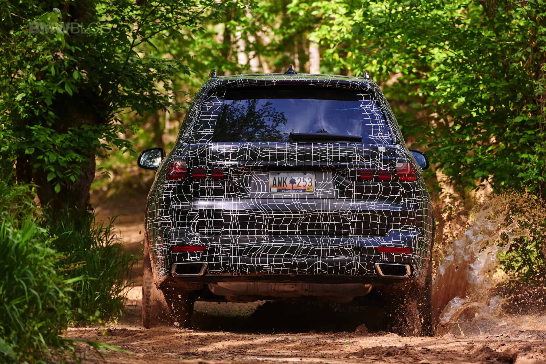 The BMW X7 sitting on the truck in these photos is clearly an M Performance model. We’ve heard that the M Performance variant of the X7 will be called the X7 M50i and we’re assuming that’s what this is. The tip-off for this car being an M50i is the silver mirror caps. Sure, its large wheels look sport and so do its quad exhaust pipes in rectangular tips. But those could just come from an M Sport package or something of the like. But the silver mirror caps are a dead giveaway for an M Performance car.