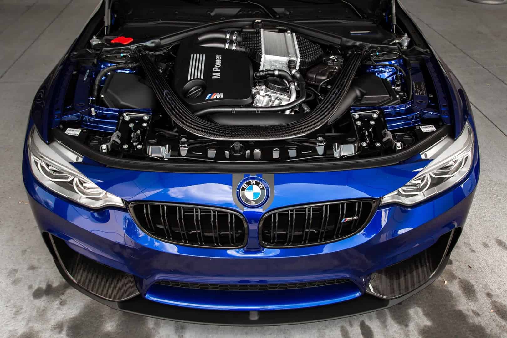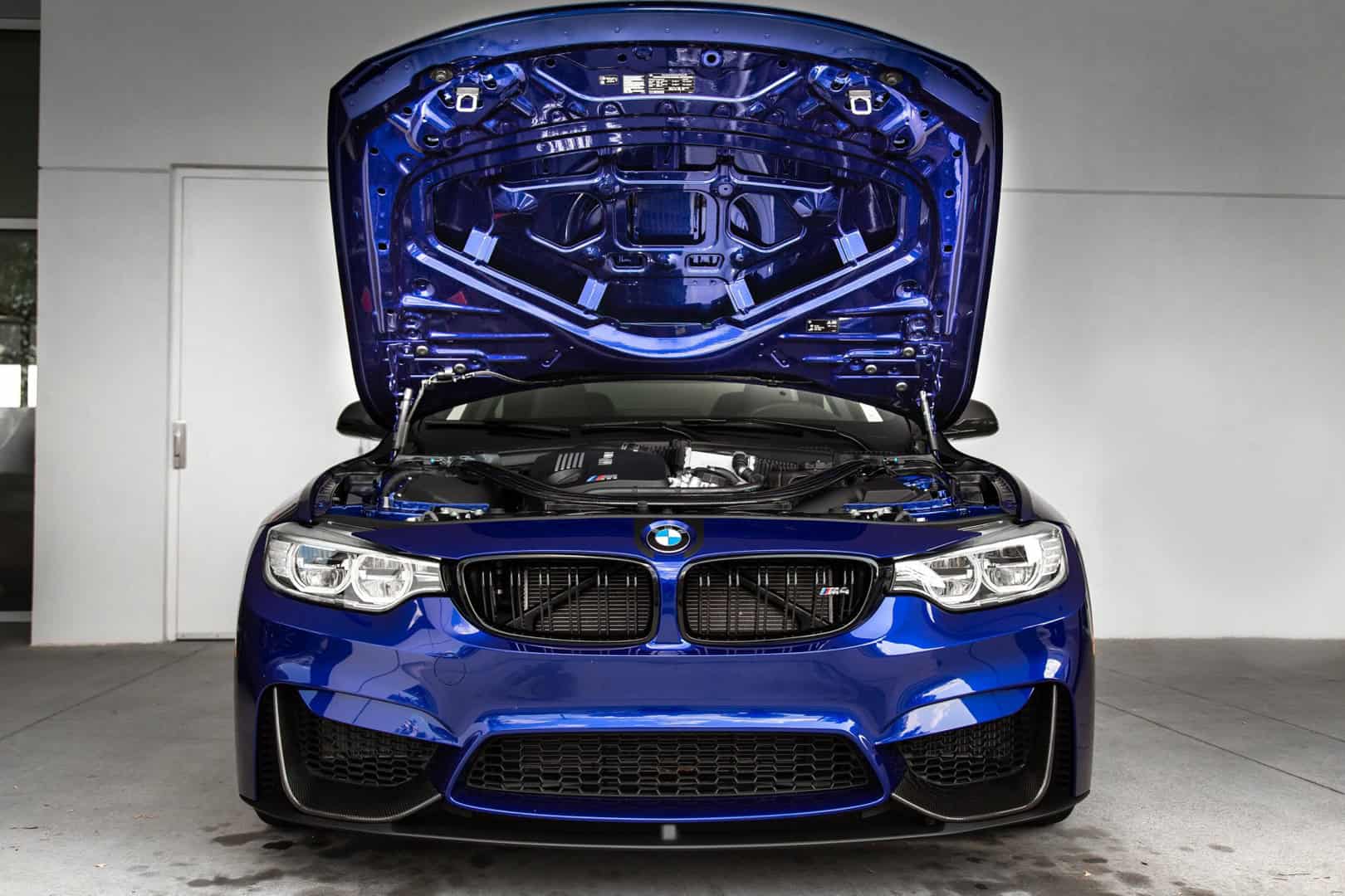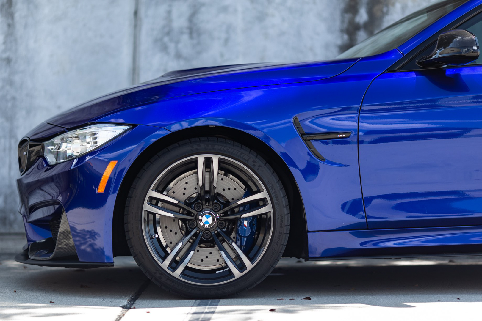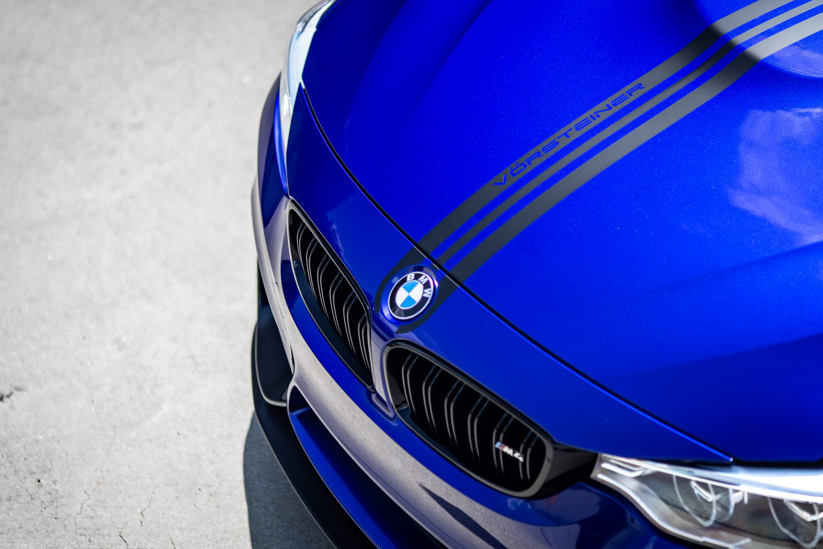 San Marino Blue is one of our absolute favorite modern BMW Individual colors. We’ve seen everything from the M4 to the M5 to even standard 5 Series’ painted in the color. In that color, this BMW M4 looks fantastic. It also gets a subtle carbon fiber decklid spoiler and, curiously, a hood decal that reads “Vorsteiner”, despite it not wearing Vorsteiner wheels. Aside from that oddity, it also gets carbon fiber in its front air intakes, a black lower front lip, black side skirts and the M Performance exhaust with carbon fiber tips.