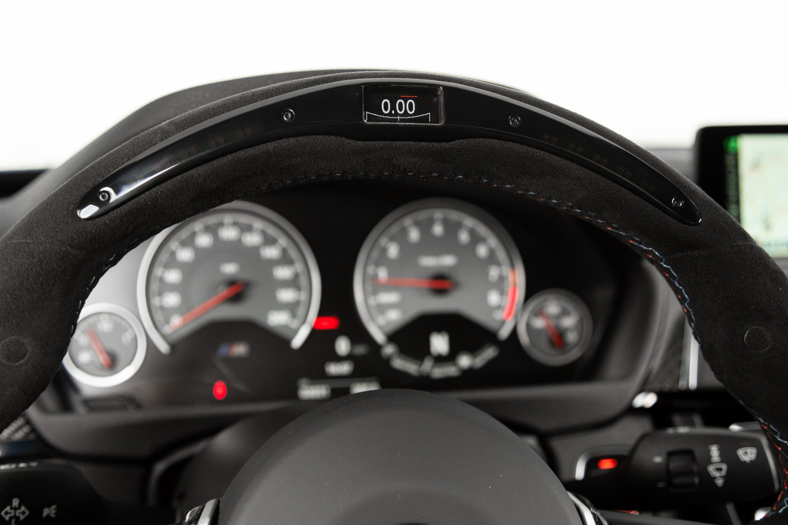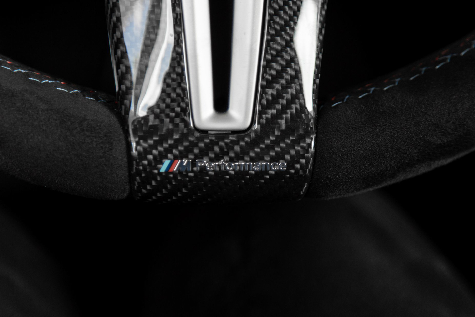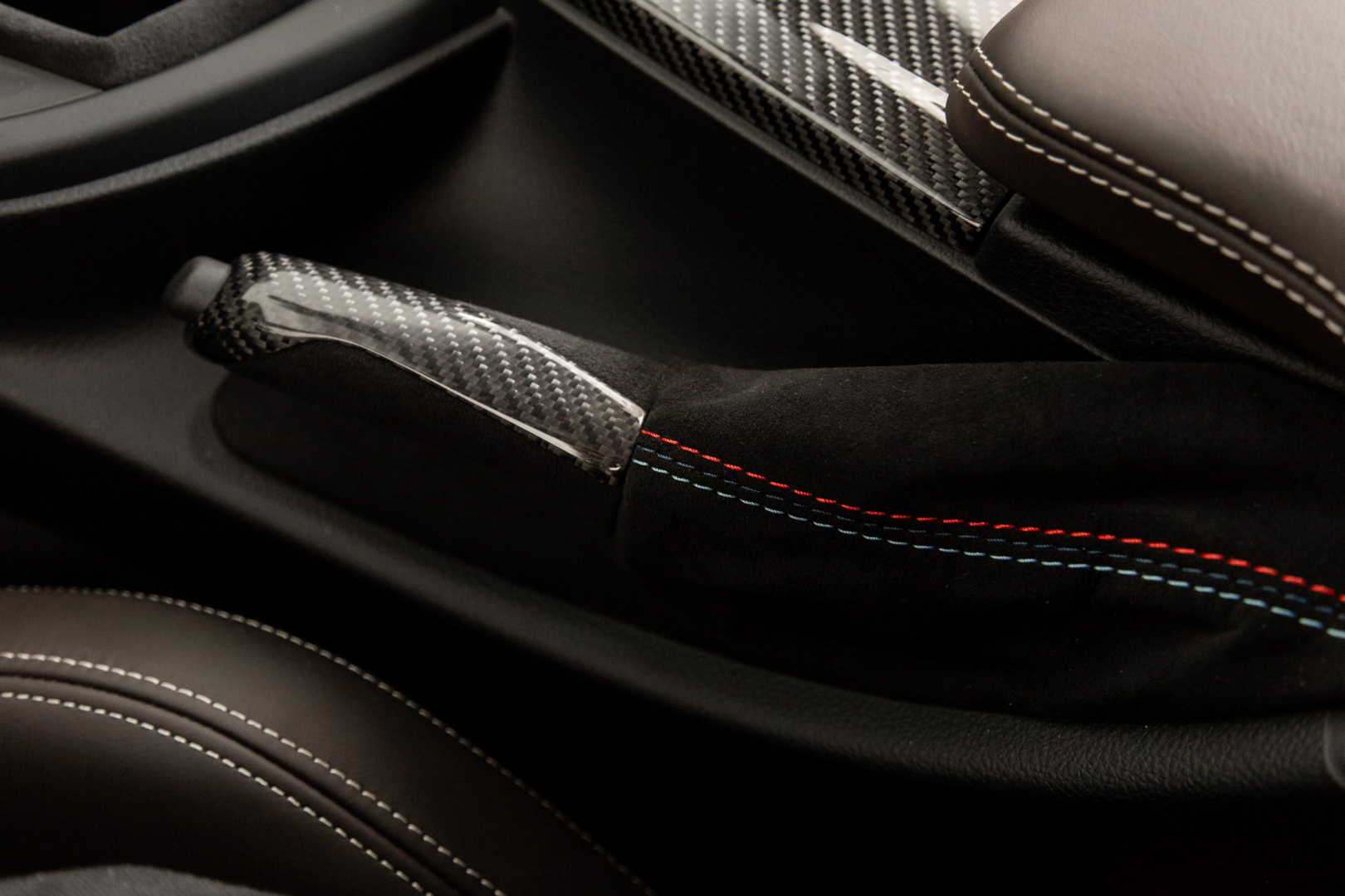 Inside, this BMW M4 gets another Individual option, the Cohiba Brown leather, which looks absolutely spot on in contrast with the San Marino Blue paint. We also see more M Performance Parts inside, such as the Display Steering Wheel, with glossy carbon fiber, Alcantara and M-colord contrast stitching. The Display wheel looks very cool, though it is a bit odd to hold. More importantly, it gets a new shift lever for its six-speed manual gearbox. It’s another M Performance Part and it’s a stubby little knob with carbon fiber inlays that looks fun to throw.