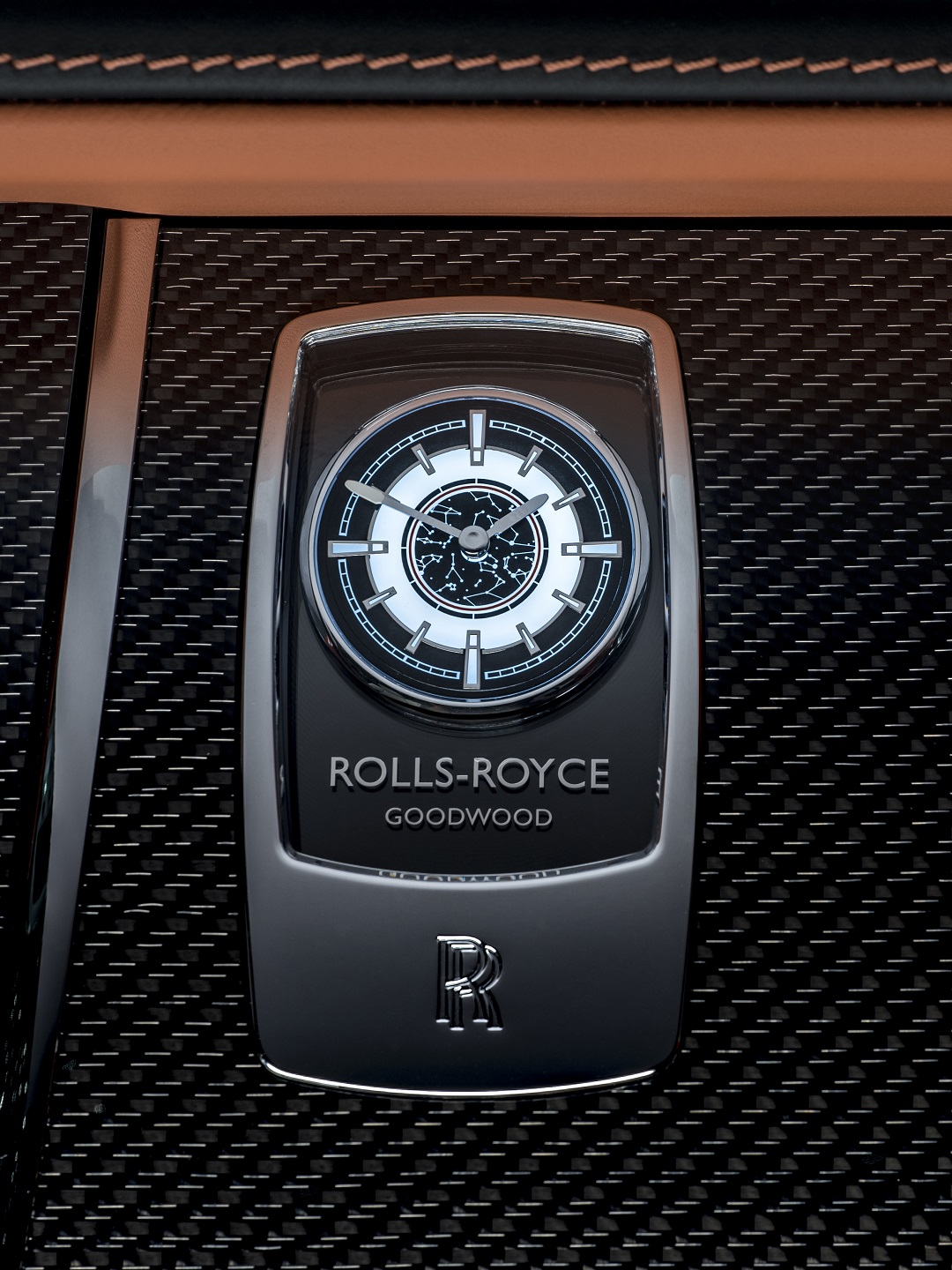 The centerpiece of the Black Badge cabin is the aerospace-grade aluminum-threaded carbon fiber composite surfacing – material often seen on the surfaces of stealth aircraft. This futuristic material has been reinterpreted at Goodwood to become the world’s most innovative new super-luxury material. Polished to a high sheen, this surface reflects the twinkling lights of the beautifully created Starlight Headliner wrought in Ghost and Wraith and the stars firmament once the Mandarin hood of Dawn is folded away.