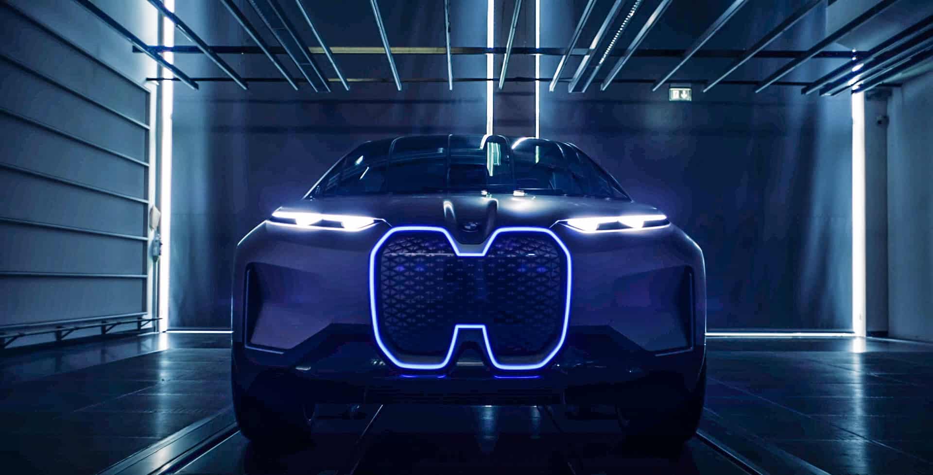 The front end is completely exposed, showing off its massive, tall Kidney “Grilles”, which aren’t really grilles, obviously, as it’s an electric car. They’re huge and tall and trimmed in blue lighting. In design, they look a lot like the ones shown on the Vision iNEXT Concept from a year ago, only bigger and, frankly, worse.