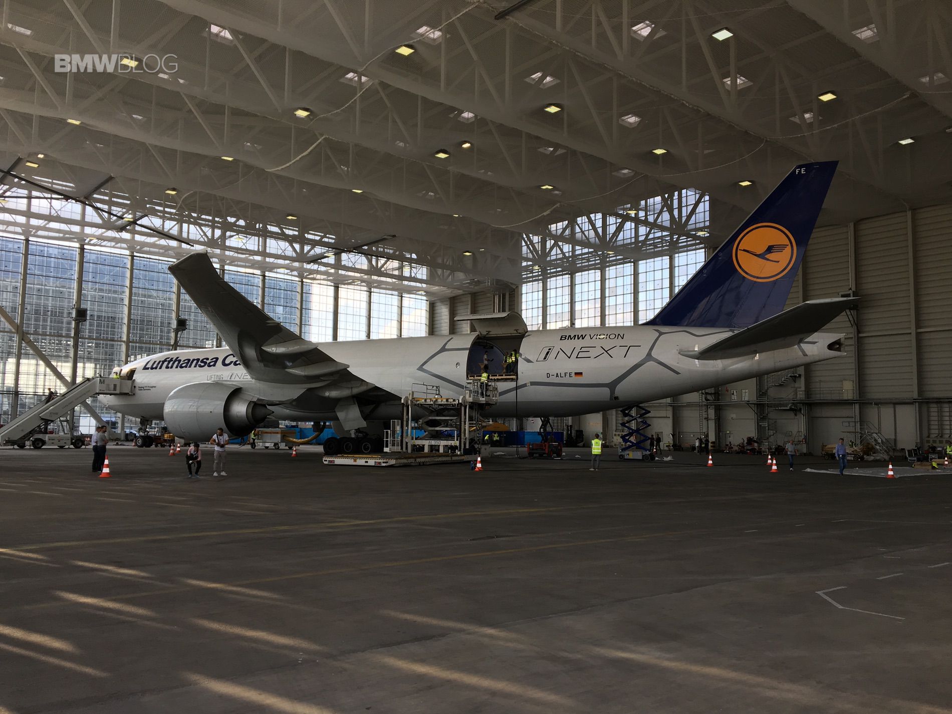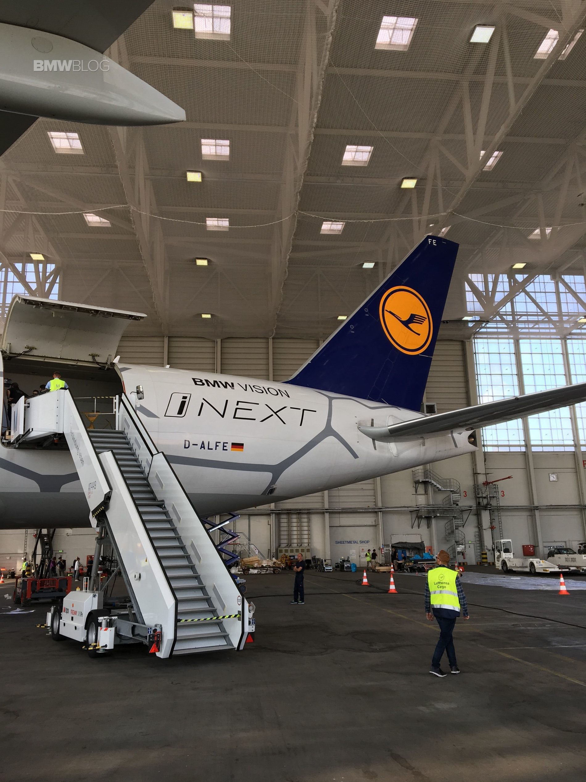 But ahead of the unveil, a source close to BMWBLOG shared the first photos of the special plane while taking in as a cargo the equally special guest. The footage and photos below show the BMW iNEXT fully covered while being loaded into the cargo area, which in fact was designed to host the unique unveil event.