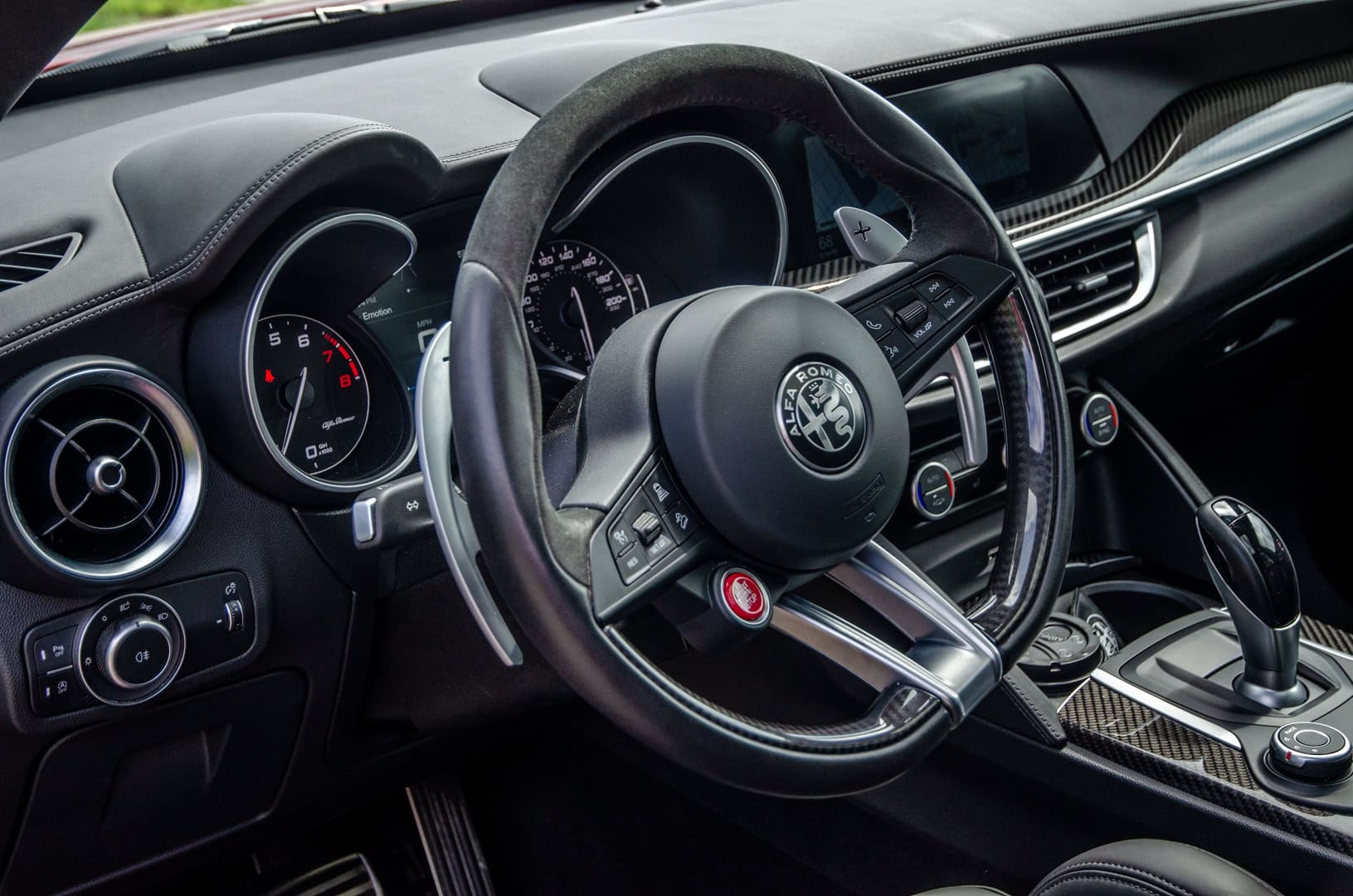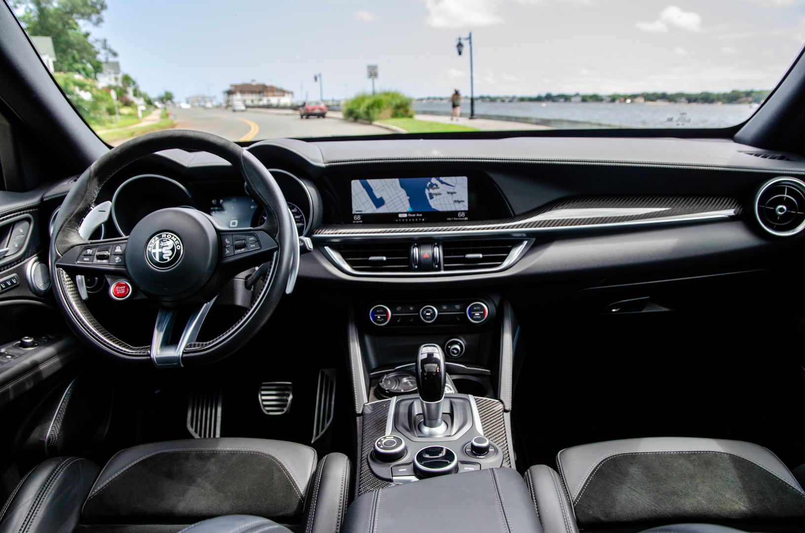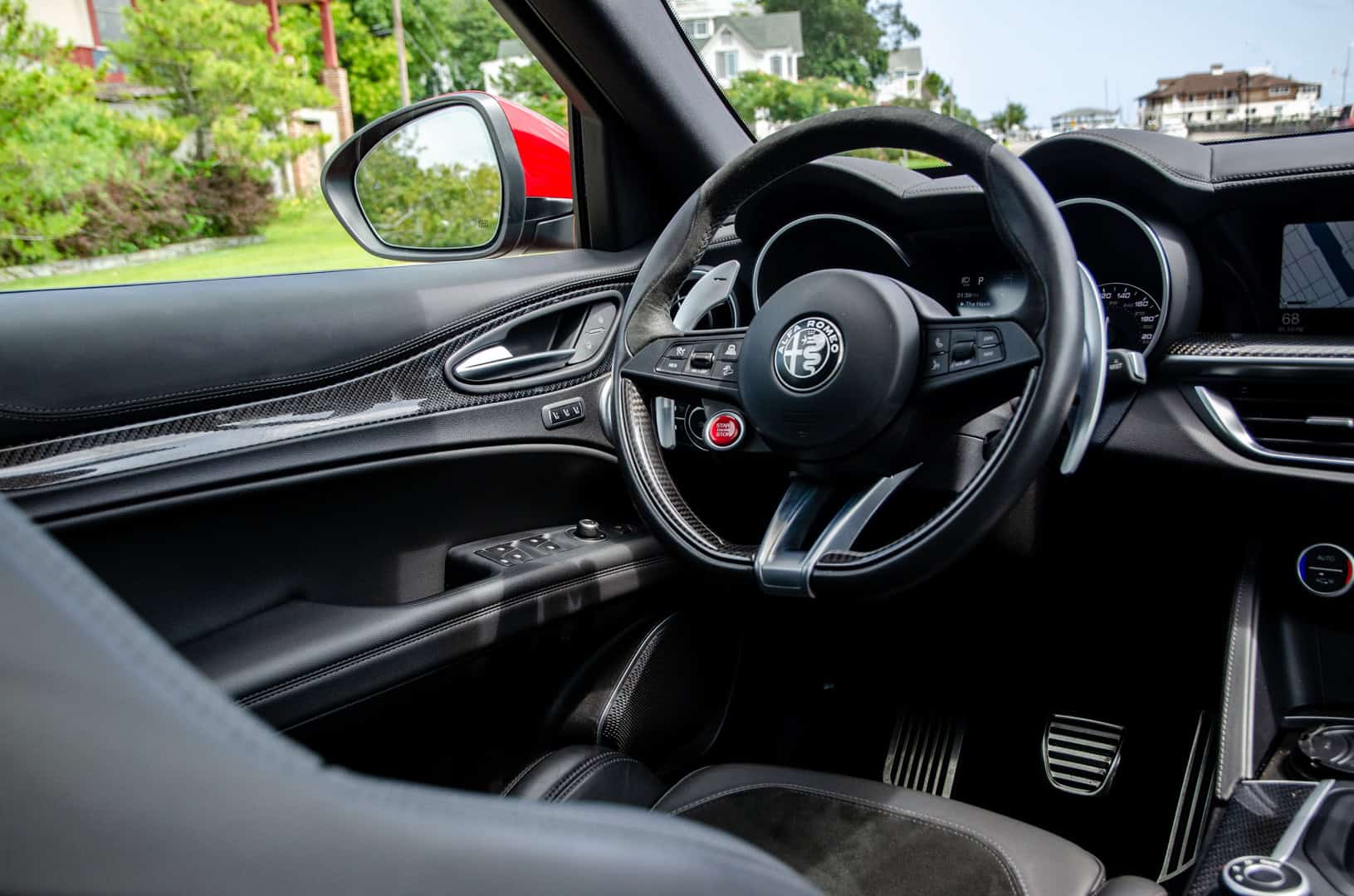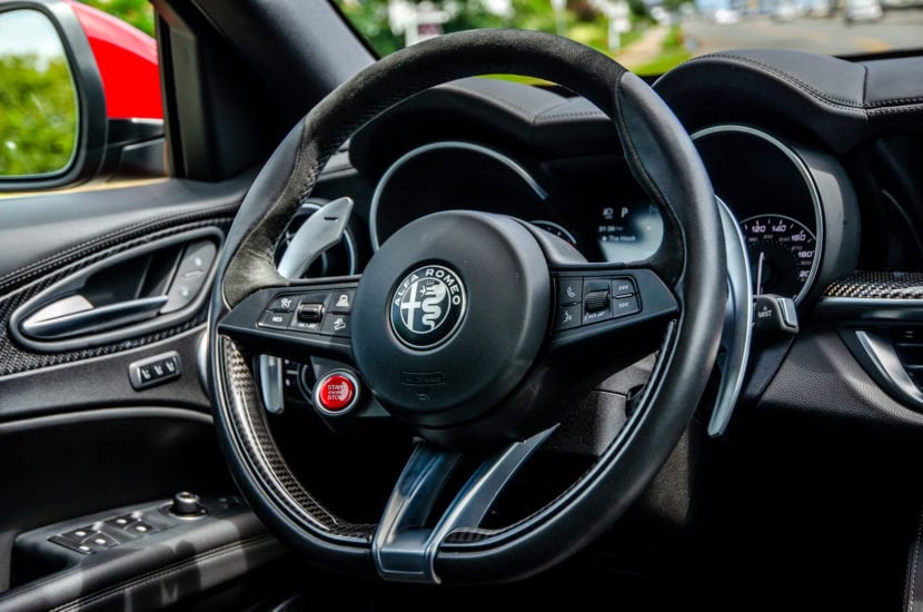 While the Stelvio Quadrifoglio is a truly great looking SUV, sitting in its driver seat is even better, thanks to just how special it feels to drive. From the driver’s seat, you look out over the scuttle at its sculpted hood, with its two fully-functional black vents, you hear that 2.9 liter twin-turbocharged V6 roar to life and you hold a thin, Alcantara and leather-wrapped steering wheel with two simply gigantic aluminum paddles flaking either side. Just sitting in the Stevlio Quadrifoglio while stationary feels special.