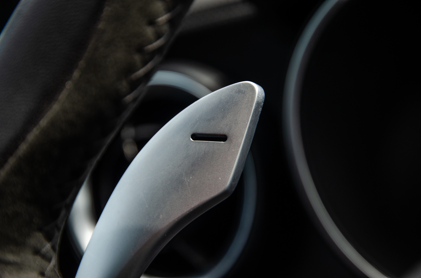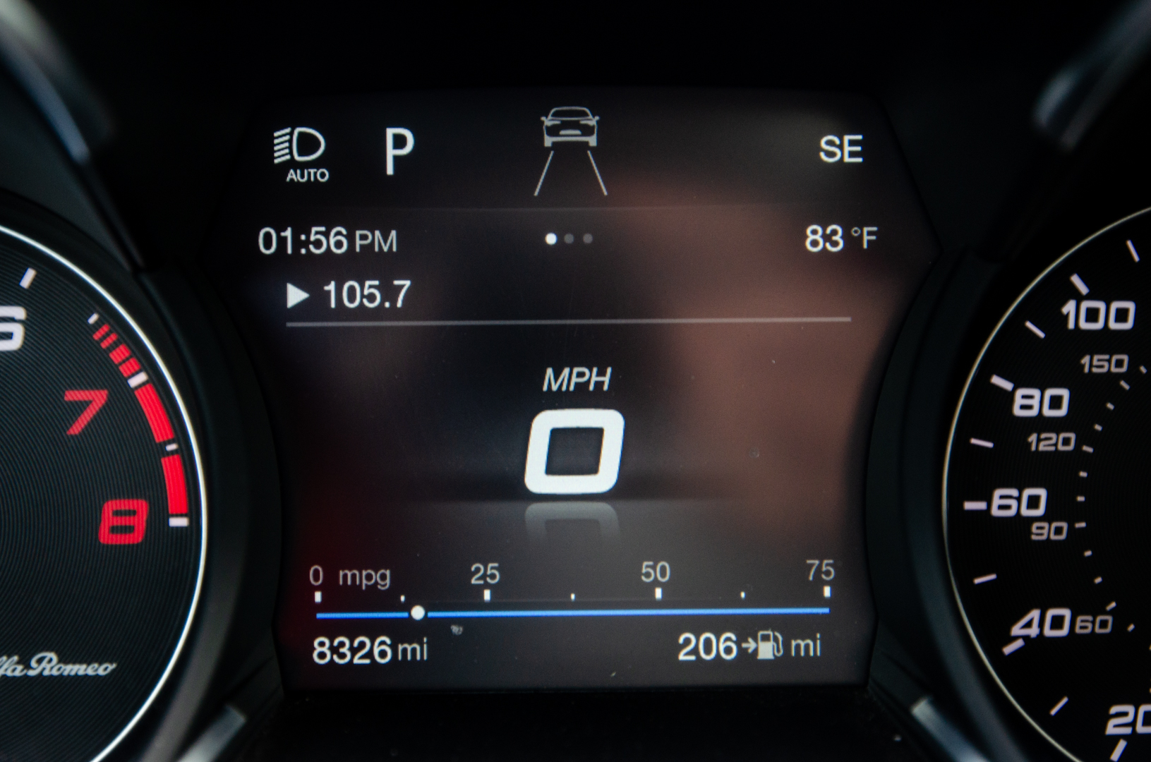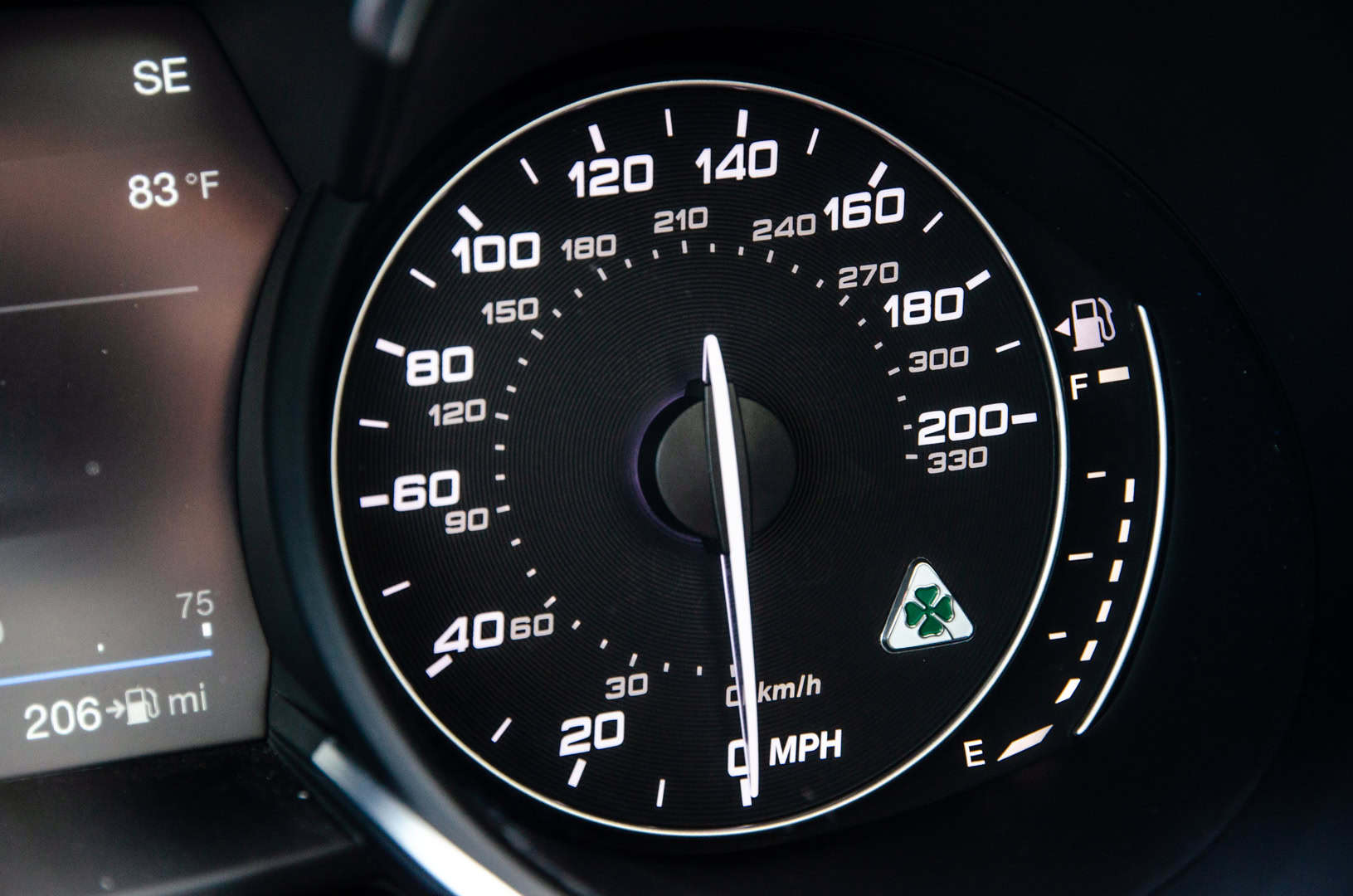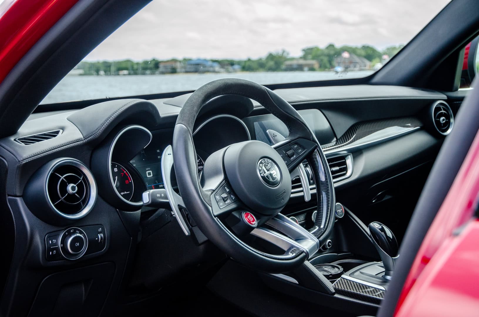 While the Stelvio Quadrifoglio is a truly great looking SUV, sitting in its driver seat is even better, thanks to just how special it feels to drive. From the driver’s seat, you look out over the scuttle at its sculpted hood, with its two fully-functional black vents, you hear that 2.9 liter twin-turbocharged V6 roar to life and you hold a thin, Alcantara and leather-wrapped steering wheel with two simply gigantic aluminum paddles flaking either side. Just sitting in the Stevlio Quadrifoglio while stationary feels special.