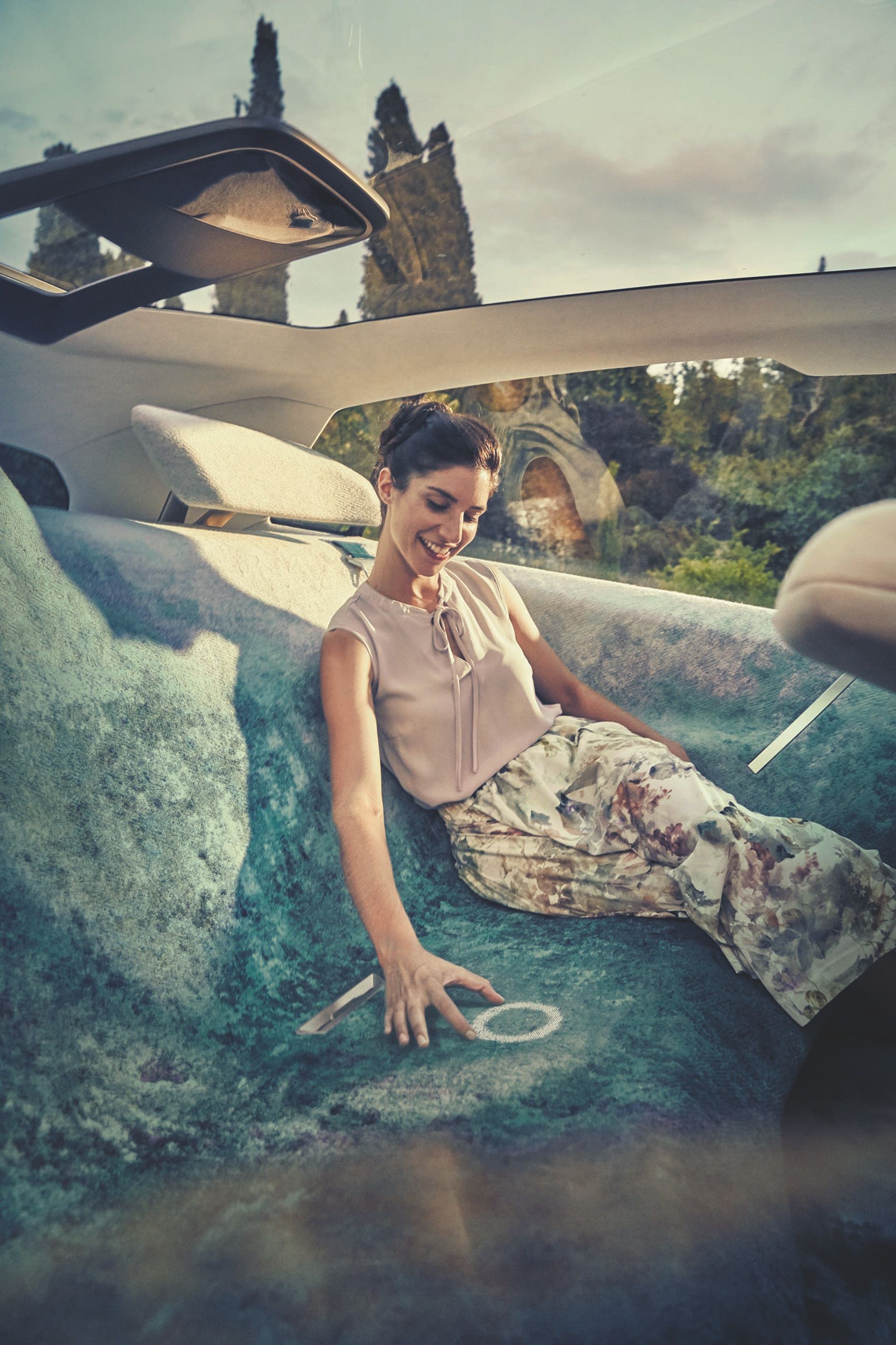 As for “Intelligent Materials”, the center armrest’wood panel can replace the traditional iDrive controller. While in “Boost” mode, the center screen is controlled via typical touch controls. However, while in “Ease” mode, the screen can be operated via the wood on the center armrest, which then becomes a touch panel that provides visual recognition of touch responses with little trails of light. The rear seat’s cloth material also has a similar technology. So no, that woman in the photos isn’t hallucinating back there, as I previously thought.