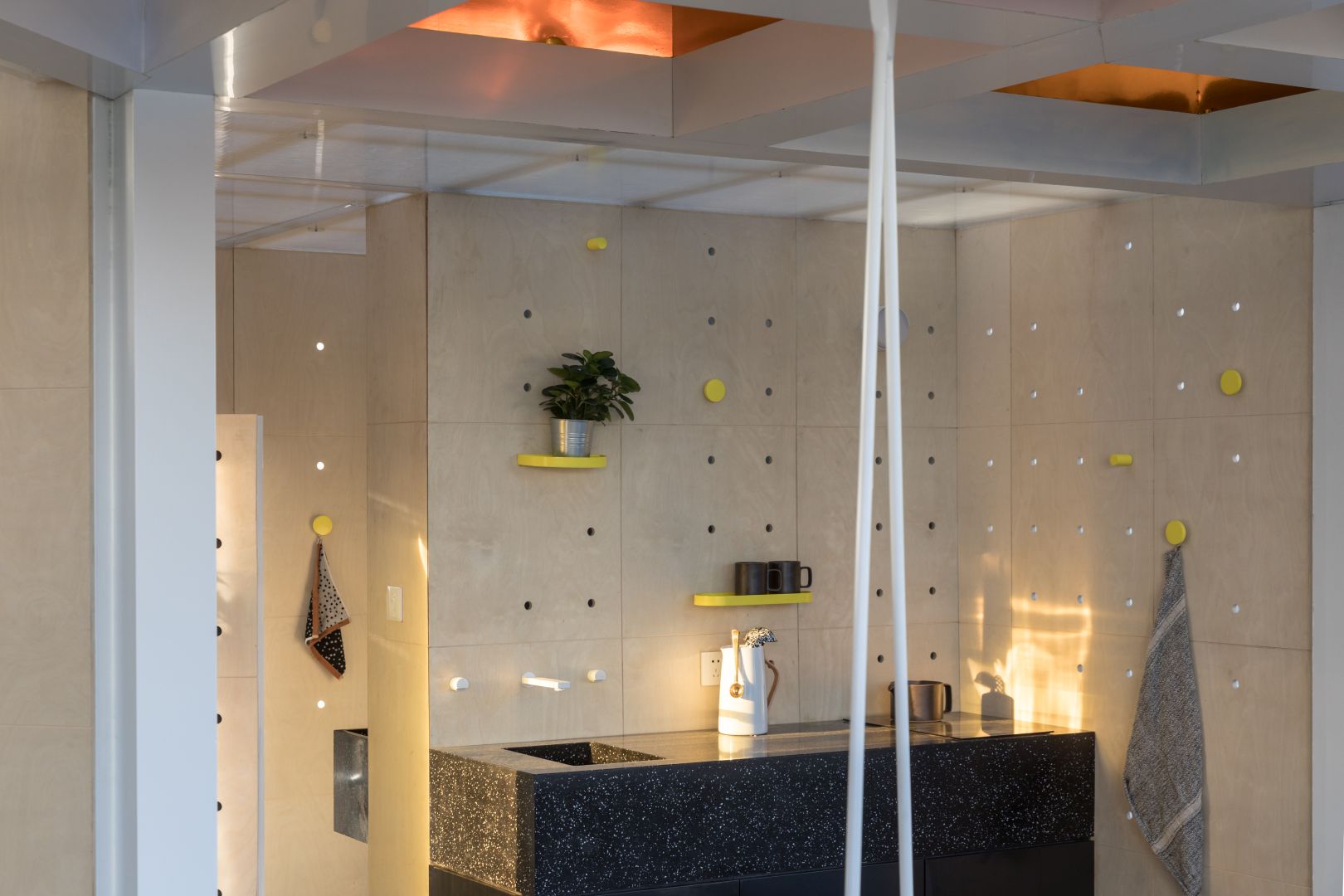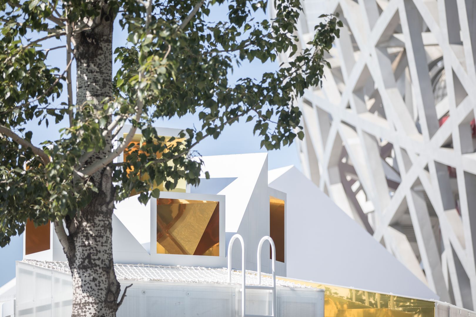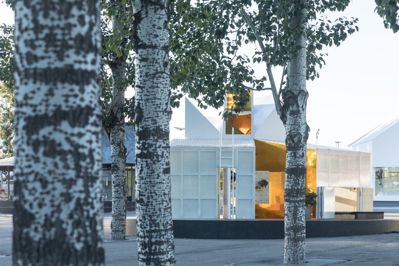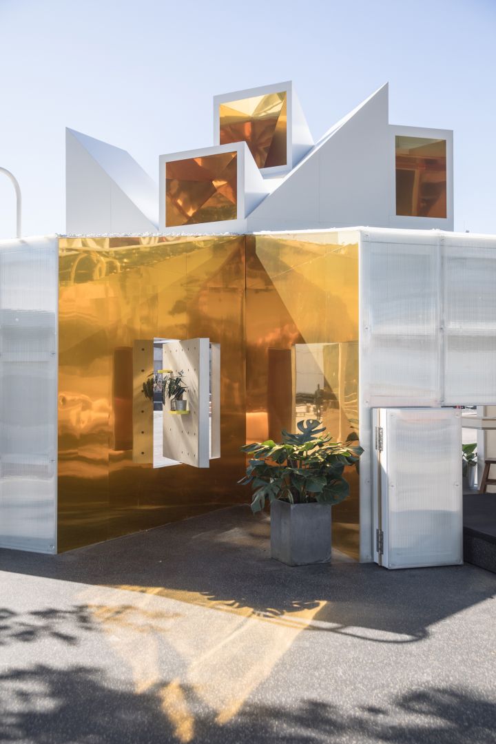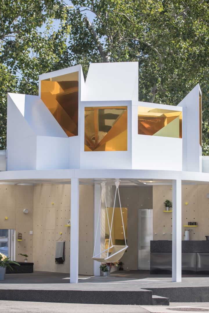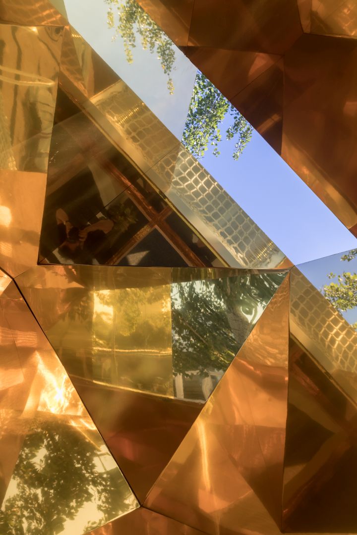 Golden, telescope-like mirrors are mounted above this interactive space, reflecting the immediate environment but also the broader urban context. A swing at the center of the space provides a playful shift in the viewer’s perspective. The storage and seating facilities positioned around the Urban Cabin are designed in geometrical shapes reminiscent of traditional Chinese tangram puzzles, also acting as an attractive feature for contemplation.