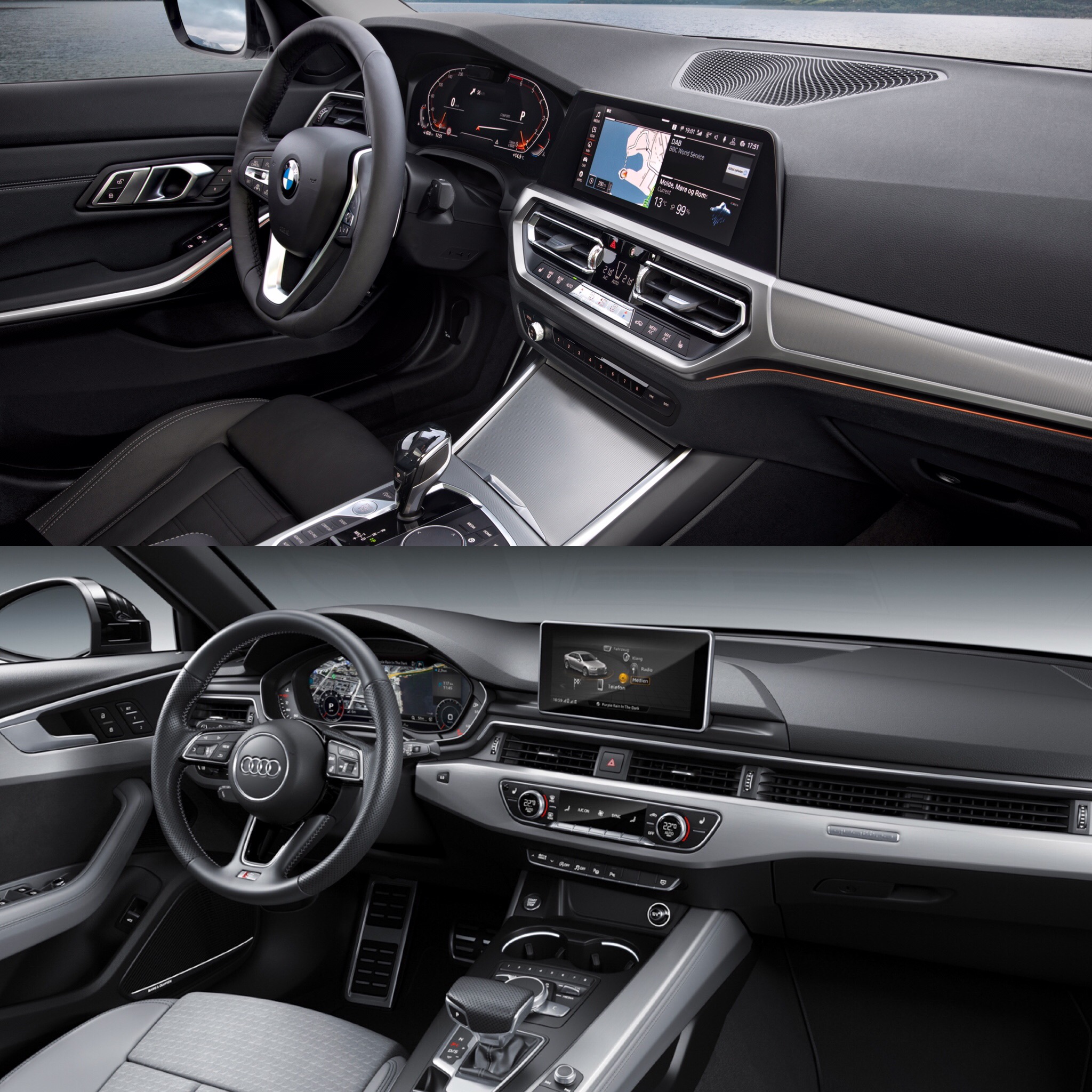 Where the two cars are closest, though, is inside. The BMW 3 Series finally gets rid of its outdated interior for a far more modern, far more stylish one. What’s impressive is how well the A4’s cabin has held up, despite being a few years old now. It still looks very high tech, very modern and very slick. Each car deals a blow to the other on the inside, in different areas. For instance, BMW’s new iDrive infotainment system seems far better than the A4’s version of MMI but Audi’s Virtual Cockpit is better than BMW’s new digital instrument panel. BMW’s steering wheel looks sportier but Audi’s looks more high-tech and modern. The Bimmer has more aluminum and looks a bit more expensive but the Audi has a bit more minimalist, slick look with its horizontal air vents that span the dash and simplistic but modern climate controls.