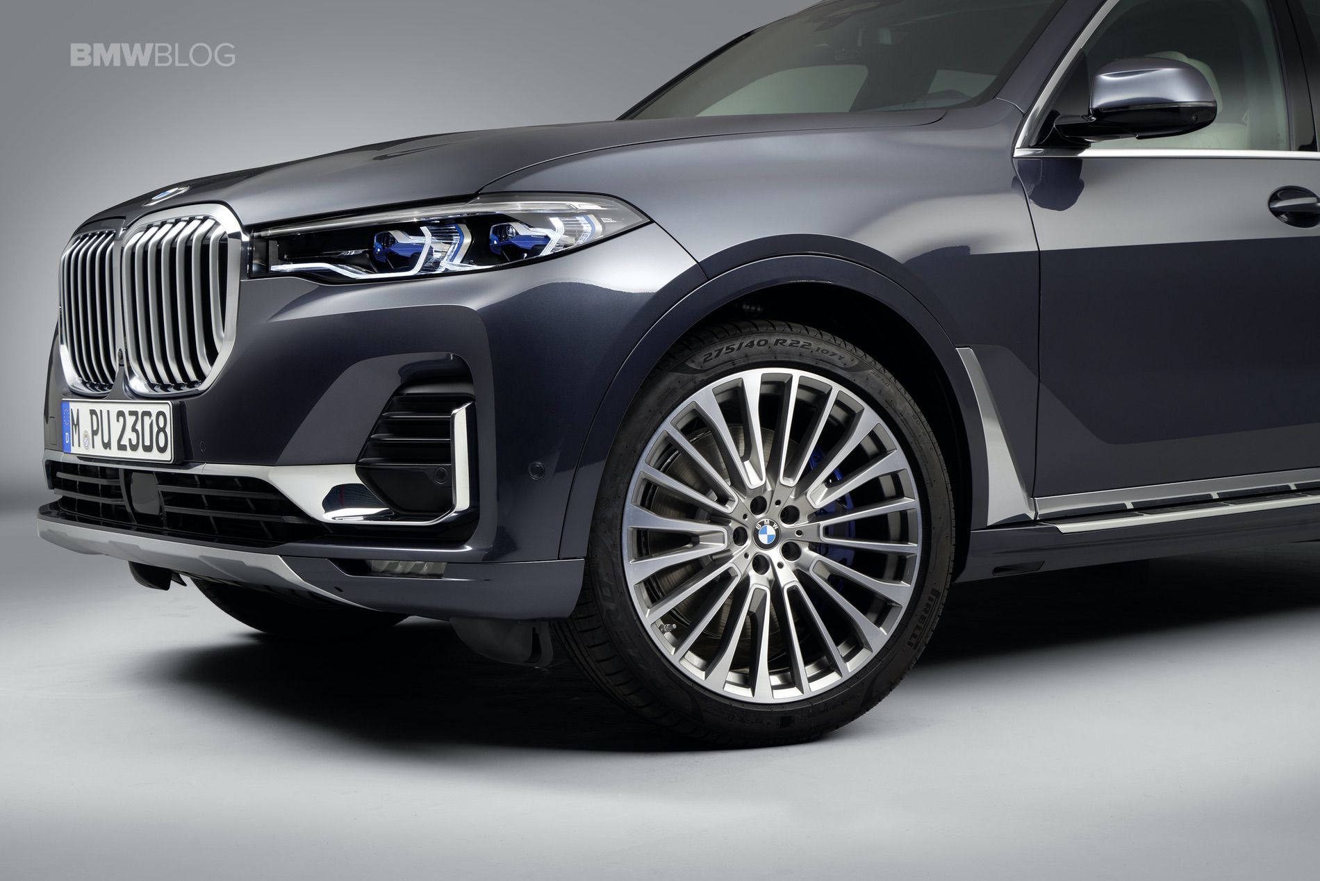 The real life images emphasize even more the massive kidney grille – by far the largest in the entire BMW portfolio – and the directly adjoining headlights which further emphasize the width. In the side view, the sheer dimensions of the X7 and the generous window surfaces make it easy to imagine the spacious interior. The wheels are by no means oversized, although this particular model carries 22-inch alloy wheels. The standard 20-inch model could almost hide under the huge wheel arches.