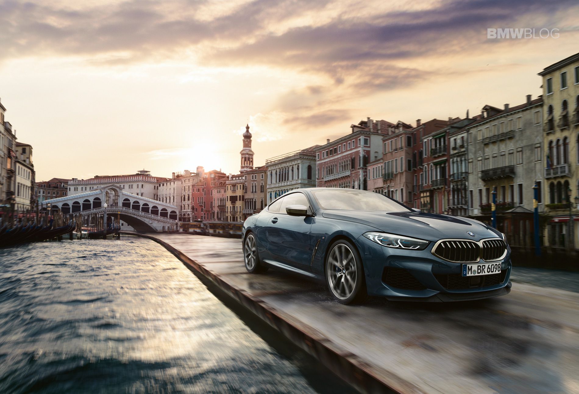 The new 8 Series Coupe in Barcelona Blue is seen driving through the historical centre of Venice. Driving past magnificent palazzi and underneath the Rialto bridge, the new BMW 8 Series makes its way along the Canal Grande – a route never before covered by an automobile.