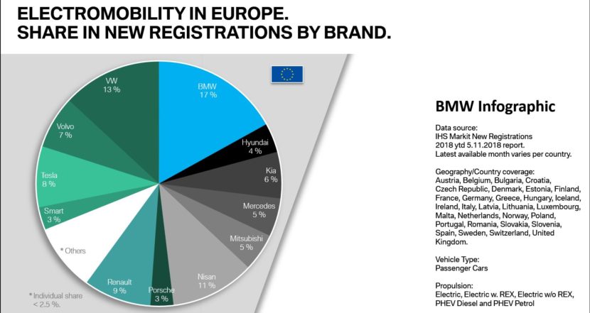 In Germany, BMW is leading, ahead of even Volkswagen. According to the Munich-based manufacturer, over the course of 2018, BMW sold 19% of all cars in the electromobility market, while Volkswagen accounted for 17%. Third place went to smart while Kia came in fourth. Surprising stats at a first glance, especially since BMW is definitely selling the most expensive cars in this short list. Smart is doing great thanks to its electrified fortwo model.