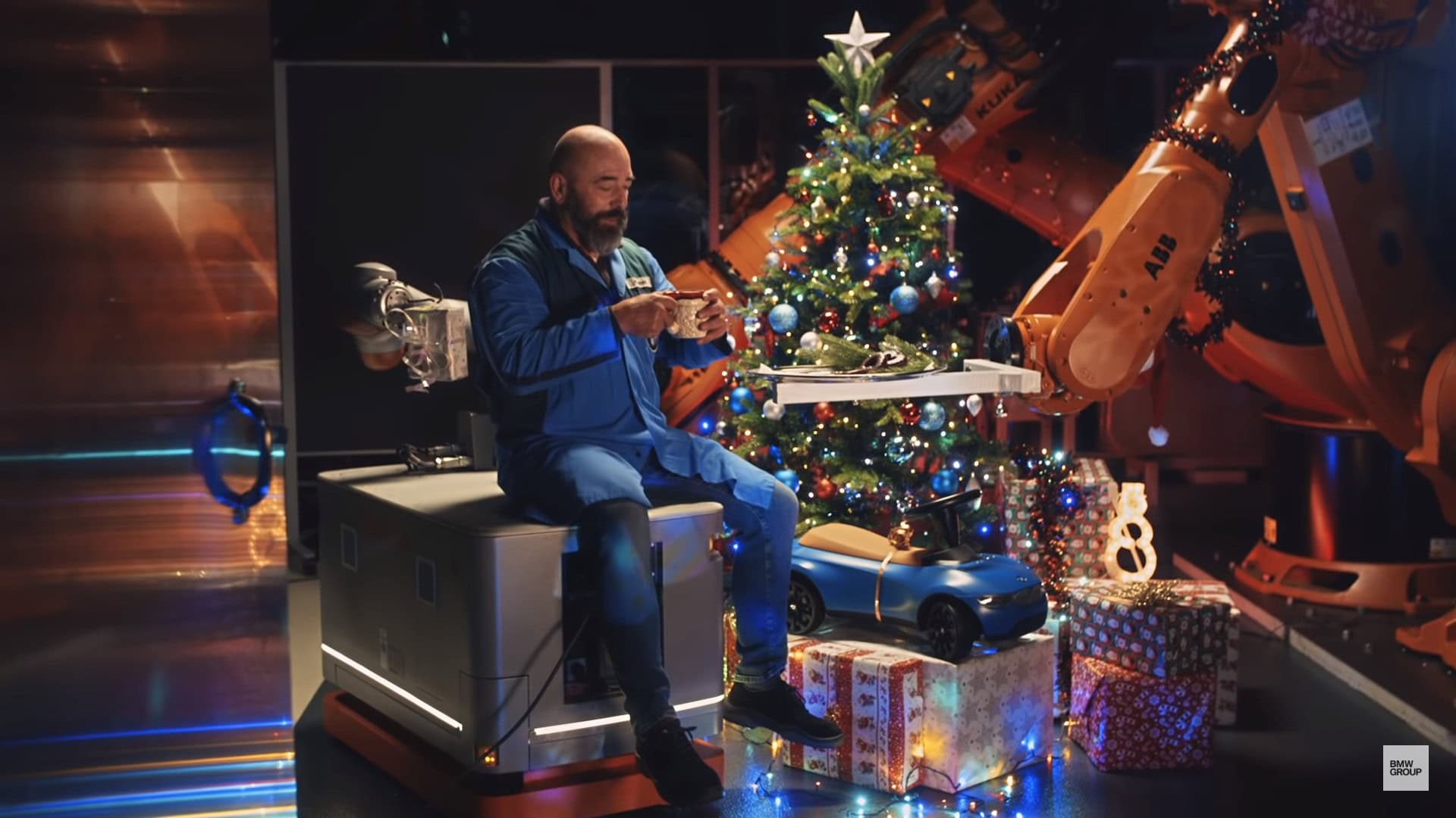 When he finally makes it back to his office, he sees that a Christmas Tree is there, decorated and lit. There are also presents underneath it, with one of them being a really awesome ride-on BMW for children. He also notices that a plant robot is the placing all of the gifts and decorating the tree. That same robot also hands him some pretzels and a cup of coffee, which is generous of it. Of course, the robot is being controlled by other employees who are doing a nice deed for the tired manager.