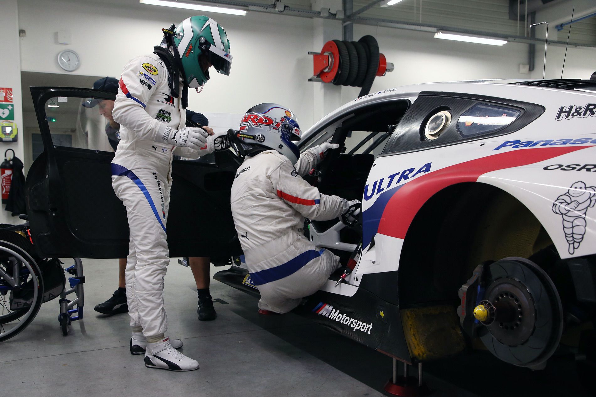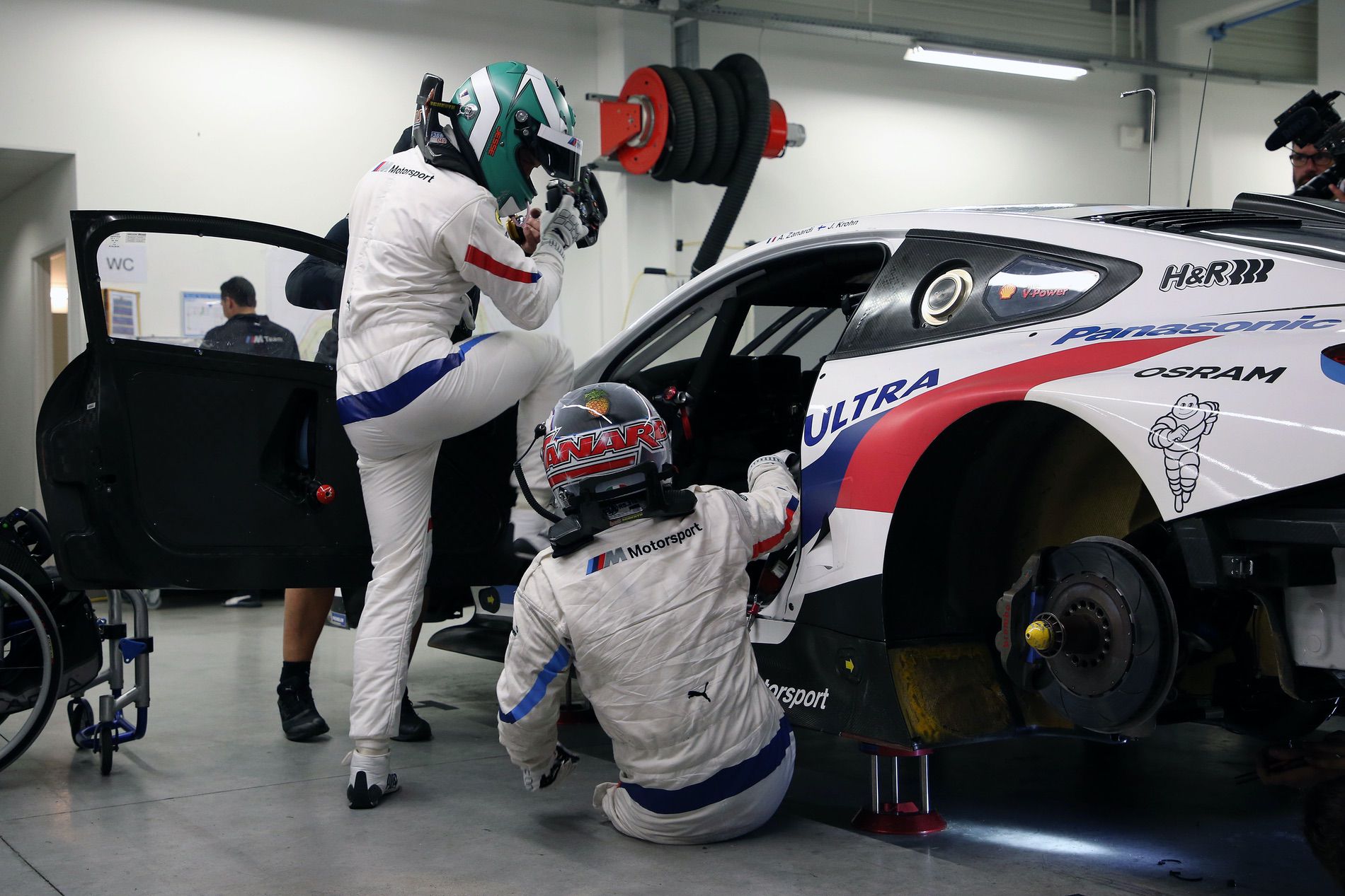 This is how the driver change between Zanardi and his team-mates takes place: Zanardi sits on the pit wall and waits for the arriving car. Then he swings himself next to the car on the floor and pulls himself in as soon as his team-mate has got out and put Zanardi’s seat insert in position. The team-mate then helps him buckle up. The steering wheel is changed, which is handed over by an additional, IMSA approved mechanic. When getting out, Zanardi first pulls himself out of the car and then onto the pit wall. Then when he is behind the pit wall he will return to his wheelchair.