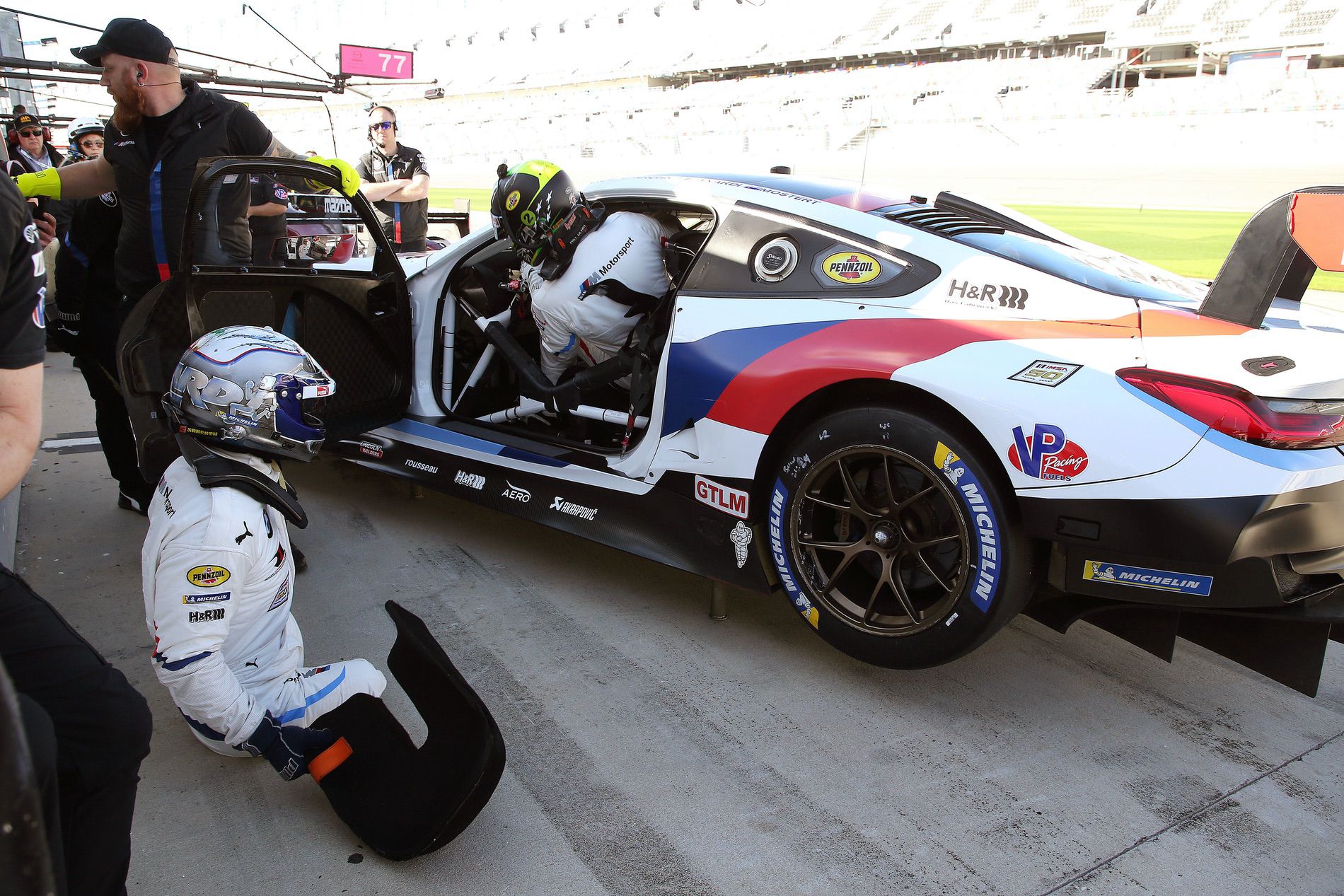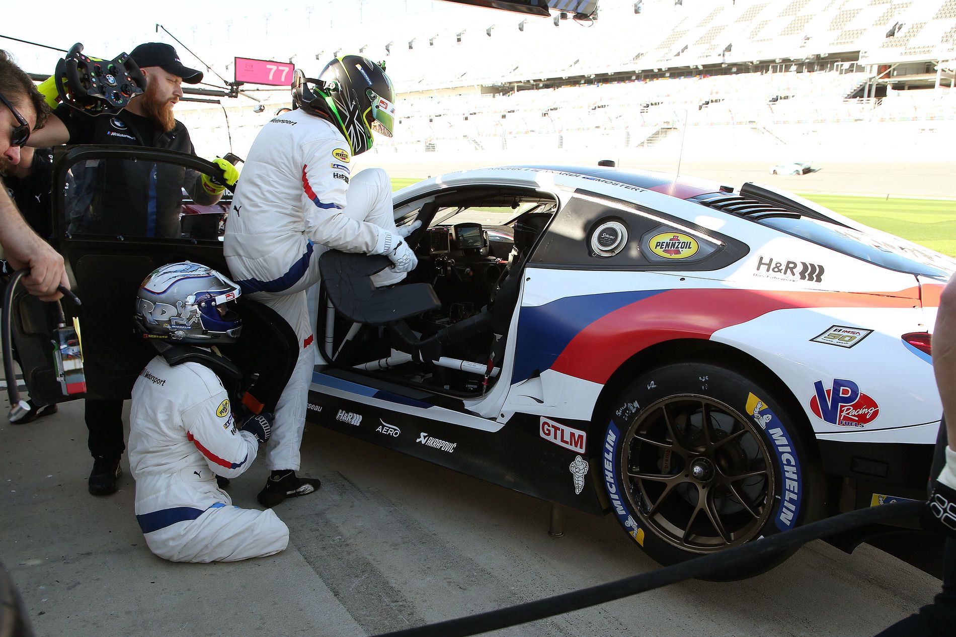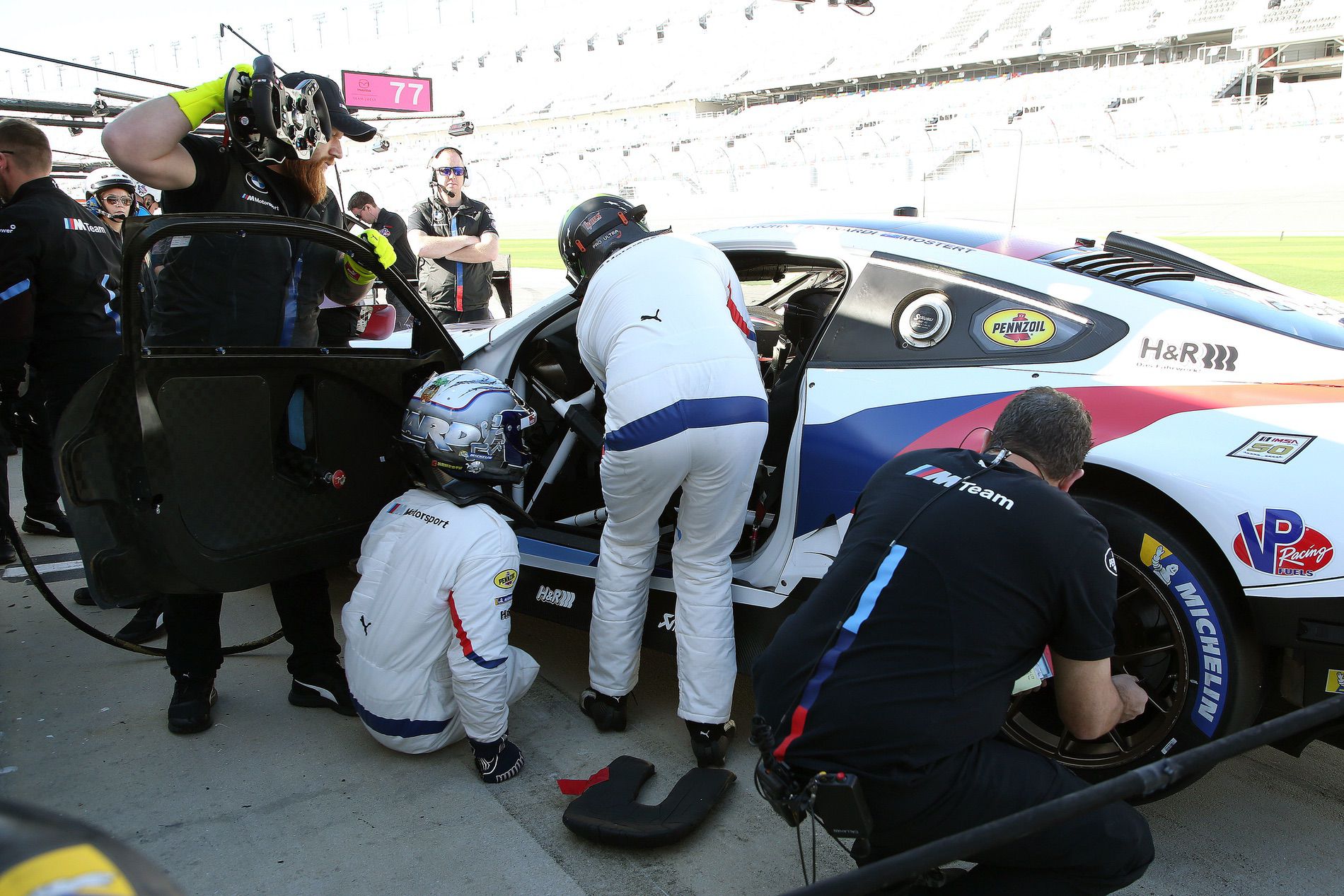 Maximum safety is top priority here as well, and the entire driver change is geared up for that. To ensure that Zanardi can exit the danger zone in the pit lane as quickly as possible after getting out of the car, IMSA has also allowed the additional mechanic to close the safety net and door. Normally, the drivers getting out take care of these tasks. Zanardi doesn’t have to do this, he is allowed to exit the pit over the pit wall during that time.