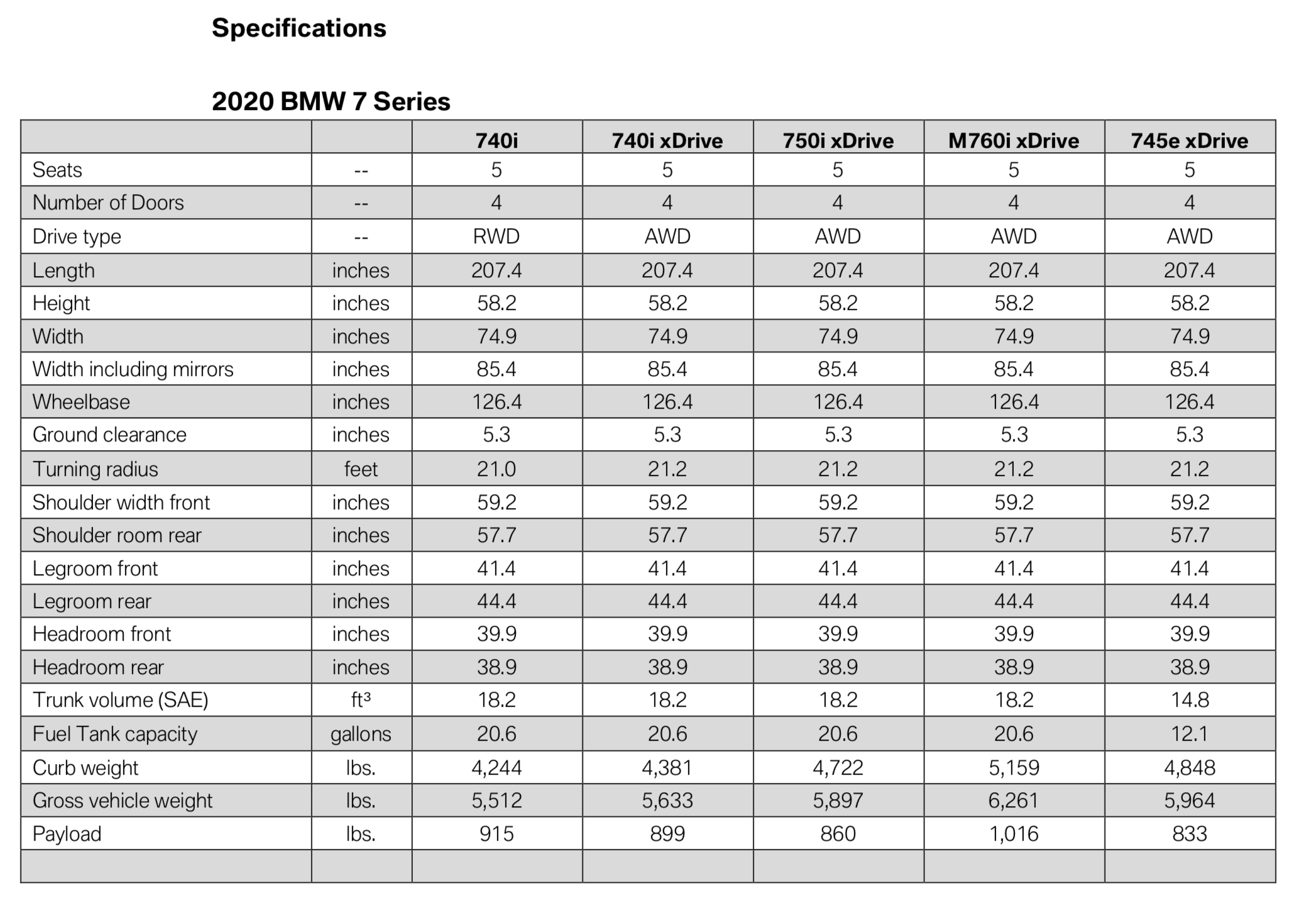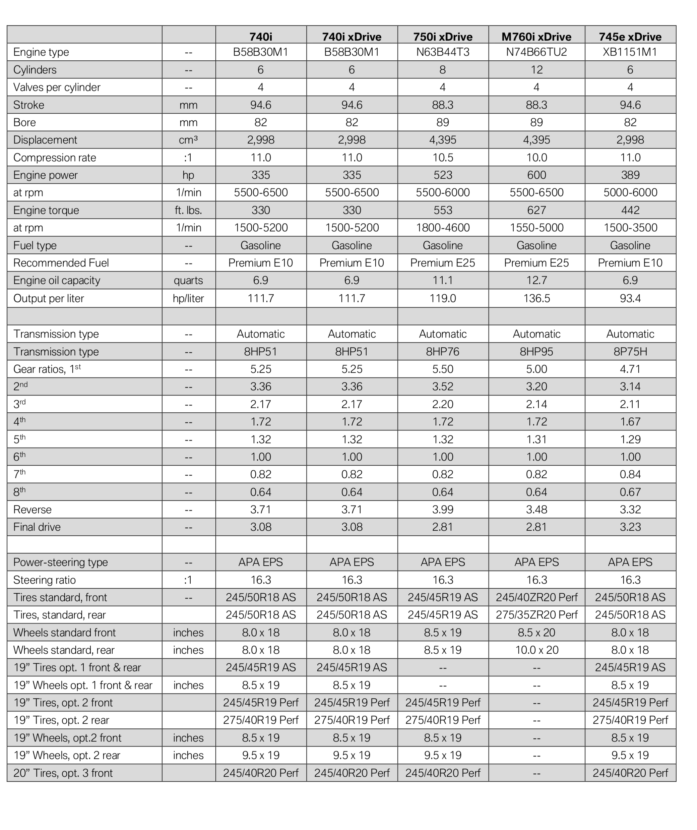 M Sport Package (for 740i, 740i xDrive, 750i xDrive and 745e xDrive) – includes M Sport exhaust(750i xDrive only), a choice of 19 inch or 20 inch wheels and tires, M Sport steering wheel, specific aerodynamics, Shadowline exterior trim, Anthracite headliner, M door sills and foot rest and a choice of interior trim.