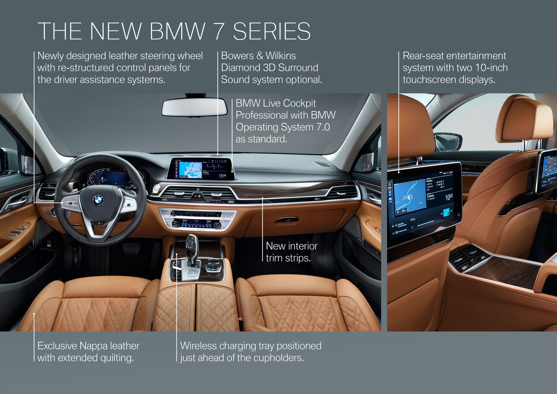 Premium Package (for 740i, 740i xDrive and 745e xDrive) – includes Power rear Sunshade and rear side window shades, Heads-Up display along with a choice of Nappa Leather interiors.