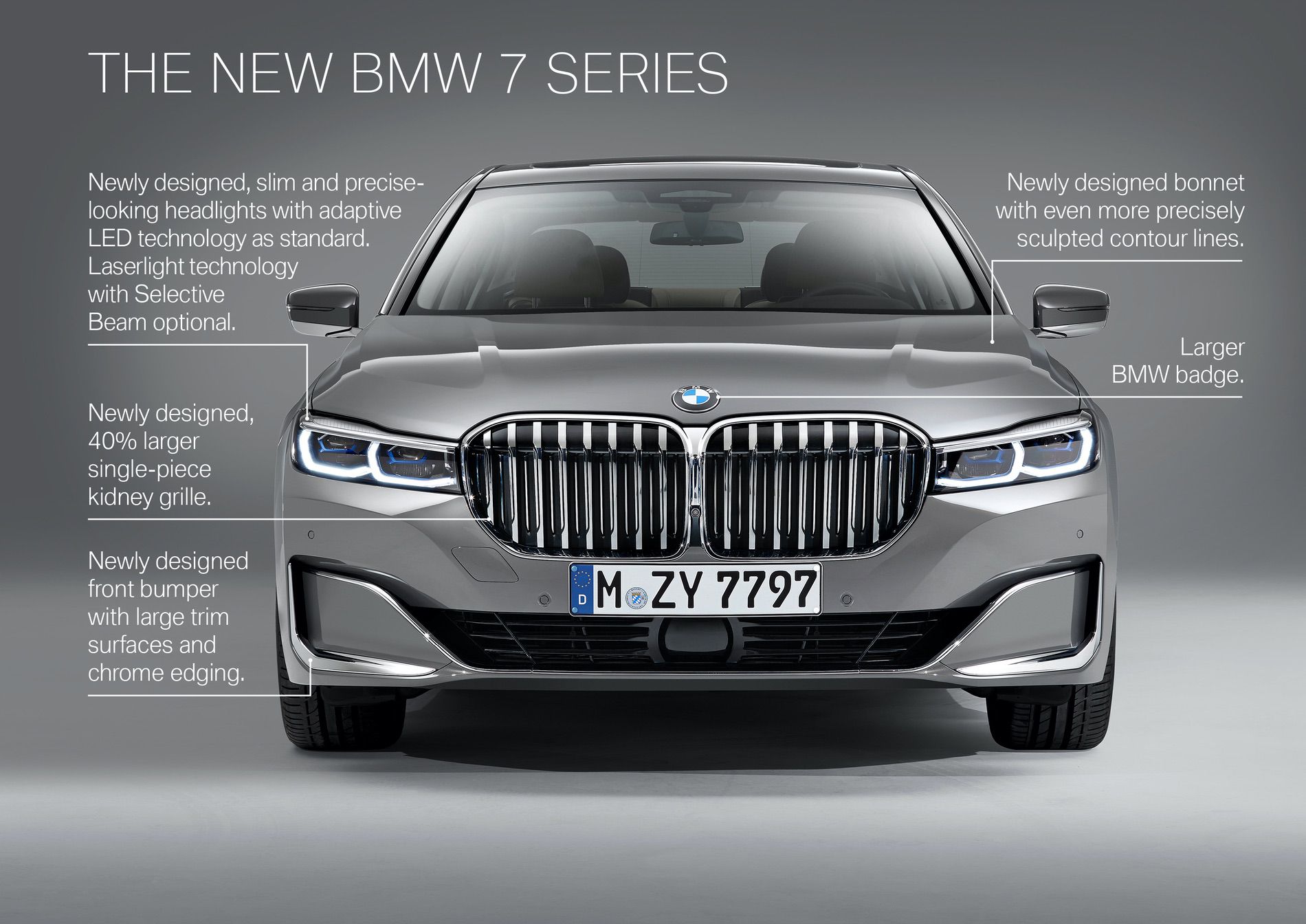 That massive grille design is surrounded by a new single-piece surround, which makes two Kidney Grilles look like one gigantic grille. The grille has actually grown by 40 percent. Protruding outward from those massive nostrils on either side are two slender headlights that look comically small compared to the grilles. Inside those new headlights, a new halo design gives the 7er a fresh look. Laser lights are now available, which is actually really awesome, but full LED lights are as-standard.