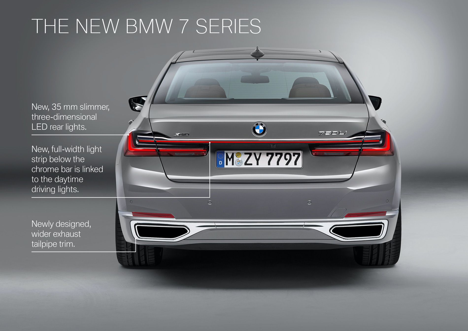 Out back, the Big 7 gets new taillights that look similar to those found on the new 8 Series, which are now connected via a light bar. The LED, three-dimensional rear lights of the new BMW 7 Series are 1.4 inches slimmer than on the outgoing car. The integration of the light bar is actually quite seamless and looks really slick. The integrated exhaust tailpipes have broader chrome surrounds, while the three-dimensional rear lights of the new BMW 7 Series are around 35 millimeters slimmer than on the outgoing car.
