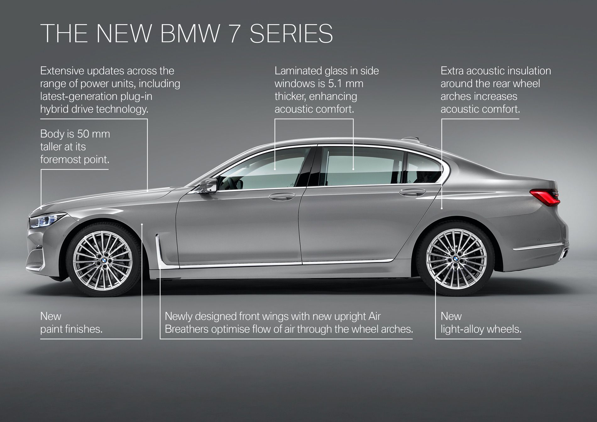 The new BMW 7 Series will again be offered in two body variants, the longer of which translates its extra 14 centimetres of wheelbase into a similar on- board space gain for the rear-seat passengers. The standard 7 Series (5,120 mm) and its long-wheelbase twin (5,260 mm) are both 22 millimetres longer than their respective predecessors. The new model’s width (1,902 mm) and height (1,467 mm / long-wheelbase version: 1,479 mm) remain unchanged. The extensive design refresh at the front end now rises 50 millimeters taller at its foremost point.