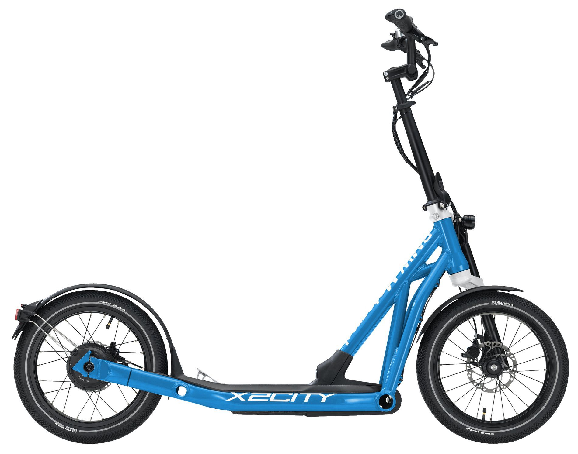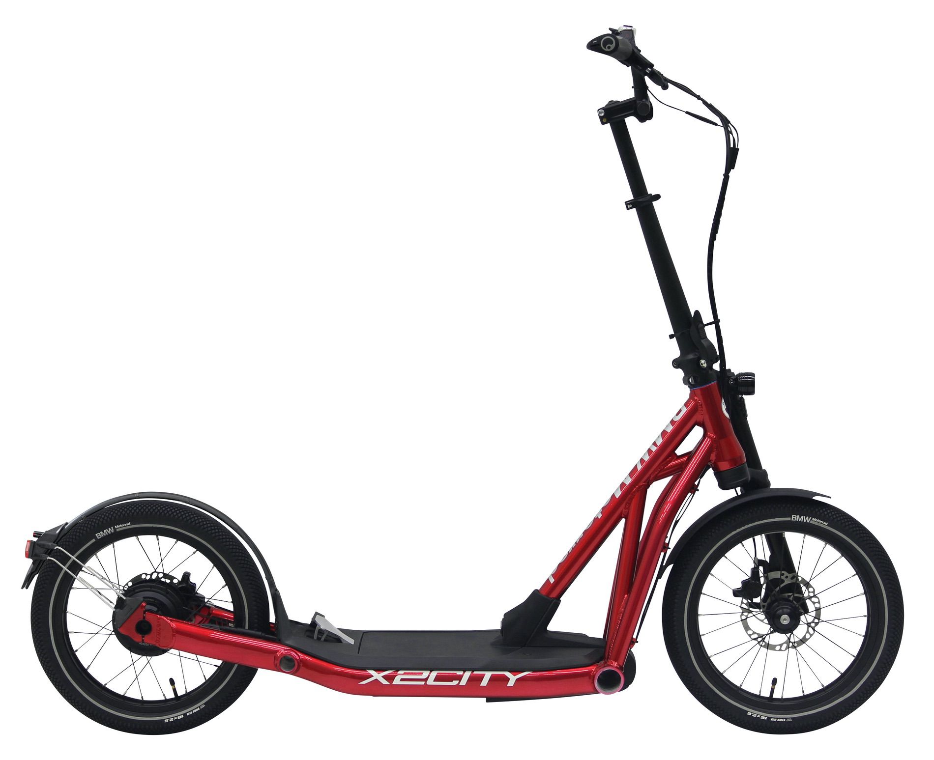 At the heart of the BMW X2City is a small electric motor that lets the scooter whiz through the city at speeds of up to 20 km/h. After the rider has accelerated the scooter to 6 km/h, he can further increase the speed with a pedal. In addition, he can choose on the handlebars the speeds 8, 12, 16, 18 and 20 km/ h.