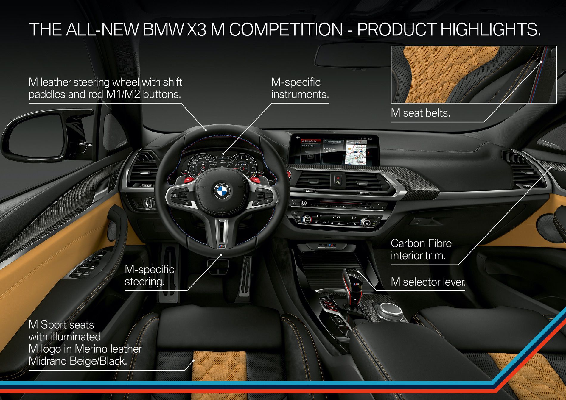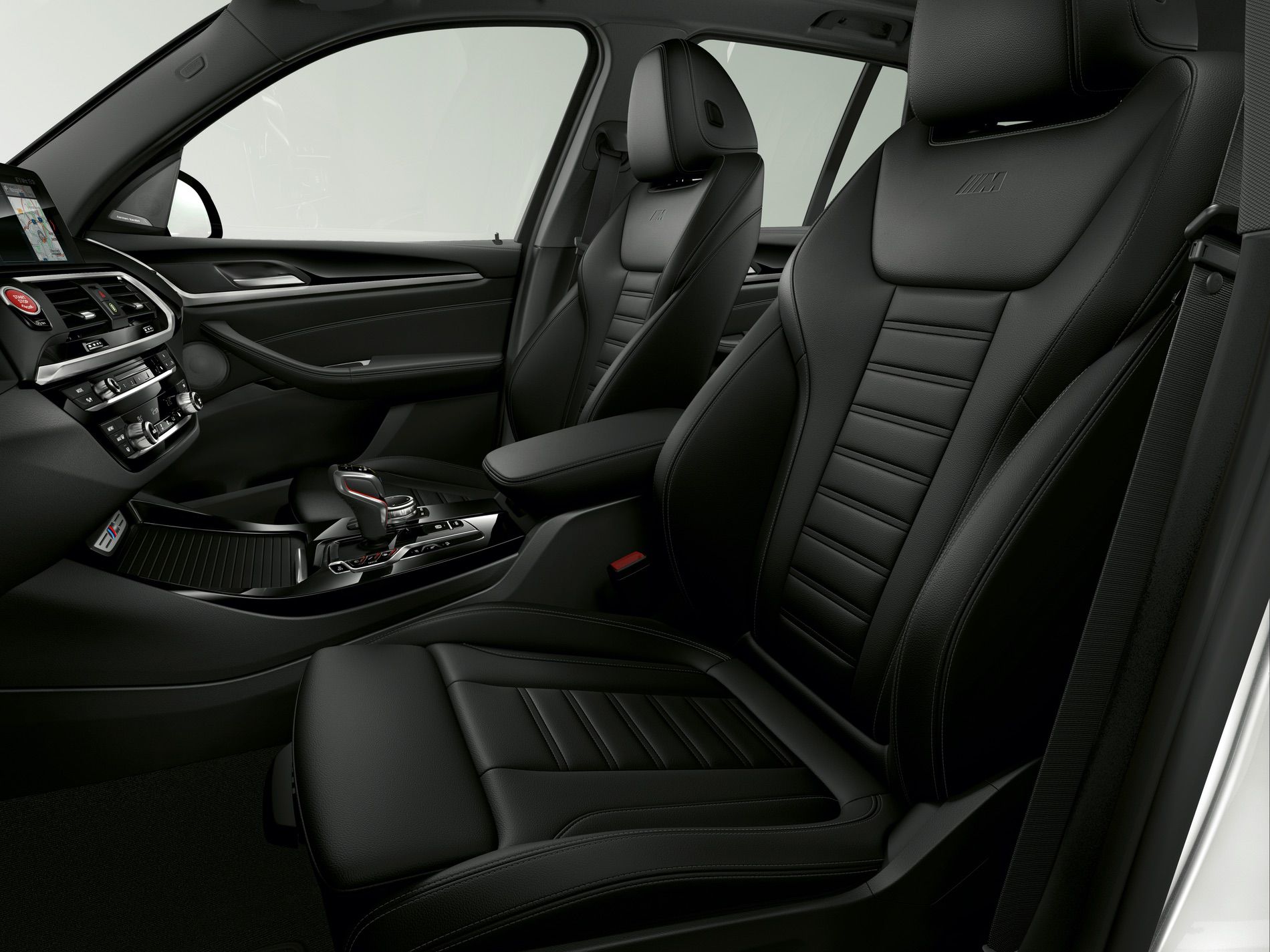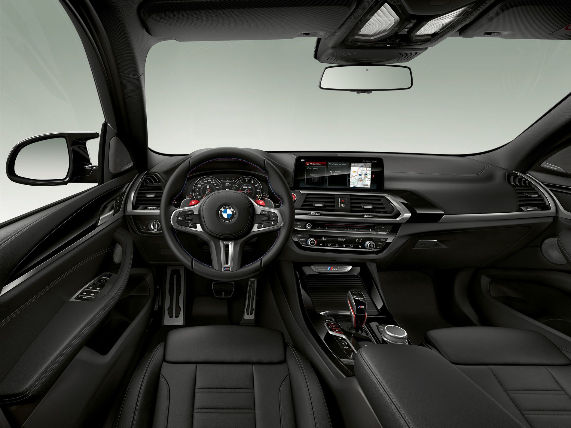 Inside, the interior is very similar to that of the F90 BMW M5. So it gets the same shift lever as the M5, the same steering wheel with its little red “M1” and “M2” switches, the same digital gauges and similar seats. That’s not bad thing, though, as it looks great and we expect the quality to be as excellent as it is on the standard X3.