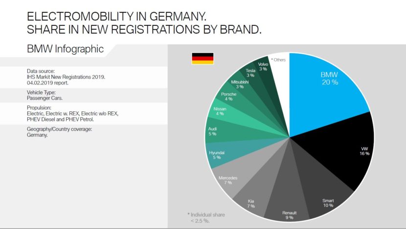 In Germany, at the very least, BMW is the best selling brand of electrified cars since January 1st. The data compiled in Munich shows that BMW accounts for 20 percent of the market, whereas last year it stood at 19 percent. Volkswagen, on the other hand, lost 1 percent, dropping from 17 percent in November last year to 16 percent in February 2019. Third place goes to Smart, unsurprisingly so, as the Daimler-owned company offers a really cheap EV choice for interested customers.