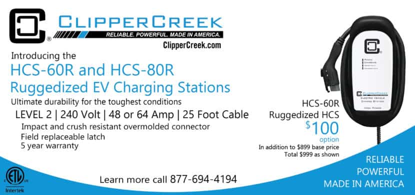 The HCS-60 and HCS-80, two of ClipperCreek’s highest-powered Level 2 electric vehicle charging stations, are now available in “Ruggedized” configurations. The HCS-60R and HCS-80R feature rubber overmolded SAE-J1772TM connectors for added impact and crush resistance, field-replaceable connector latches, and are backed by five year warranties. These high-power, ruggedized charging stations offer reliable and affordable high-power level 2 charging solutions designed specifically for heavy utilization fleets, public parking lots, and extreme weather locations. The ruggedized option is offered at an excellent value of $100 in addition to the base price of $899 for the HCS-60 and $969 for the HCS-80.