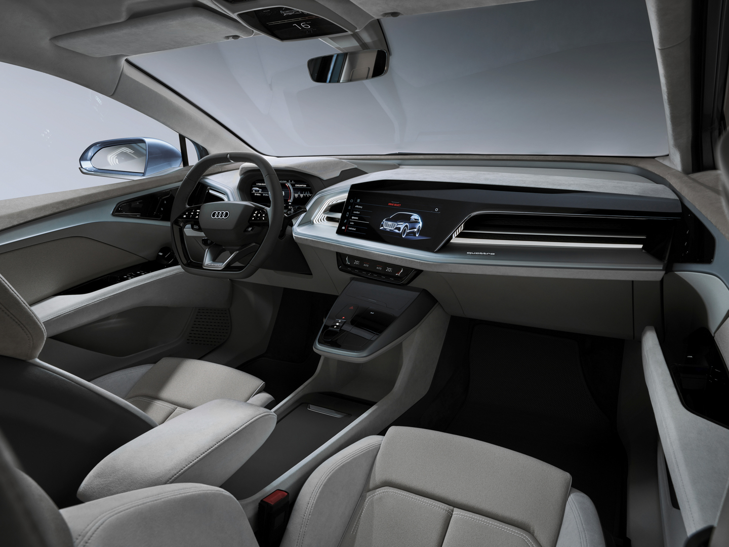 Sending power to the wheels will be two electric motors, one at each axle. The rear axle motor will make 201 hp and 228 lb-ft of torque, while the front axle gets 100 hp and 110 lb-ft. Combined, they make 301 hp and 339 lb-ft of torque. According to Audi, the Q4 e-tron will get from 0-60 mph in 6.3 seconds. That’s not rocket-ship fast.